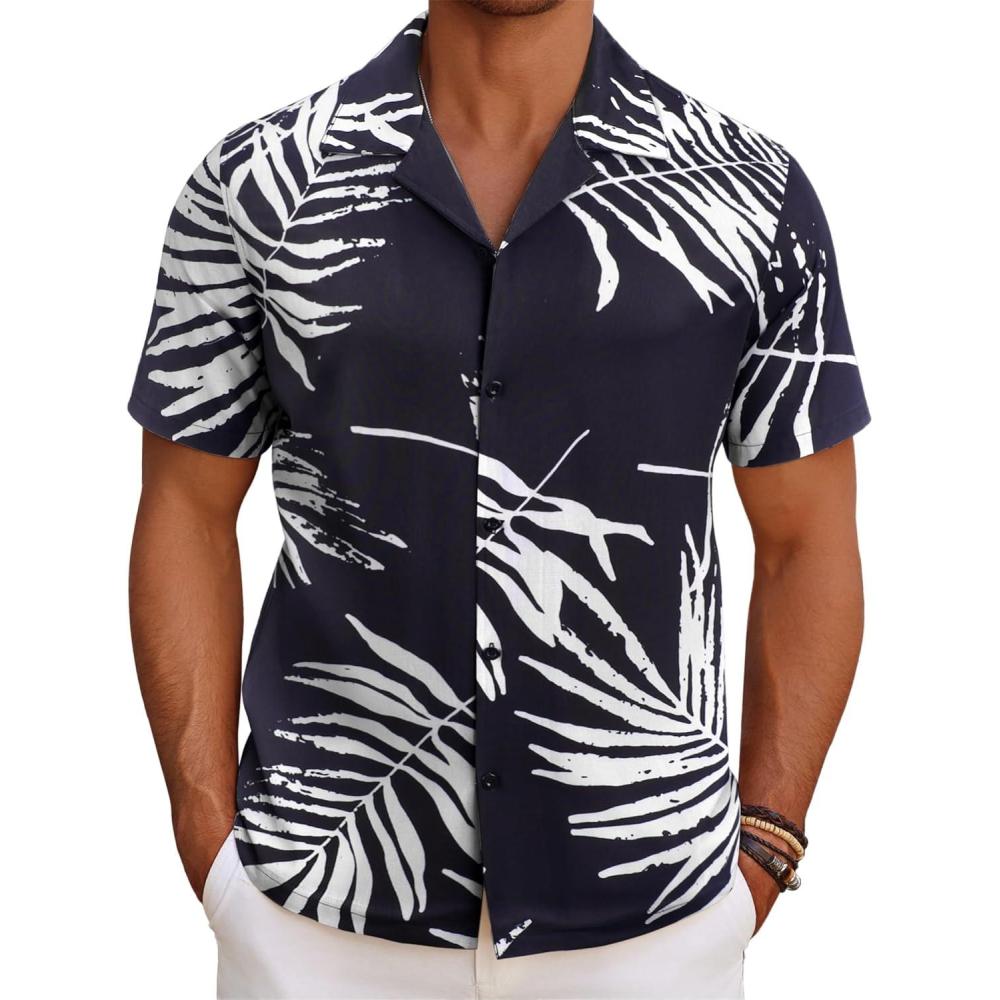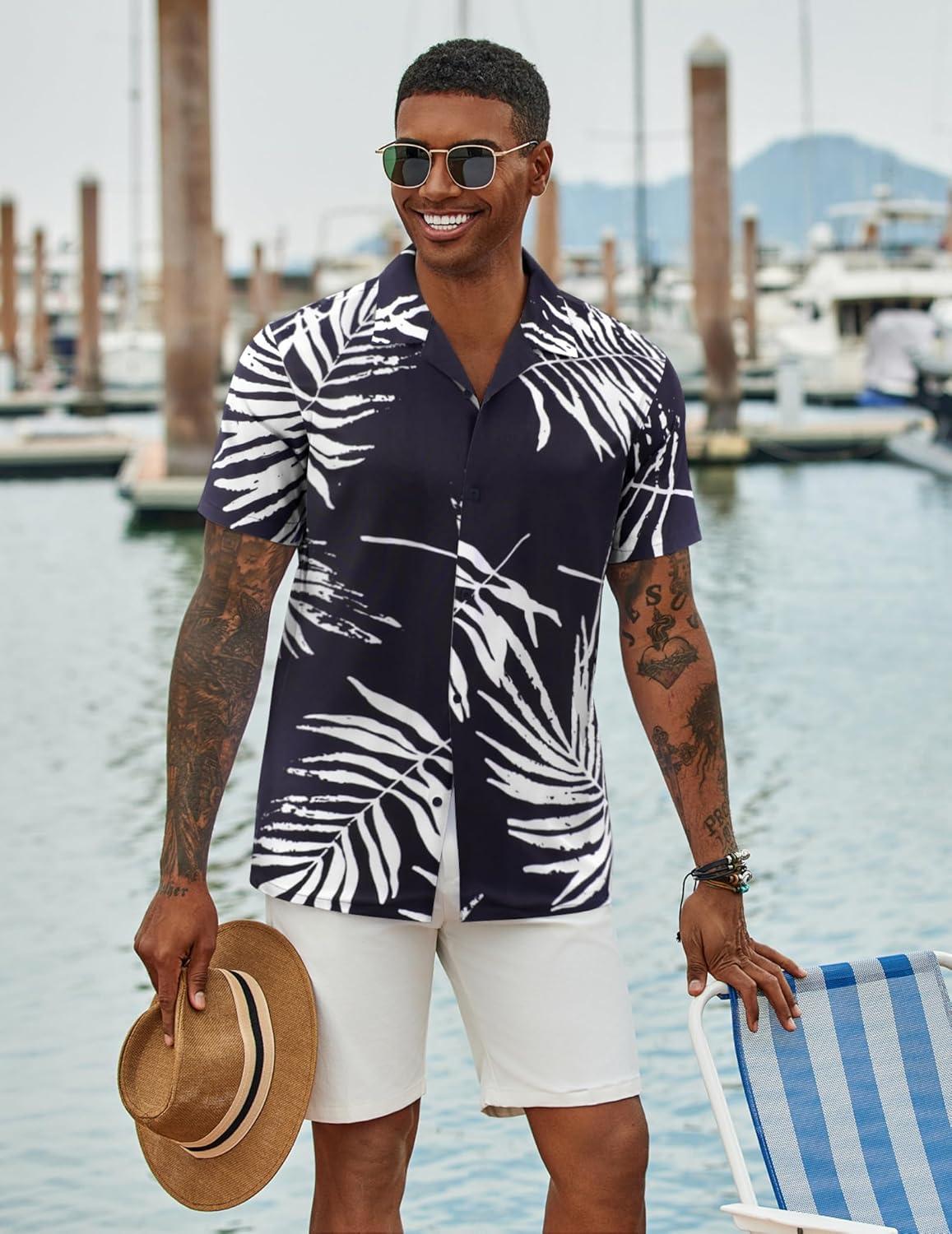 COOFANDY Mens Hawaiian Short Sleeve Shirt Casual Button Down Summer Beach Vacation Shirt Tropical Floral Aloha Shirts(White Palm Leaf-blue)