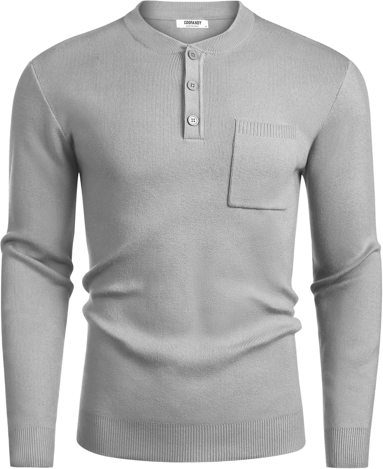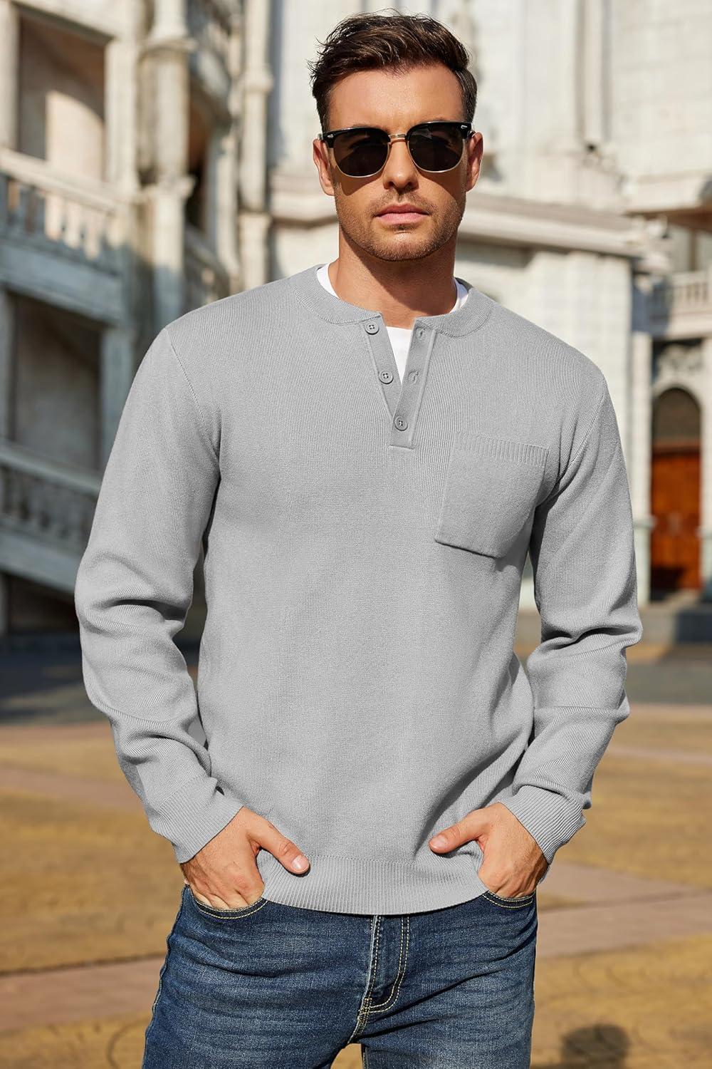 COOFANDY Men’s Henley Knit Sweater Long Sleeve Mid-Weight Soft Pullover Shirt with Chest Pocket(Light Grey)