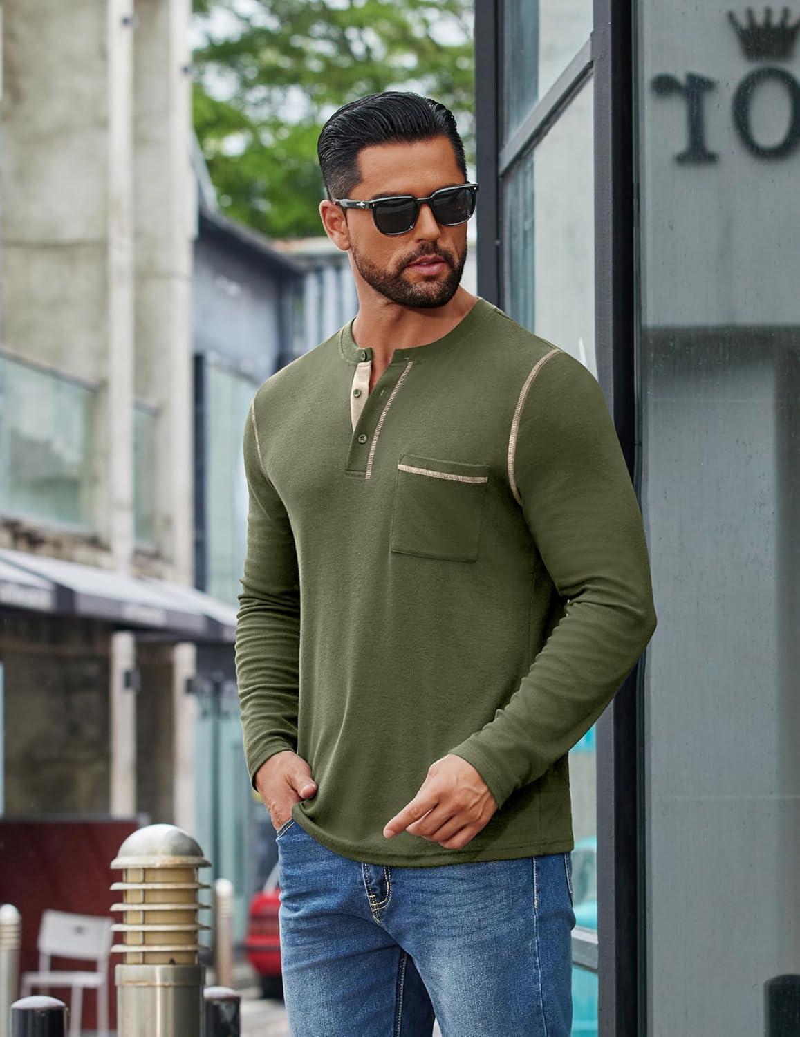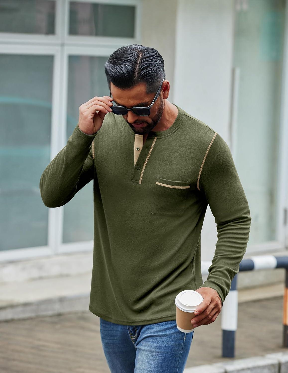 COOFANDY Men's Henley Long Sleeve Shirts Casual Button T-Shirt Pullover Basic Tees with Pocket(Army Green)