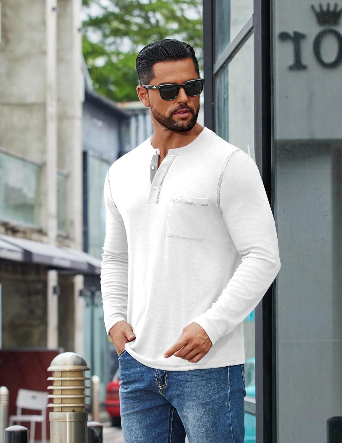 COOFANDY Men's Henley Long Sleeve Shirts Casual Button T-Shirt Pullover Basic Tees with Pocket(White)