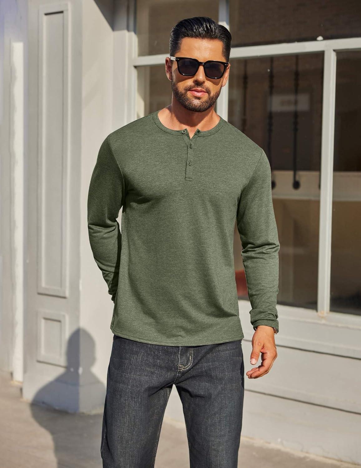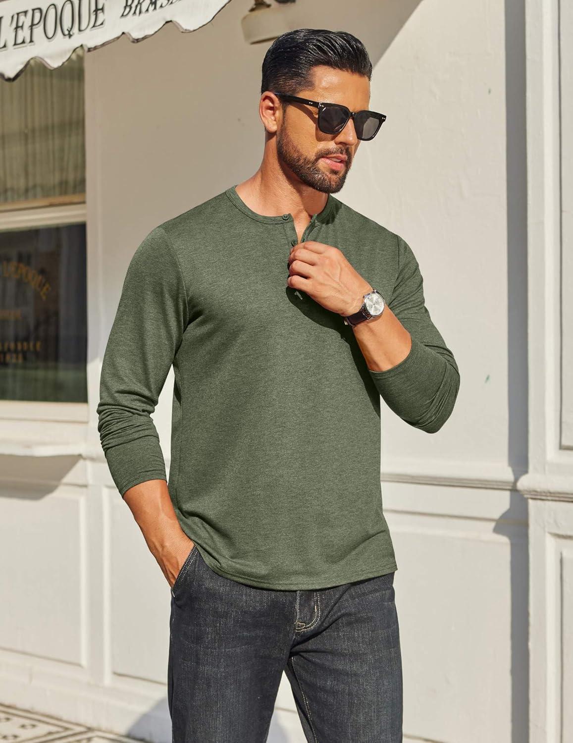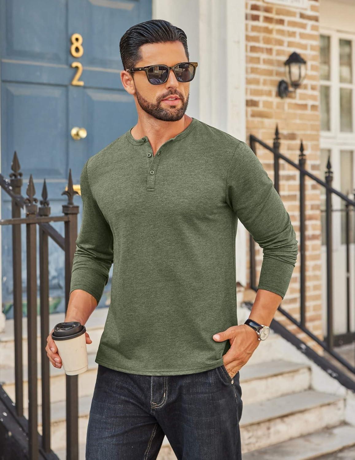 COOFANDY Mens Henley Shirt Long Sleeve Casual Stretch Solid T-Shirts Fashion Pullover Lightweight Fall Tops(Army Green)