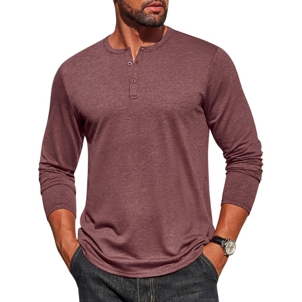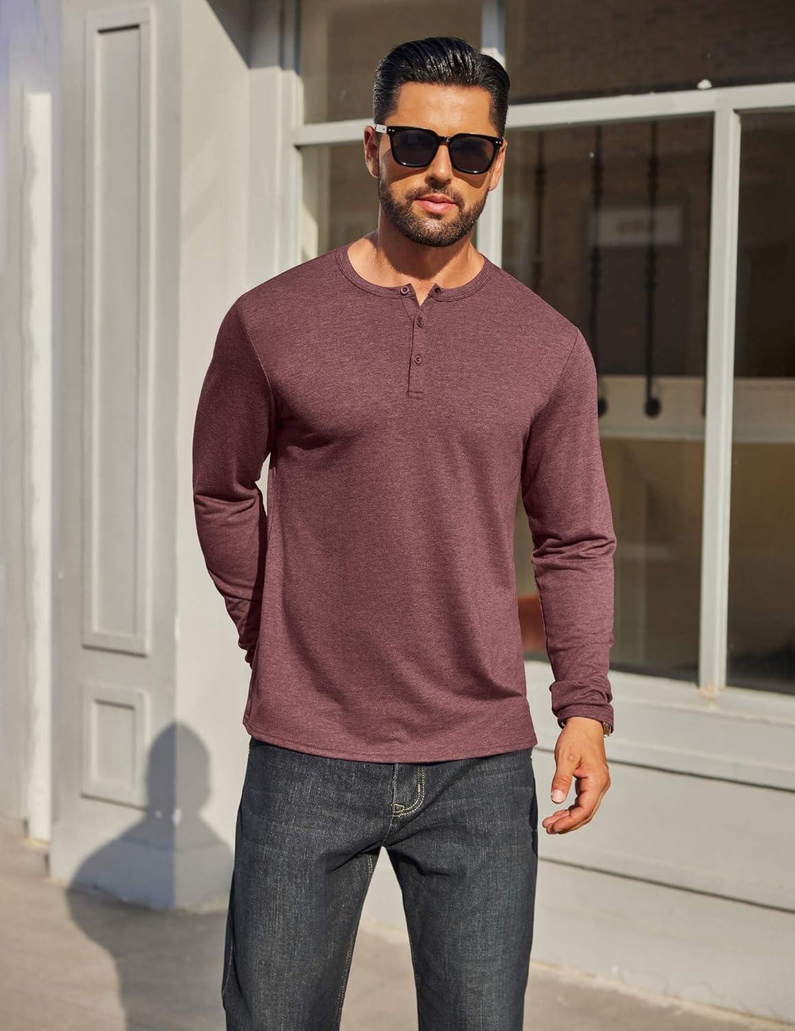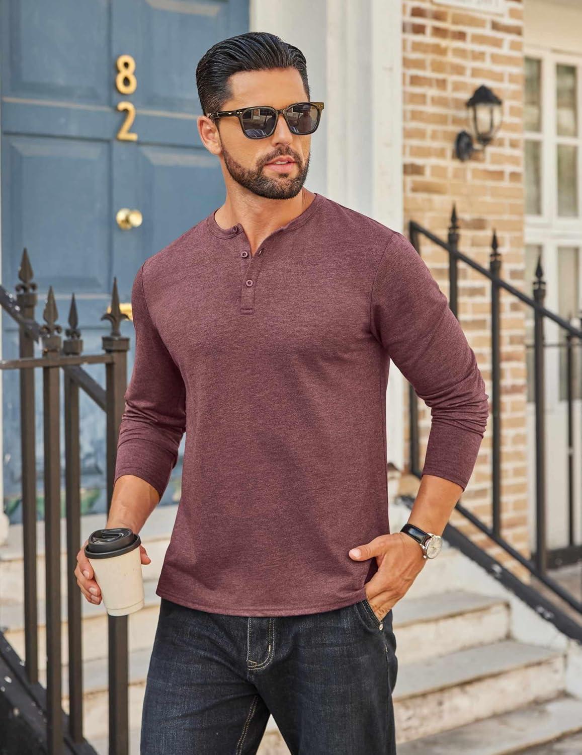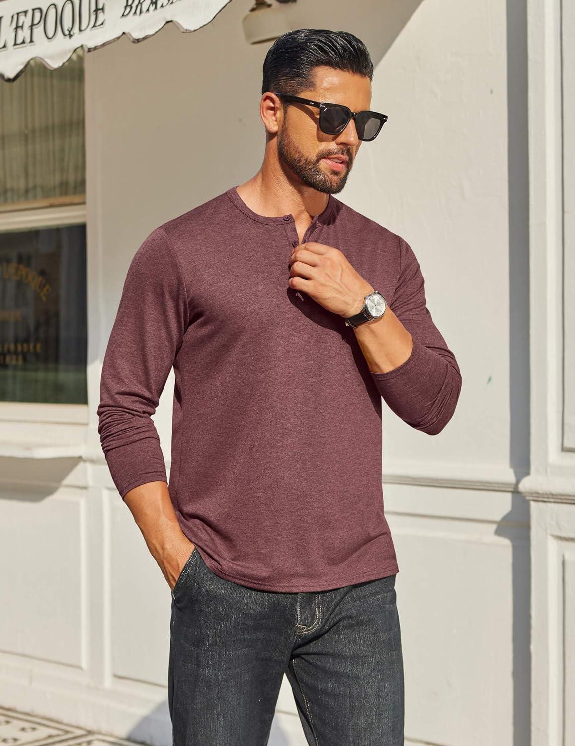 COOFANDY Mens Henley Shirt Long Sleeve Casual Stretch Solid T-Shirts Fashion Pullover Lightweight Fall Tops(Dark Red)