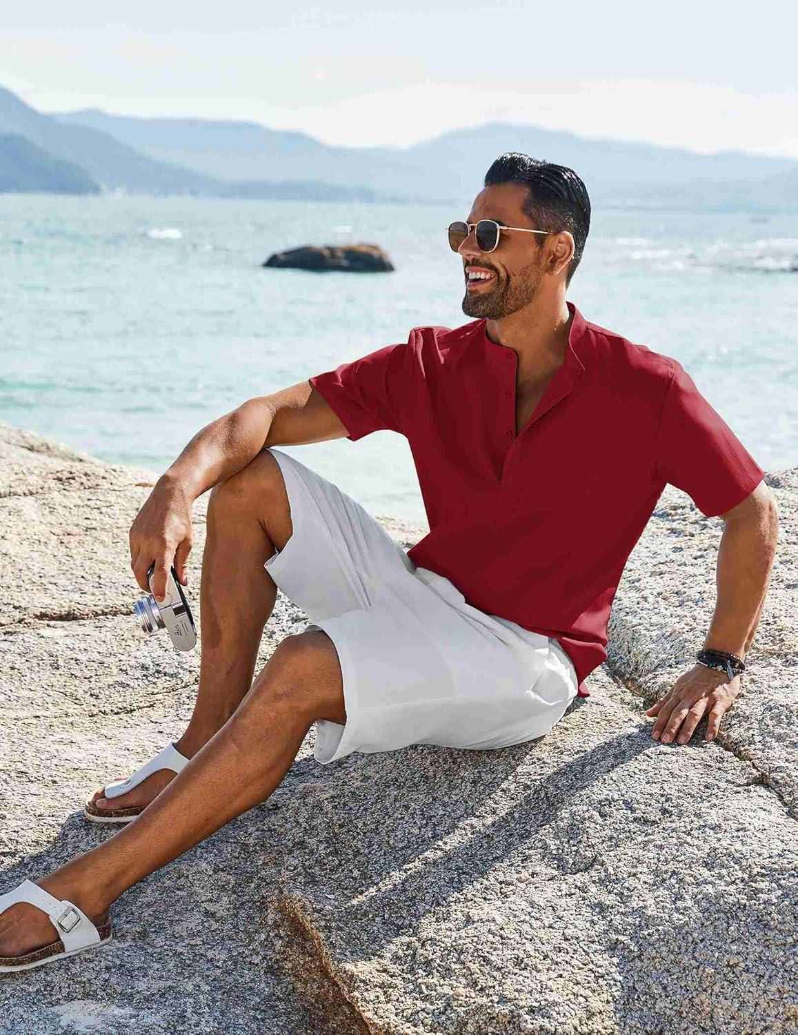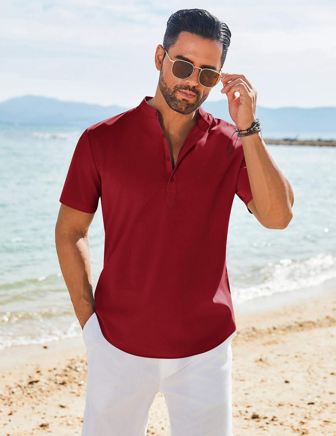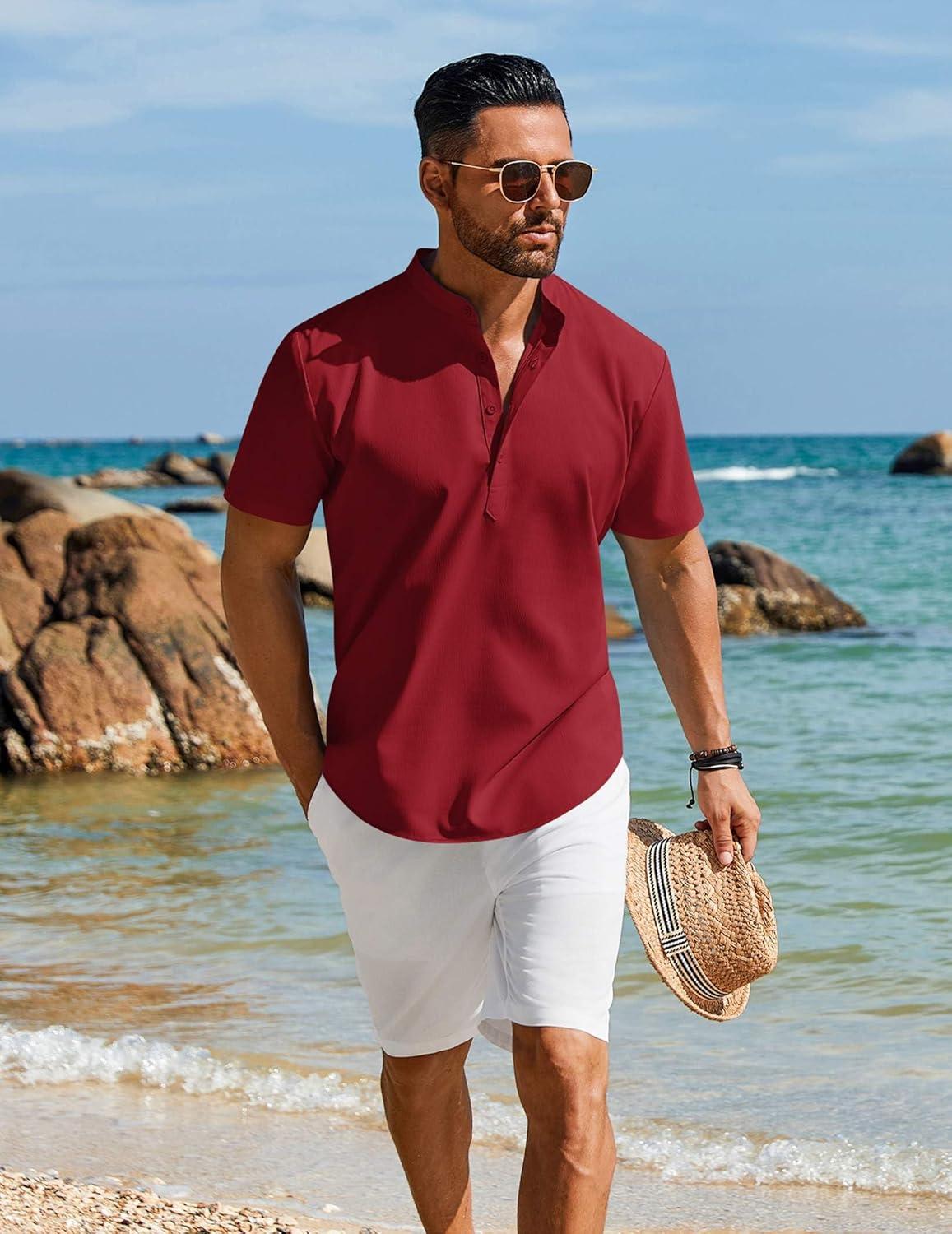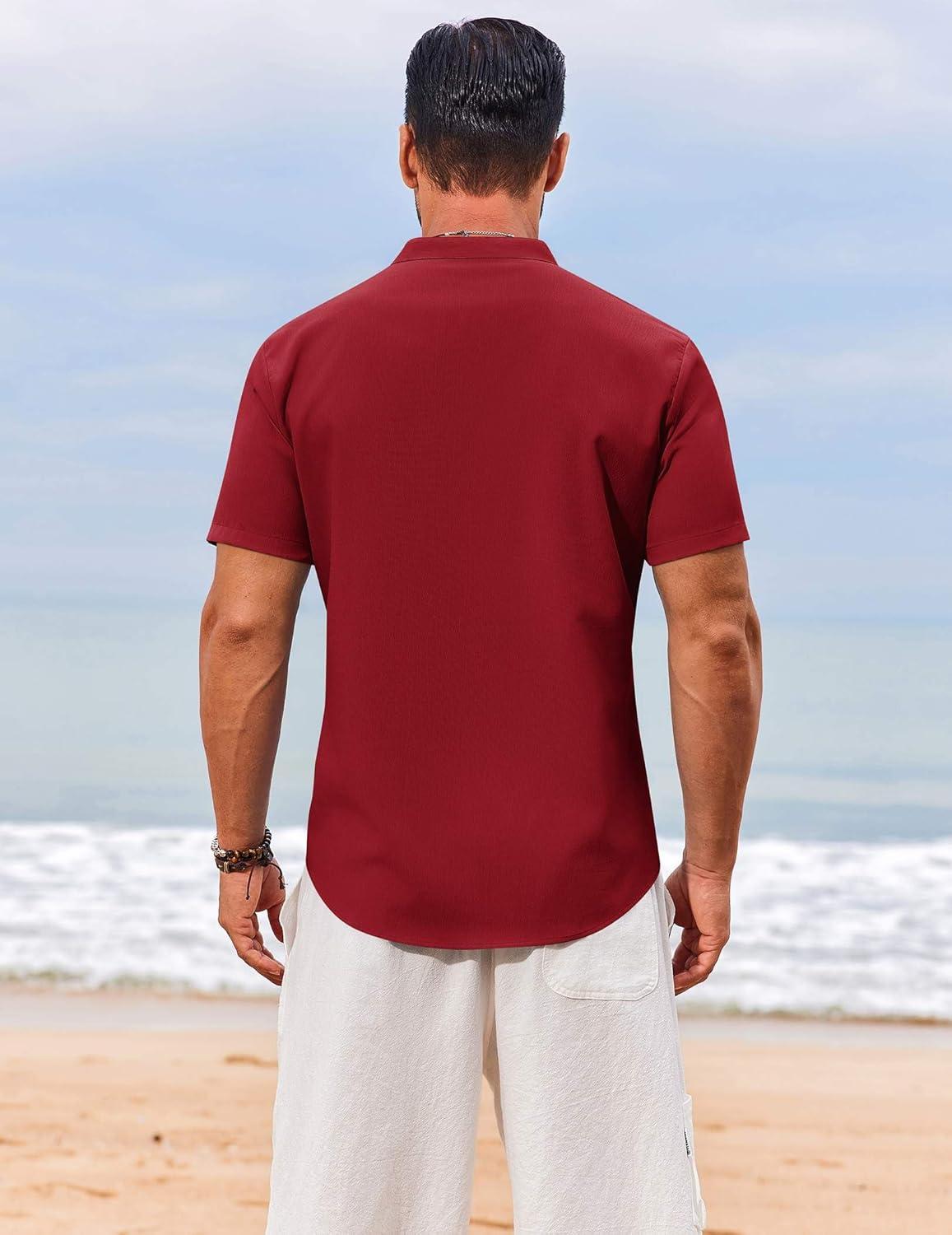 COOFANDY Men’s Henley Shirt Short Sleeve Casual T-Shirt Summer Beach Hippie Henley Tee Shirt(Wine Red)