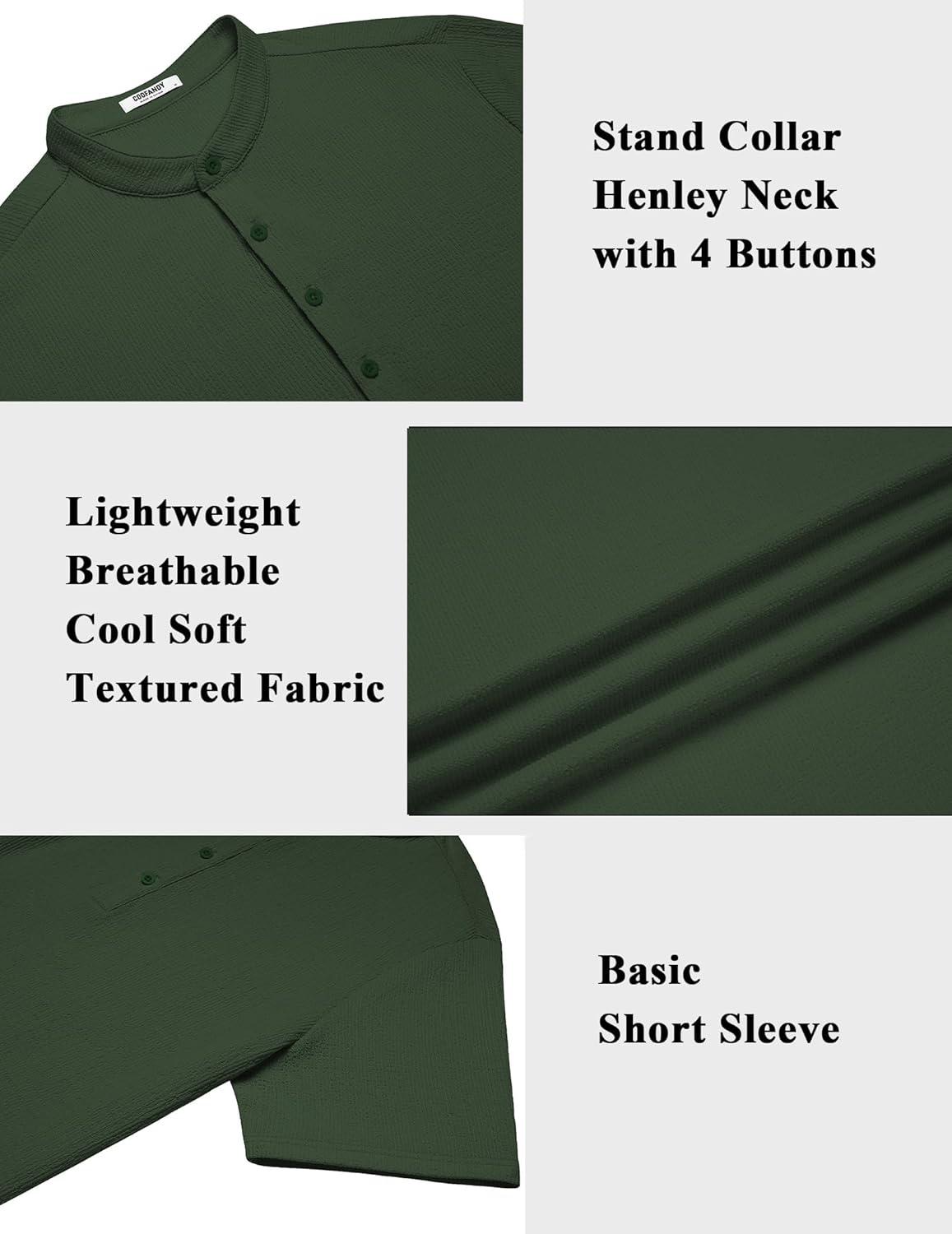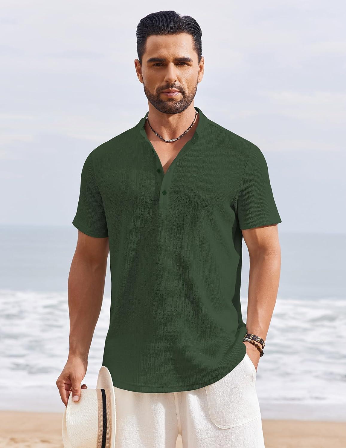 COOFANDY Men's Henley Shirt Short Sleeve Stand Collar Summer Casual Beach Hippie T-Shirts(Army Green)