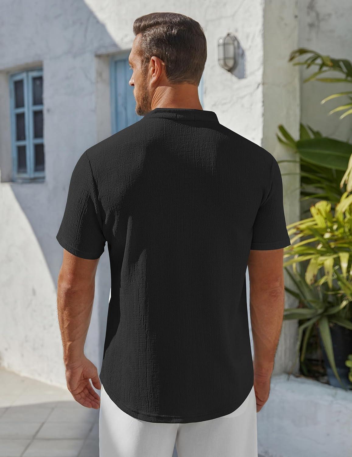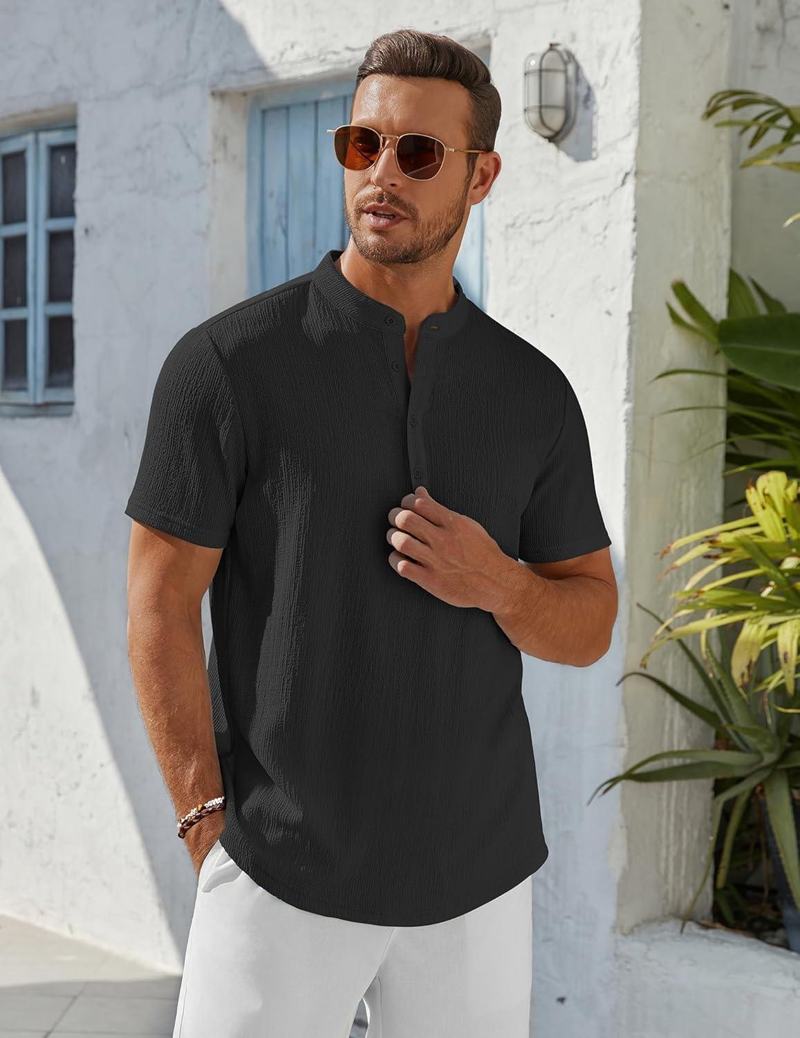 COOFANDY Men's Henley Shirt Short Sleeve Stand Collar Summer Casual Beach Hippie T-Shirts(Black)