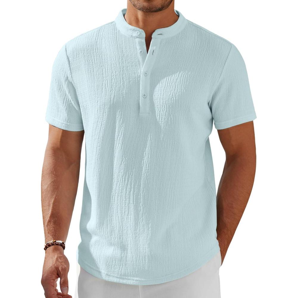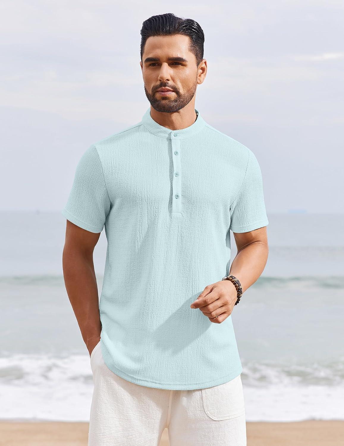 COOFANDY Men’s Henley Shirt Short Sleeve Stand Collar Summer Casual Beach Hippie T-Shirts(Light Blue)