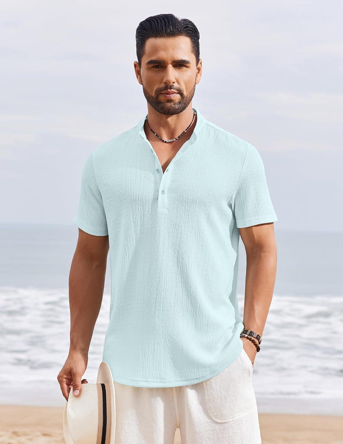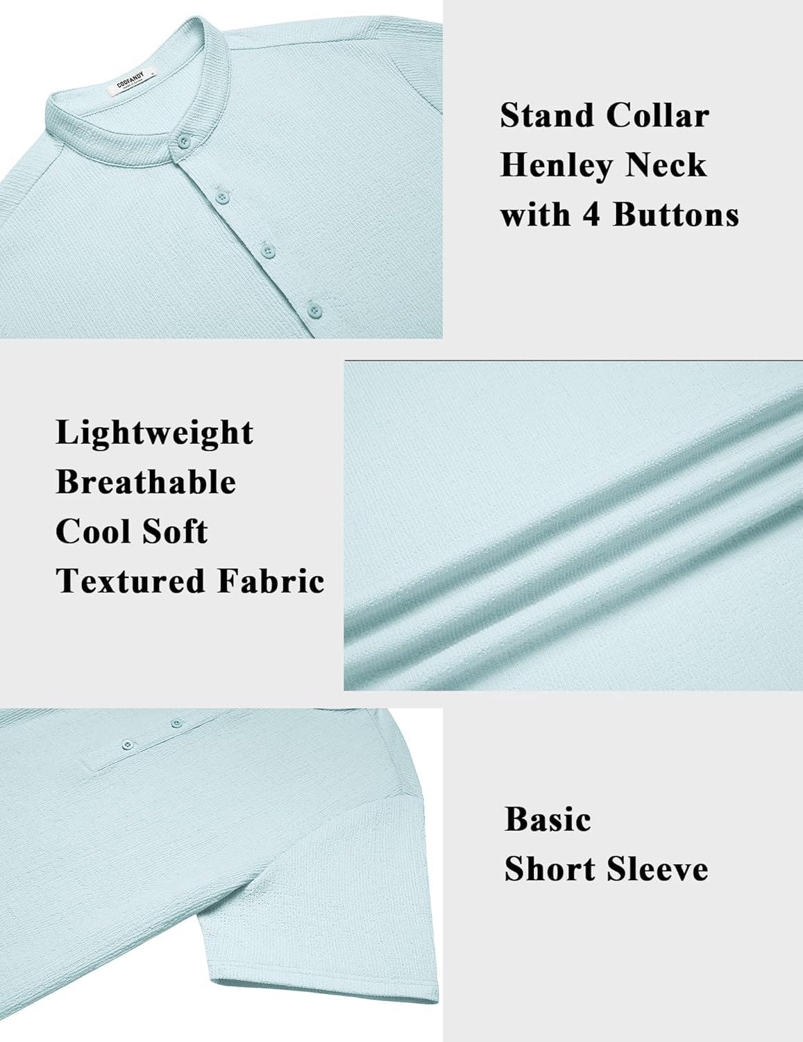 COOFANDY Men's Henley Shirt Short Sleeve Stand Collar Summer Casual Beach Hippie T-Shirts(Light Blue)