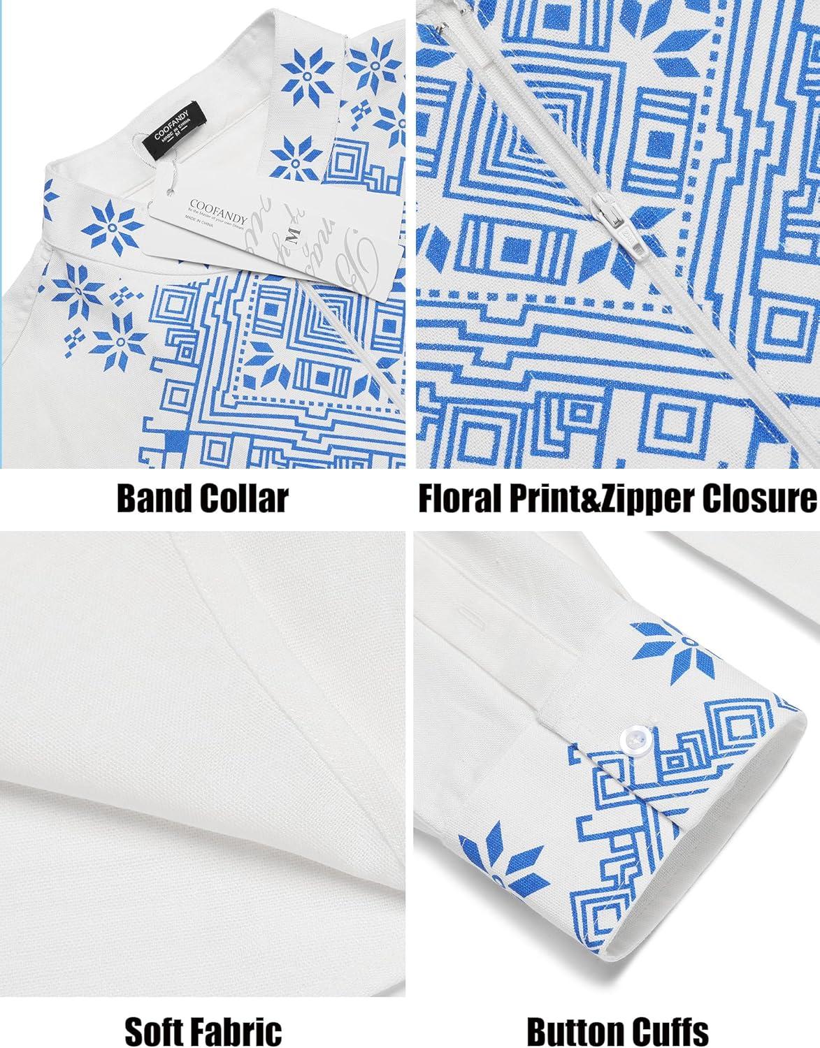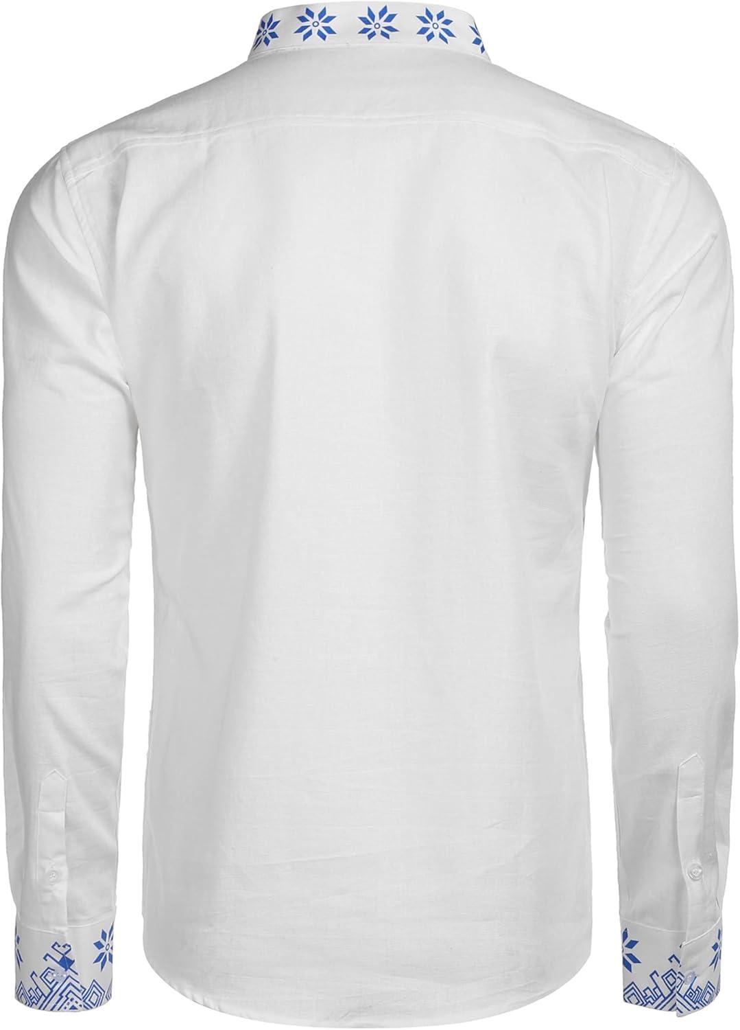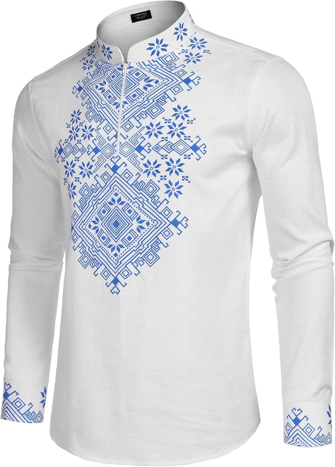 COOFANDY Men's Henley Shirt Vyshyvanka Long Sleeve African Print Shirts Casual Zip Up Cotton Linen Beach Hippie Shirt(01white)