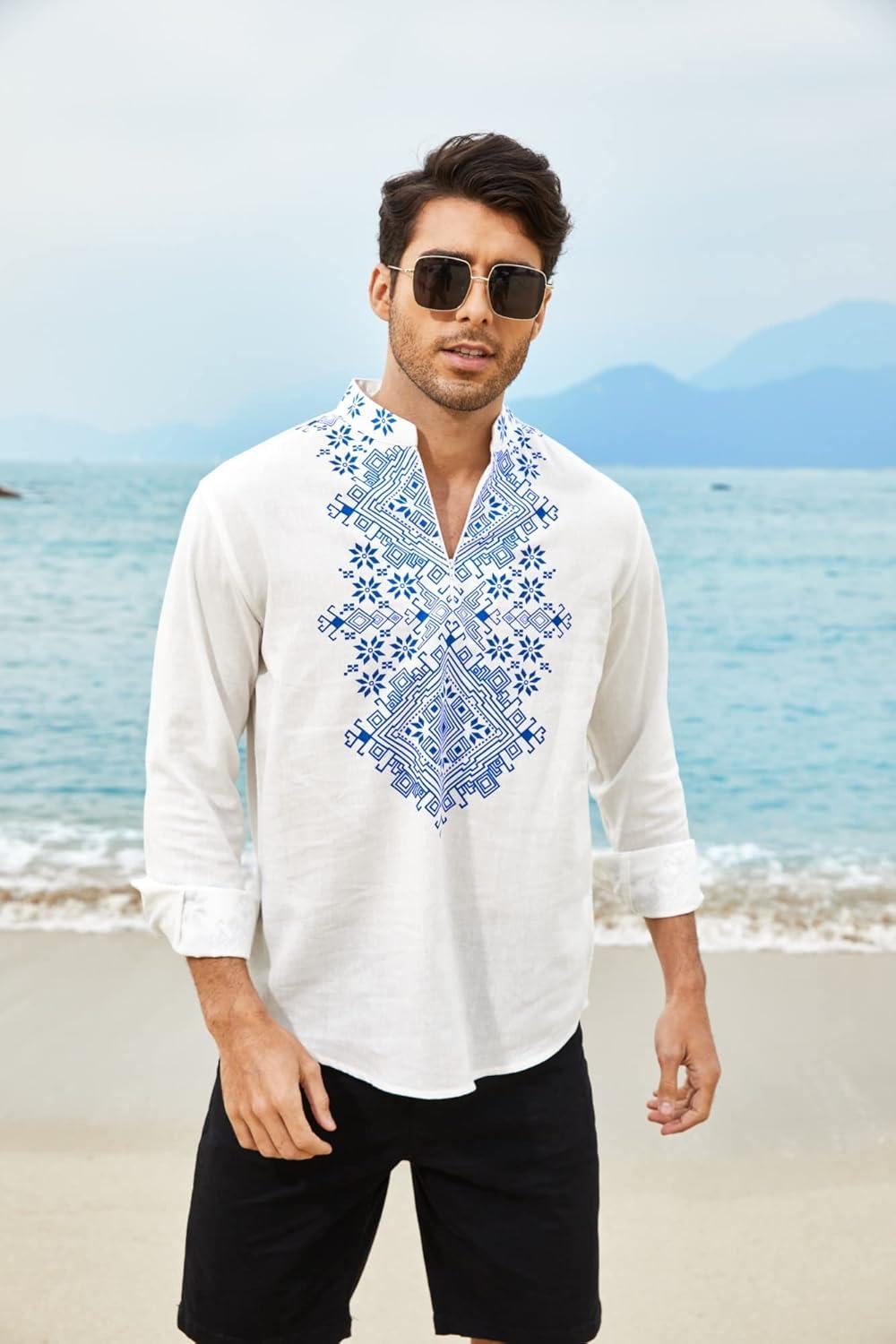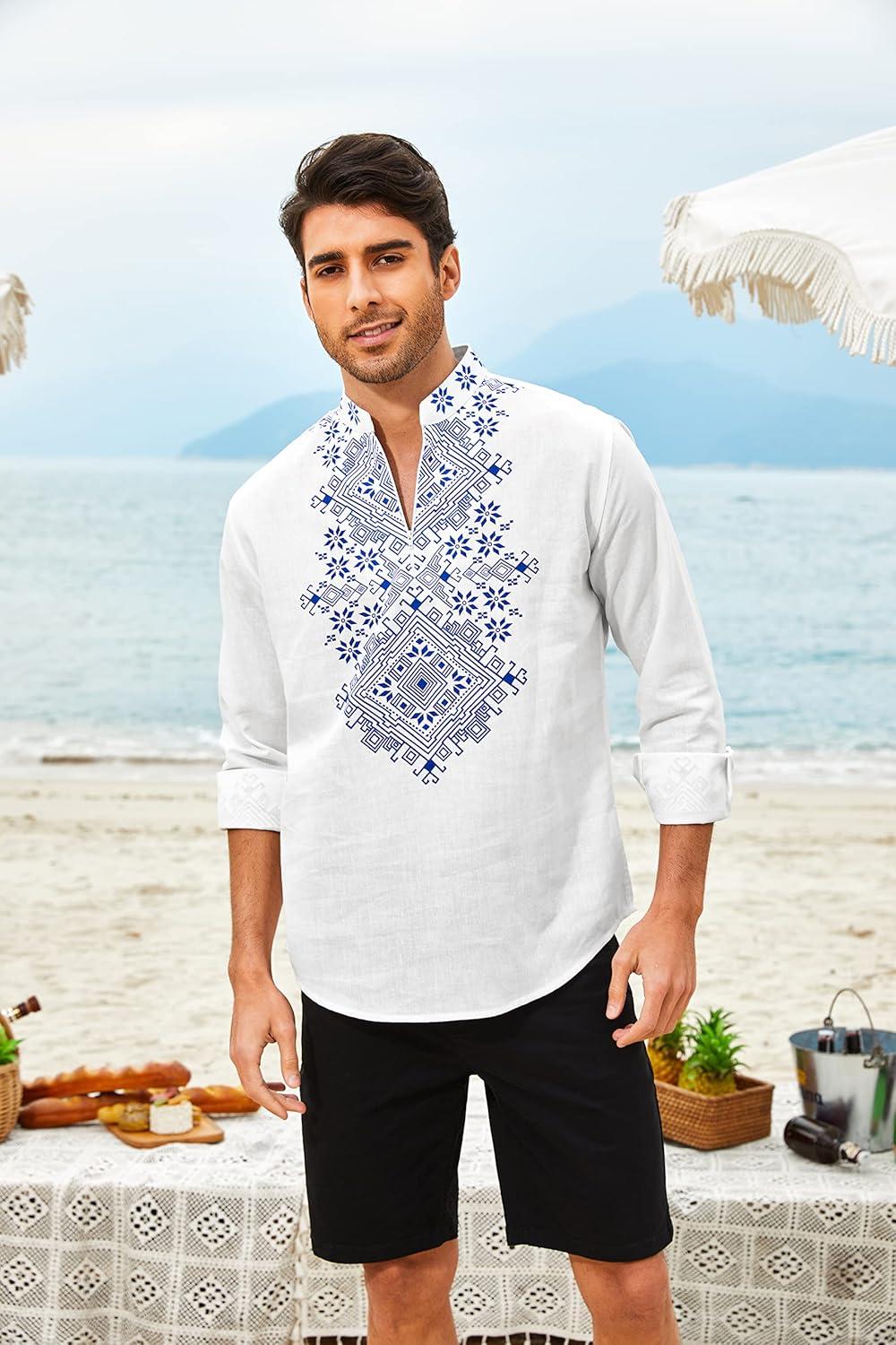 COOFANDY Men’s Henley Shirt Vyshyvanka Long Sleeve African Print Shirts Casual Zip Up Cotton Linen Beach Hippie Shirt(01white)
