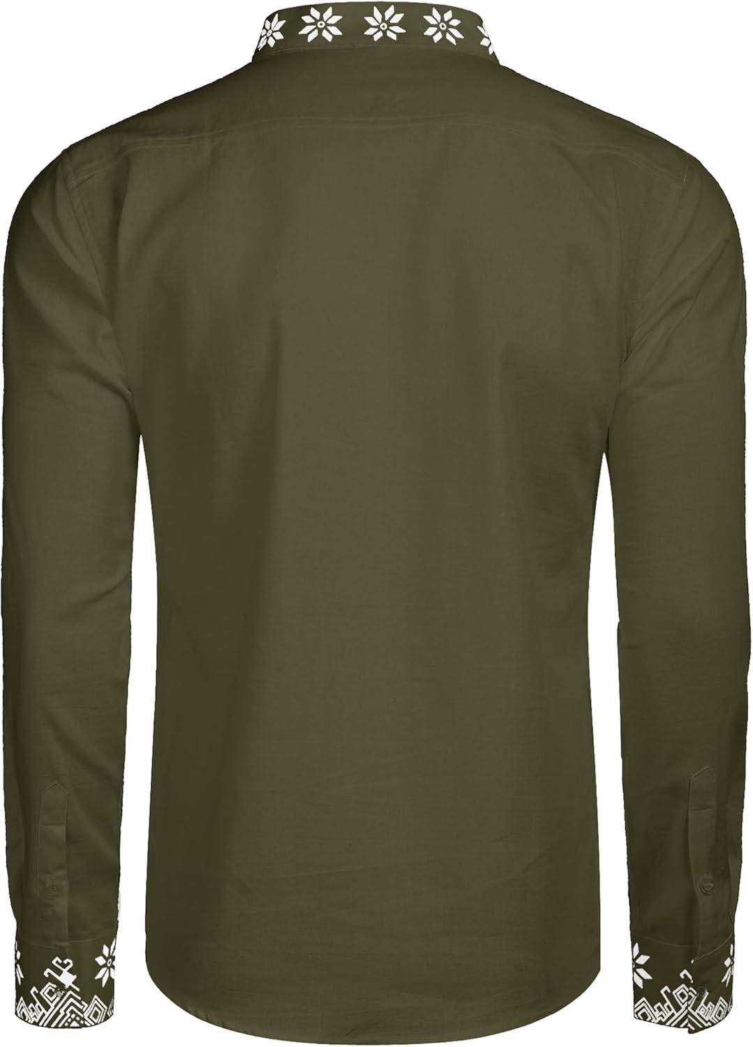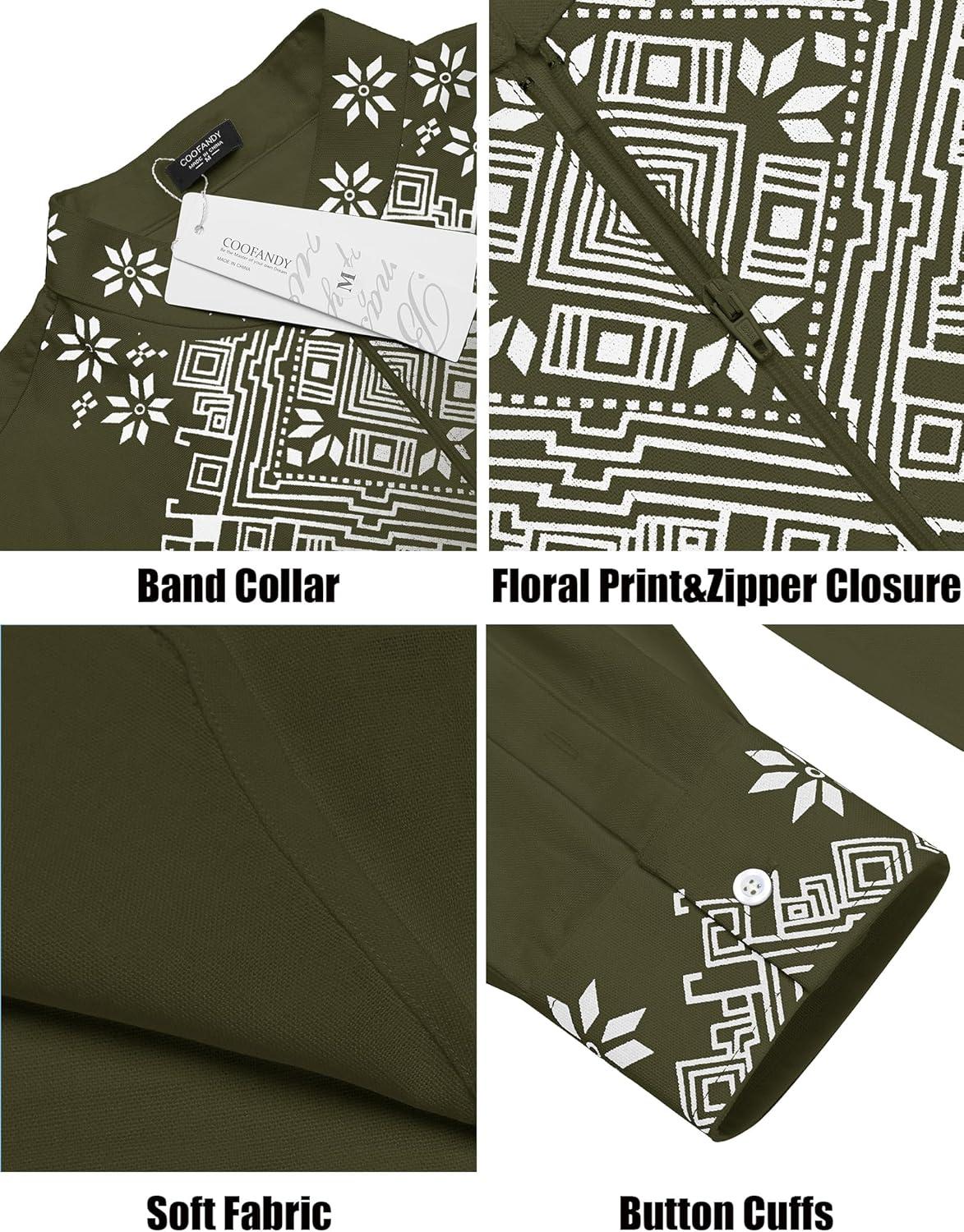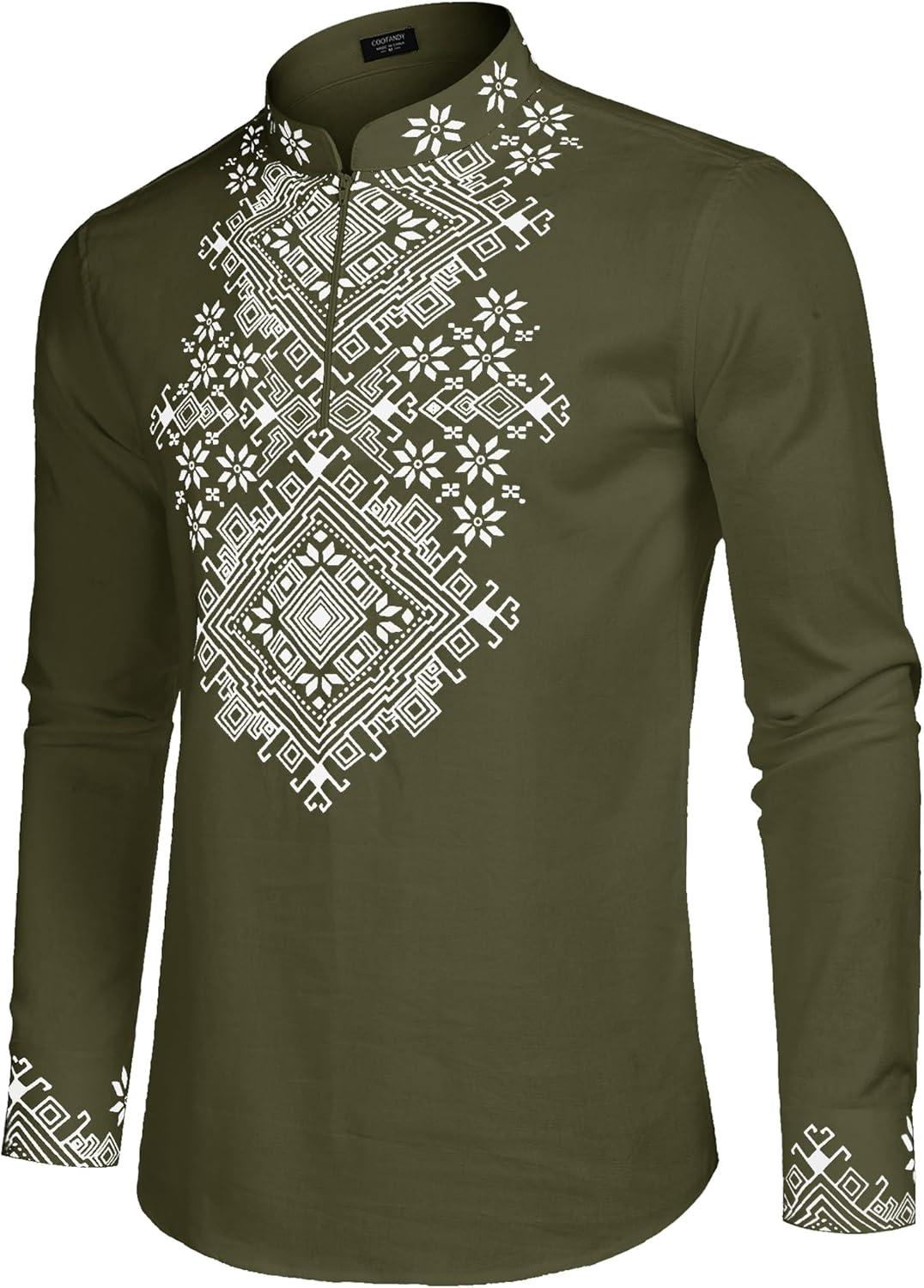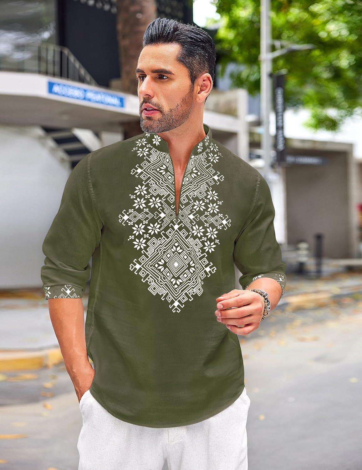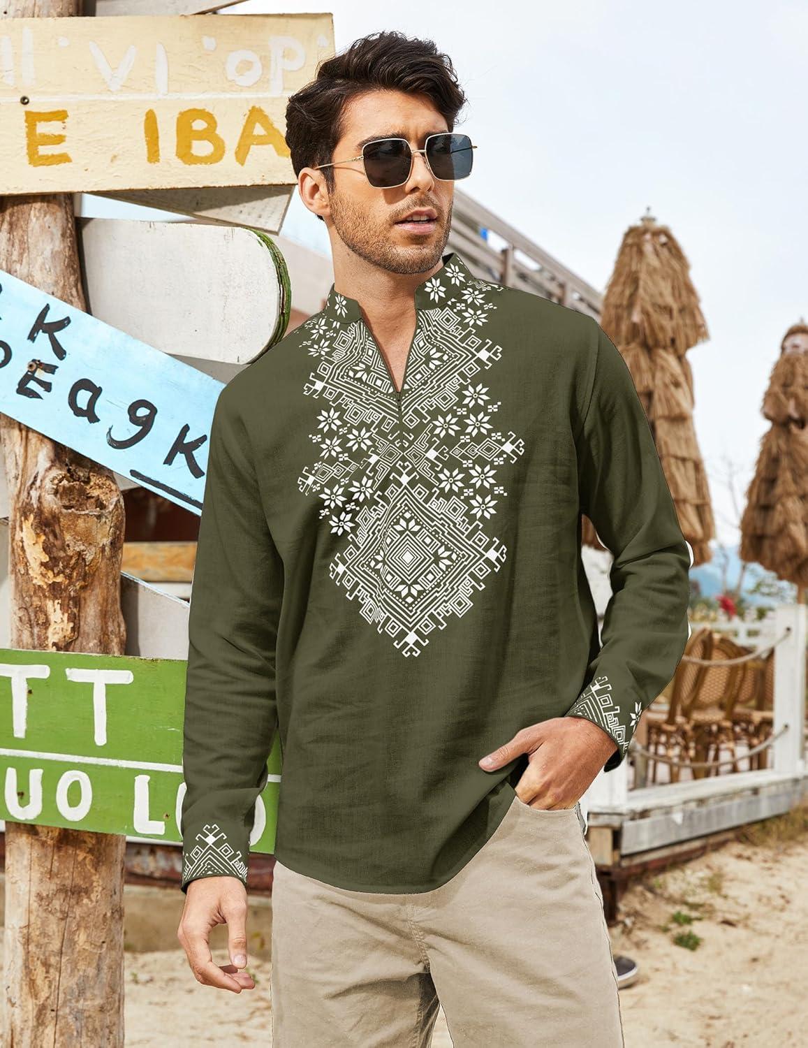 COOFANDY Men's Henley Shirt Vyshyvanka Long Sleeve African Print Shirts Casual Zip Up Cotton Linen Beach Hippie Shirt(Army Green)