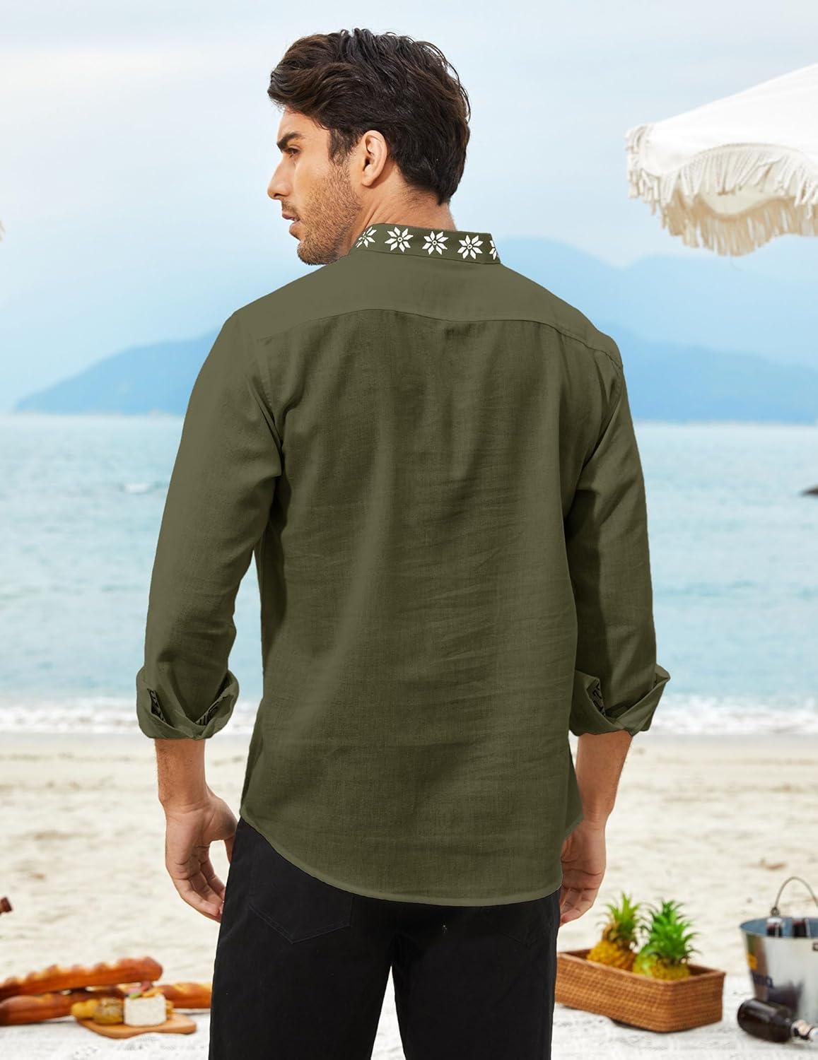COOFANDY Men’s Henley Shirt Vyshyvanka Long Sleeve African Print Shirts Casual Zip Up Cotton Linen Beach Hippie Shirt(Army Green)