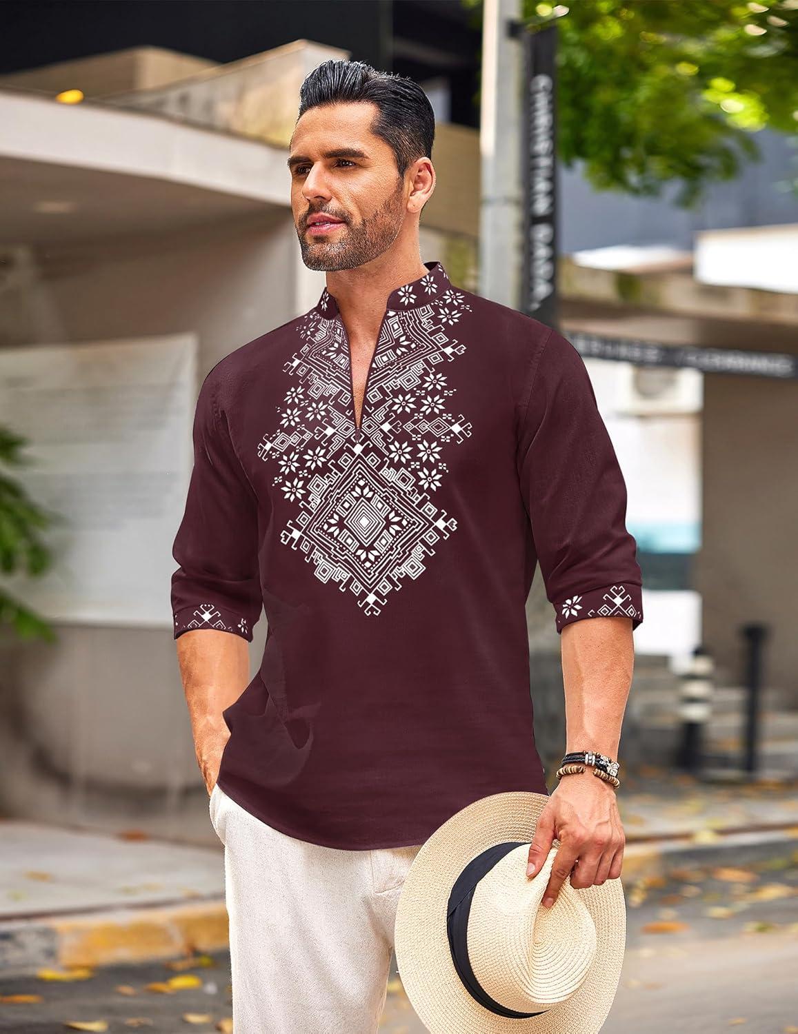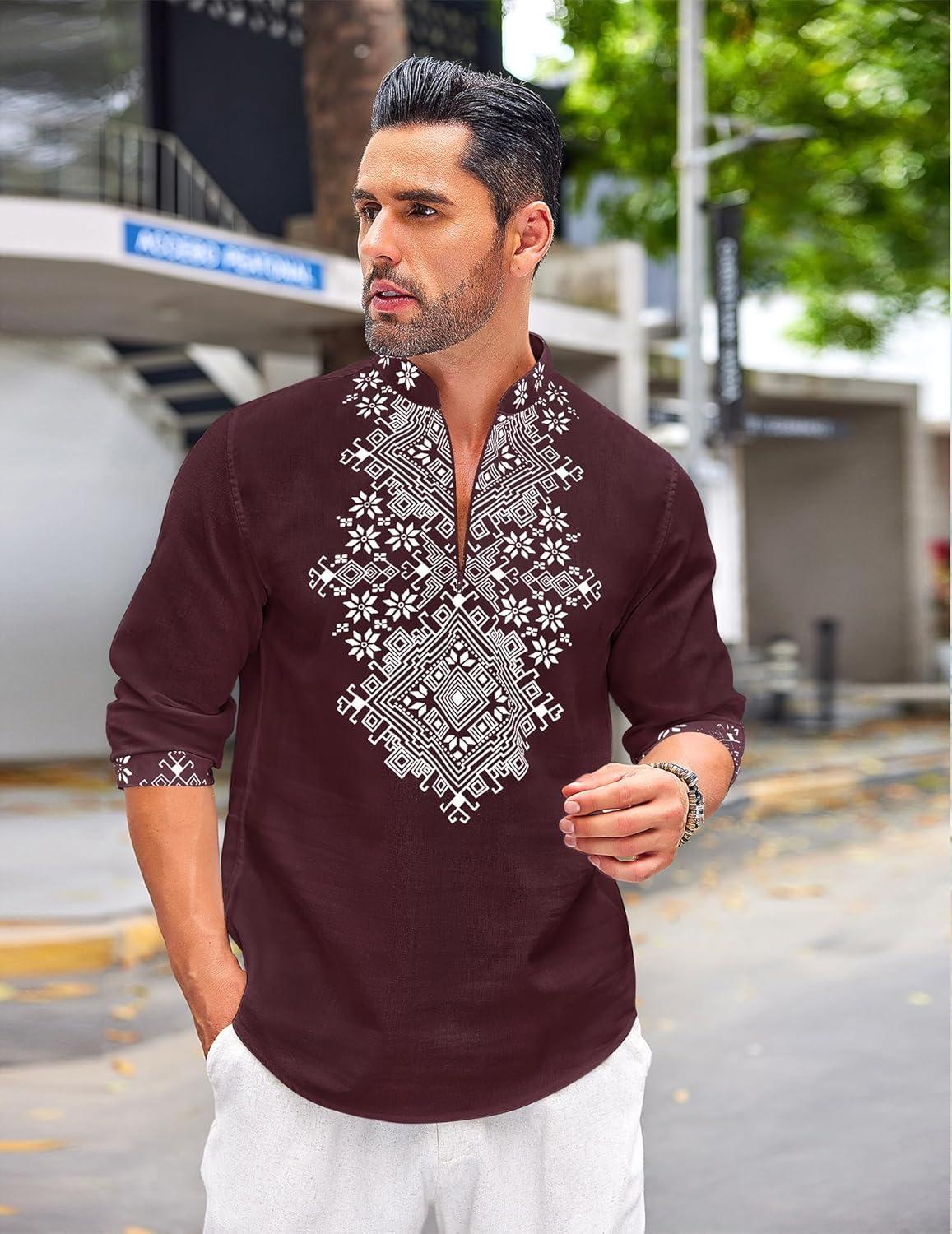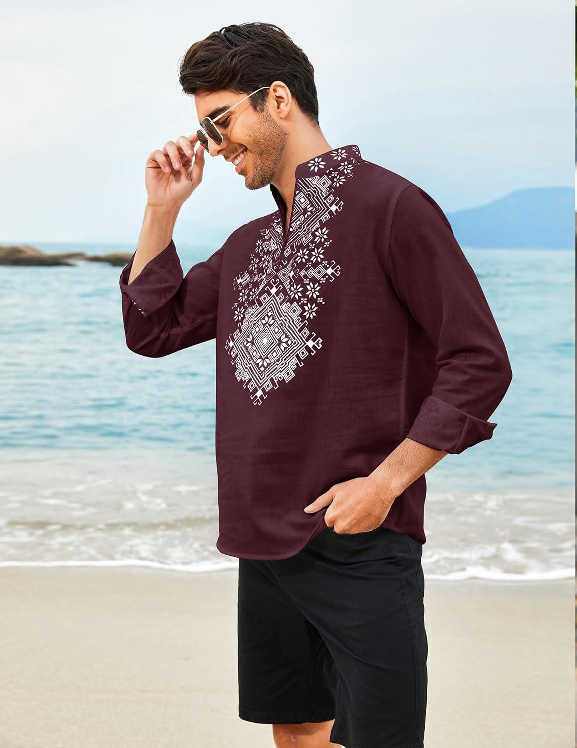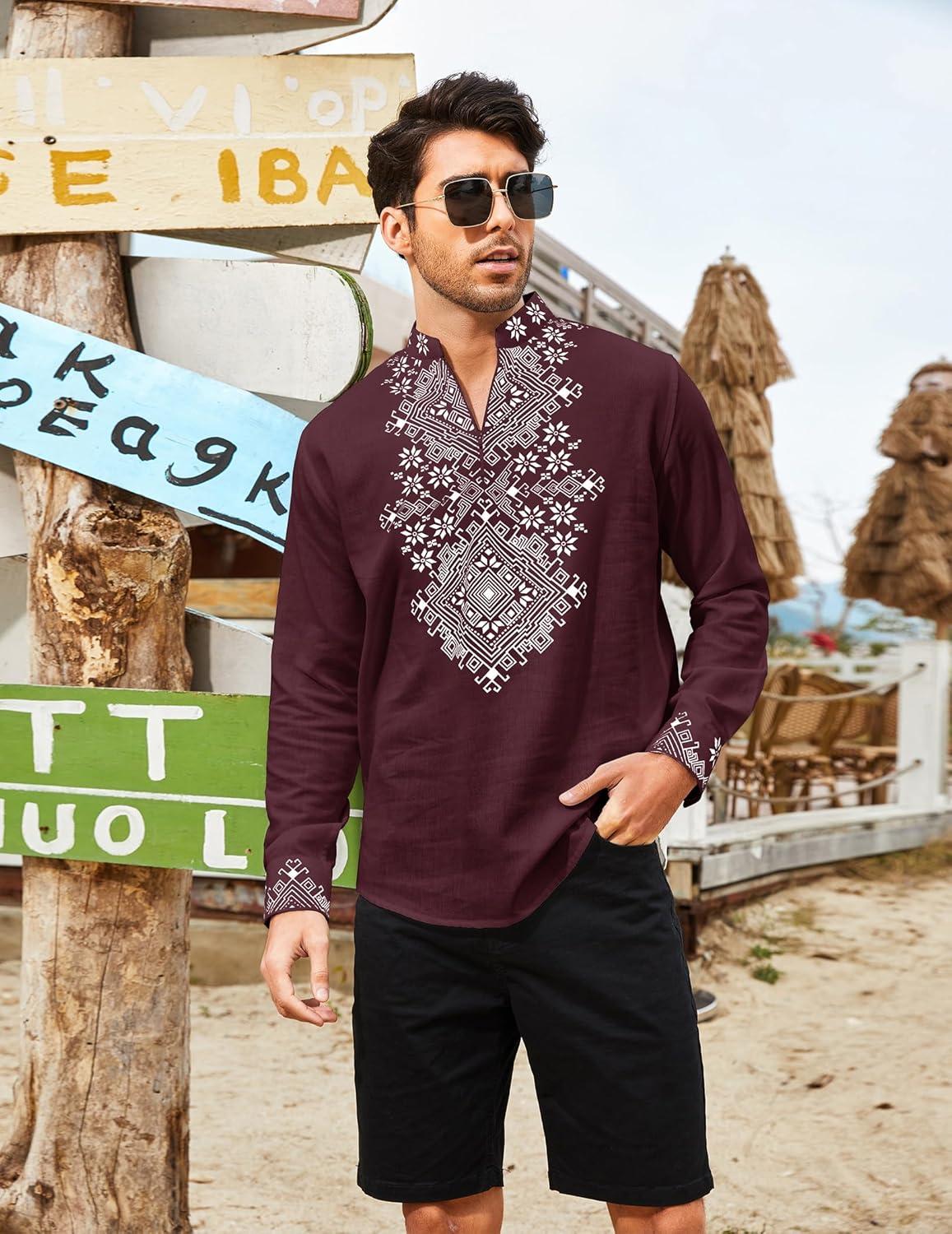 COOFANDY Men's Henley Shirt Vyshyvanka Long Sleeve African Print Shirts Casual Zip Up Cotton Linen Beach Hippie Shirt(Dark Red)
