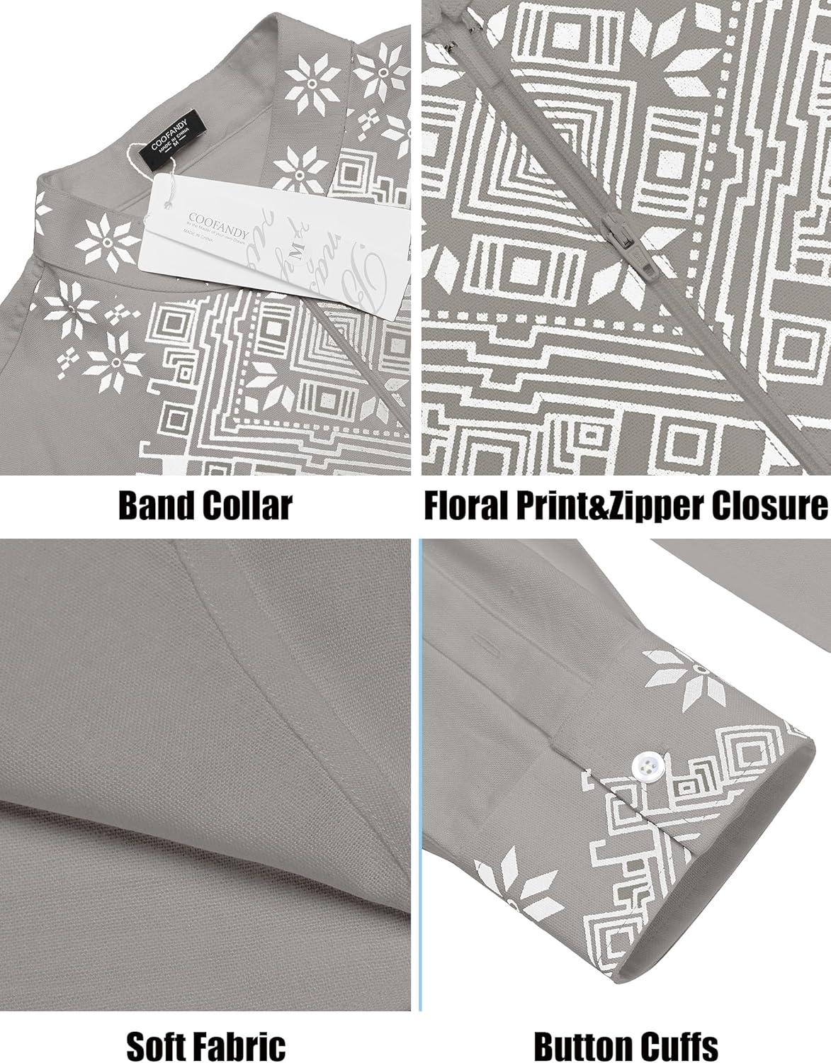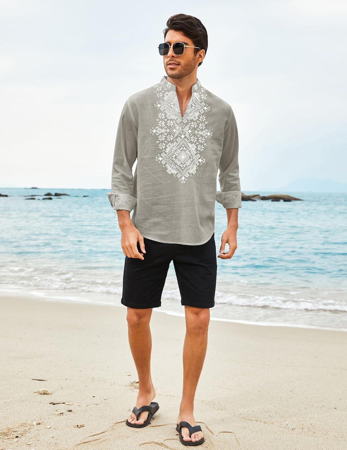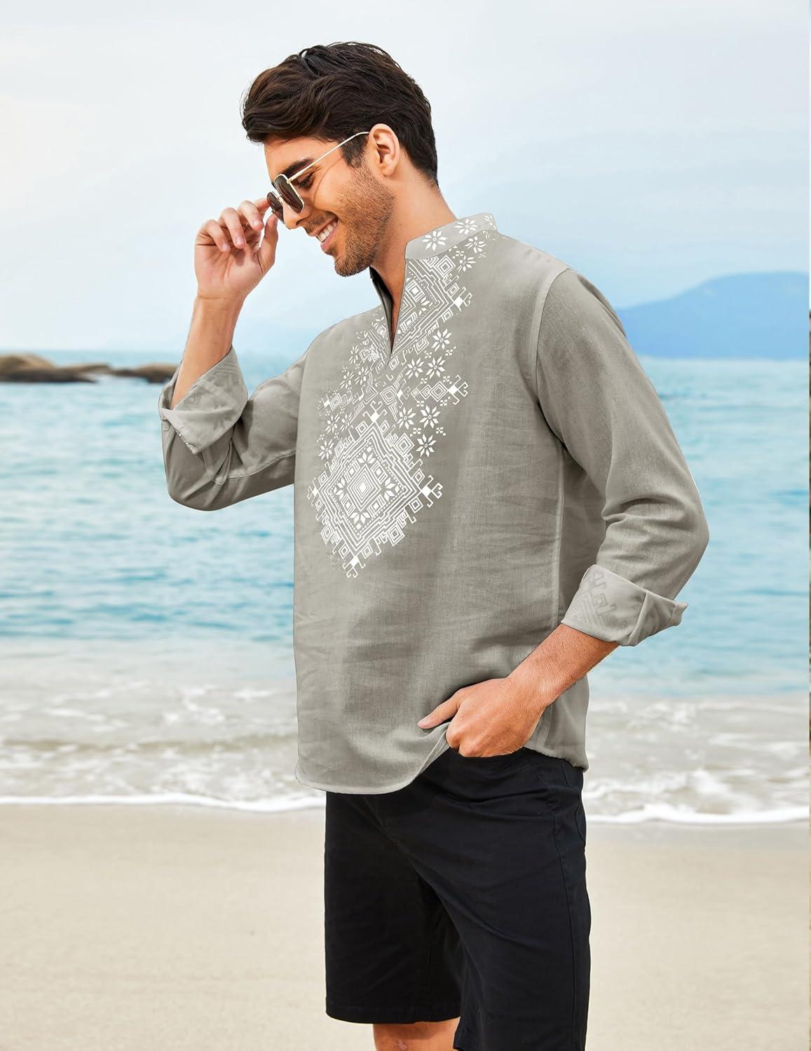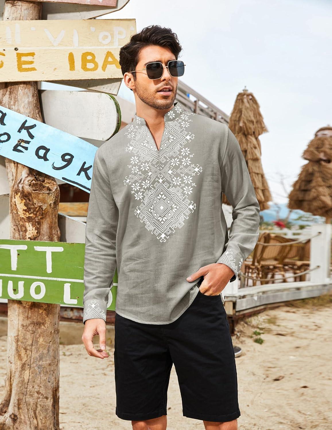 COOFANDY Men’s Henley Shirt Vyshyvanka Long Sleeve African Print Shirts Casual Zip Up Cotton Linen Beach Hippie Shirt(Light Grey)