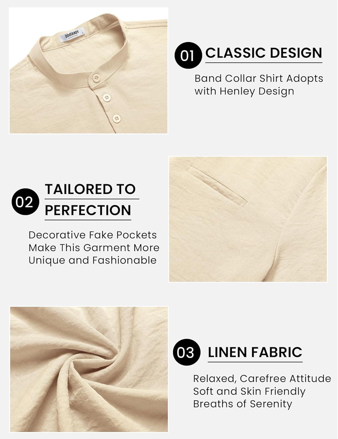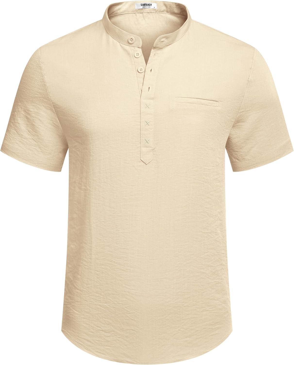 COOFANDY Men's Henley Shirts Band Collar Short Sleeve T-Shirts Casual Summer Beach Shirt Hippie Fashion Hawaiian Shirt(Beige)