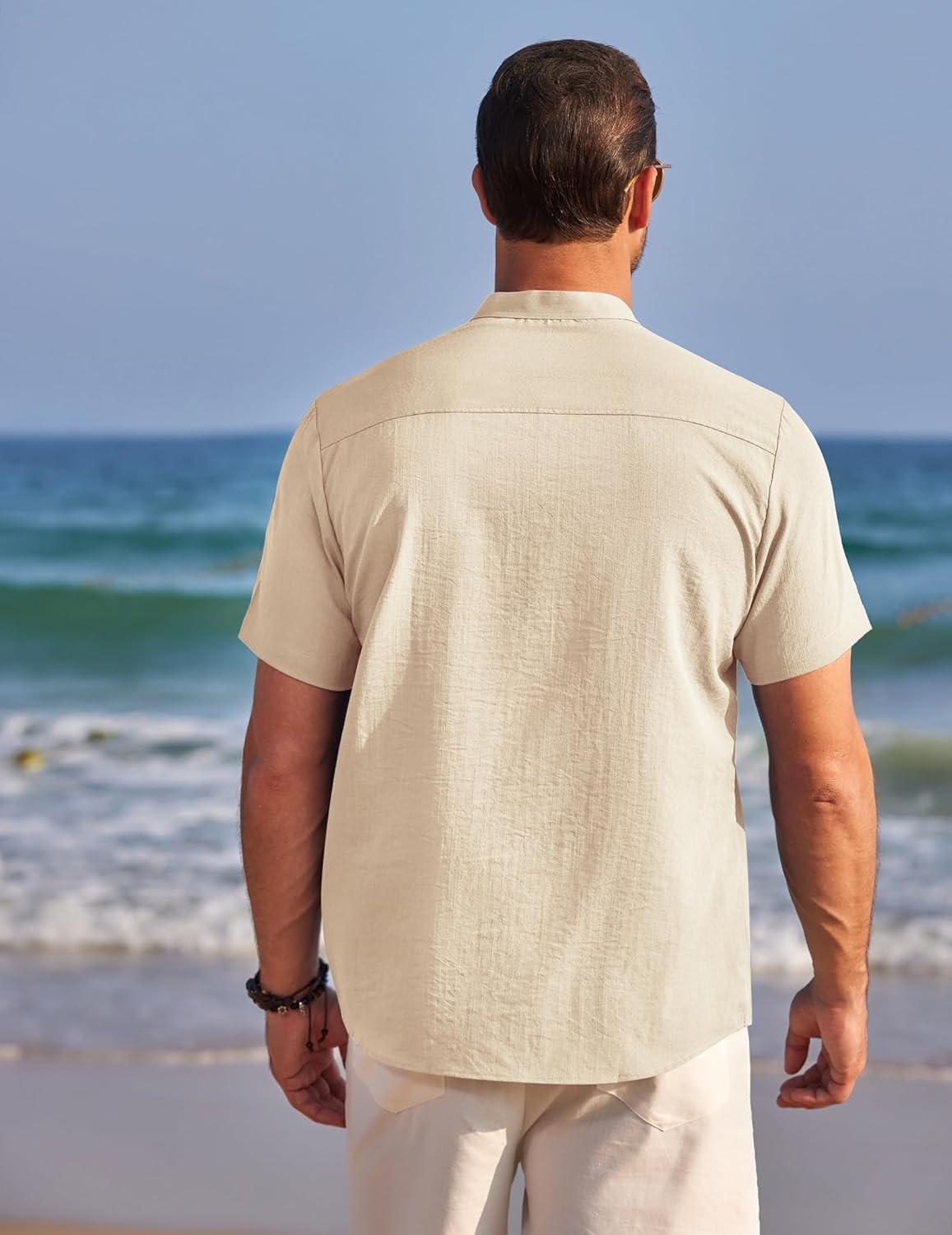 COOFANDY Men’s Henley Shirts Band Collar Short Sleeve T-Shirts Casual Summer Beach Shirt Hippie Fashion Hawaiian Shirt(Beige)