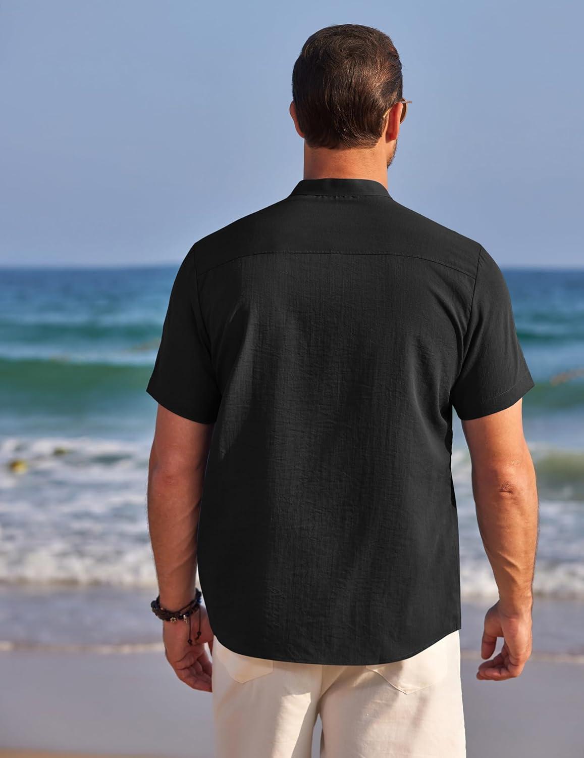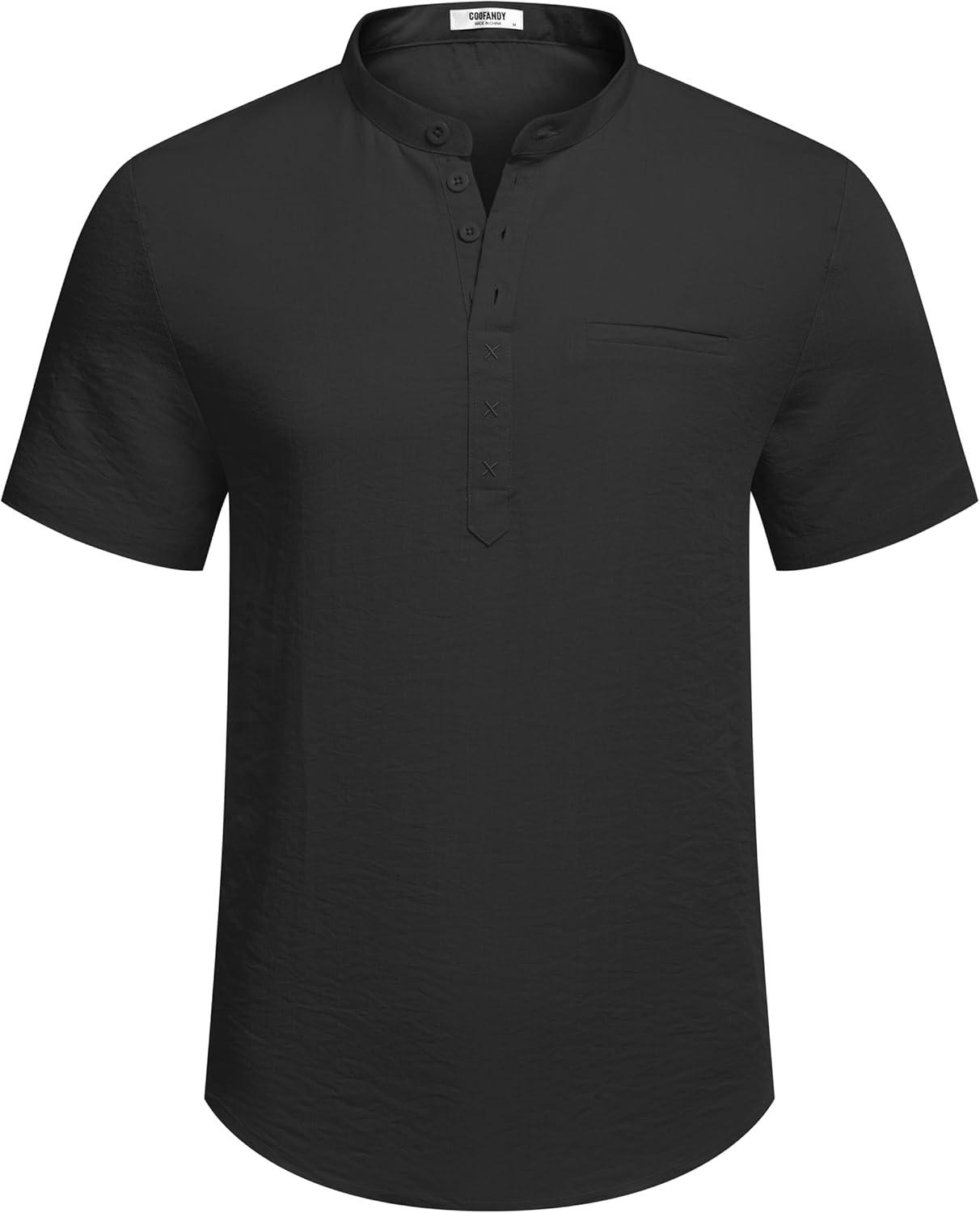 COOFANDY Men's Henley Shirts Band Collar Short Sleeve T-Shirts Casual Summer Beach Shirt Hippie Fashion Hawaiian Shirt(Black)