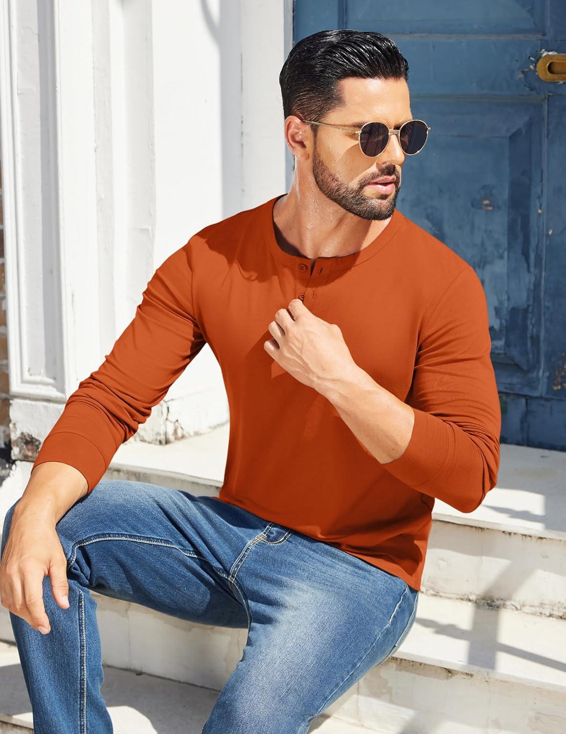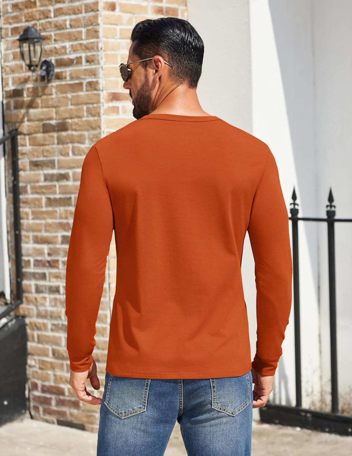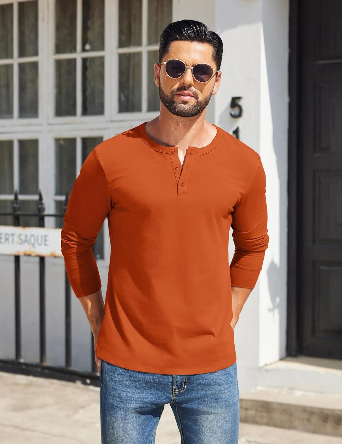 COOFANDY Mens Henley Shirts Cotton Long Sleeve V Neck Button Basic Tees Plain Casual Pullover(Caramel)