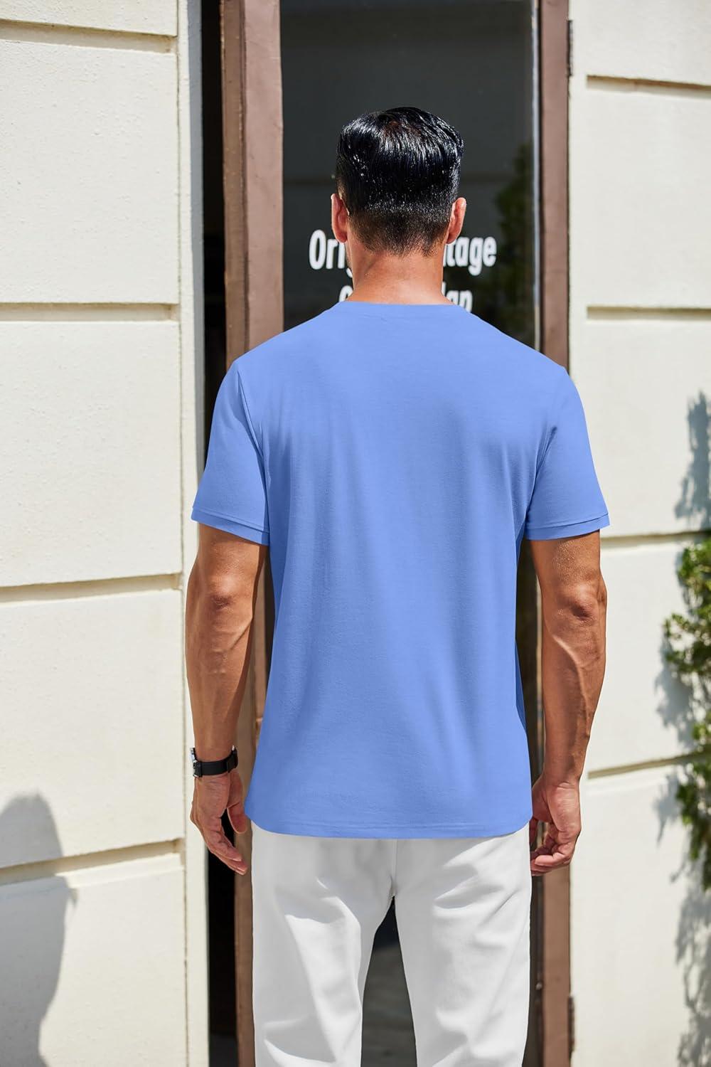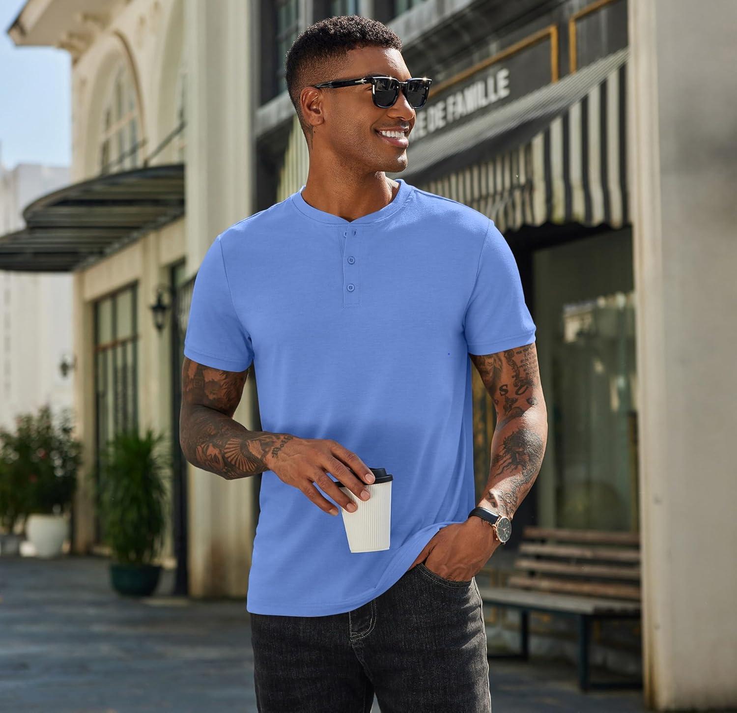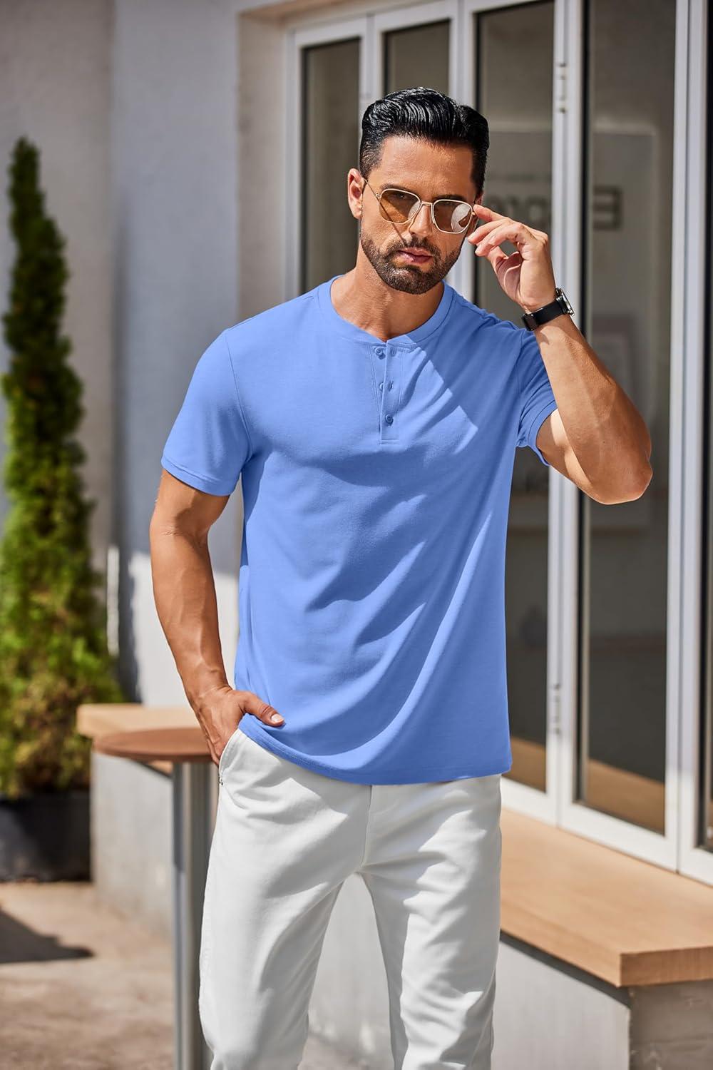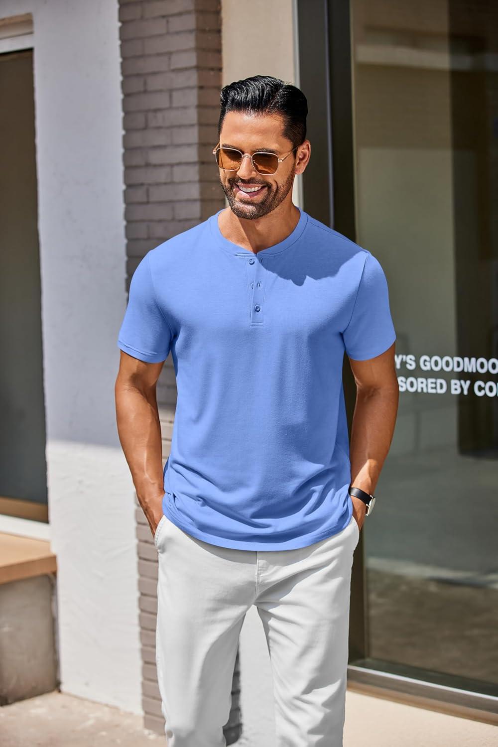COOFANDY Men's Henley Shirts Cotton Short Sleeve Casual T-Shirt Button Henley Basic Tee Lightweight Summer Top(Light Blue)