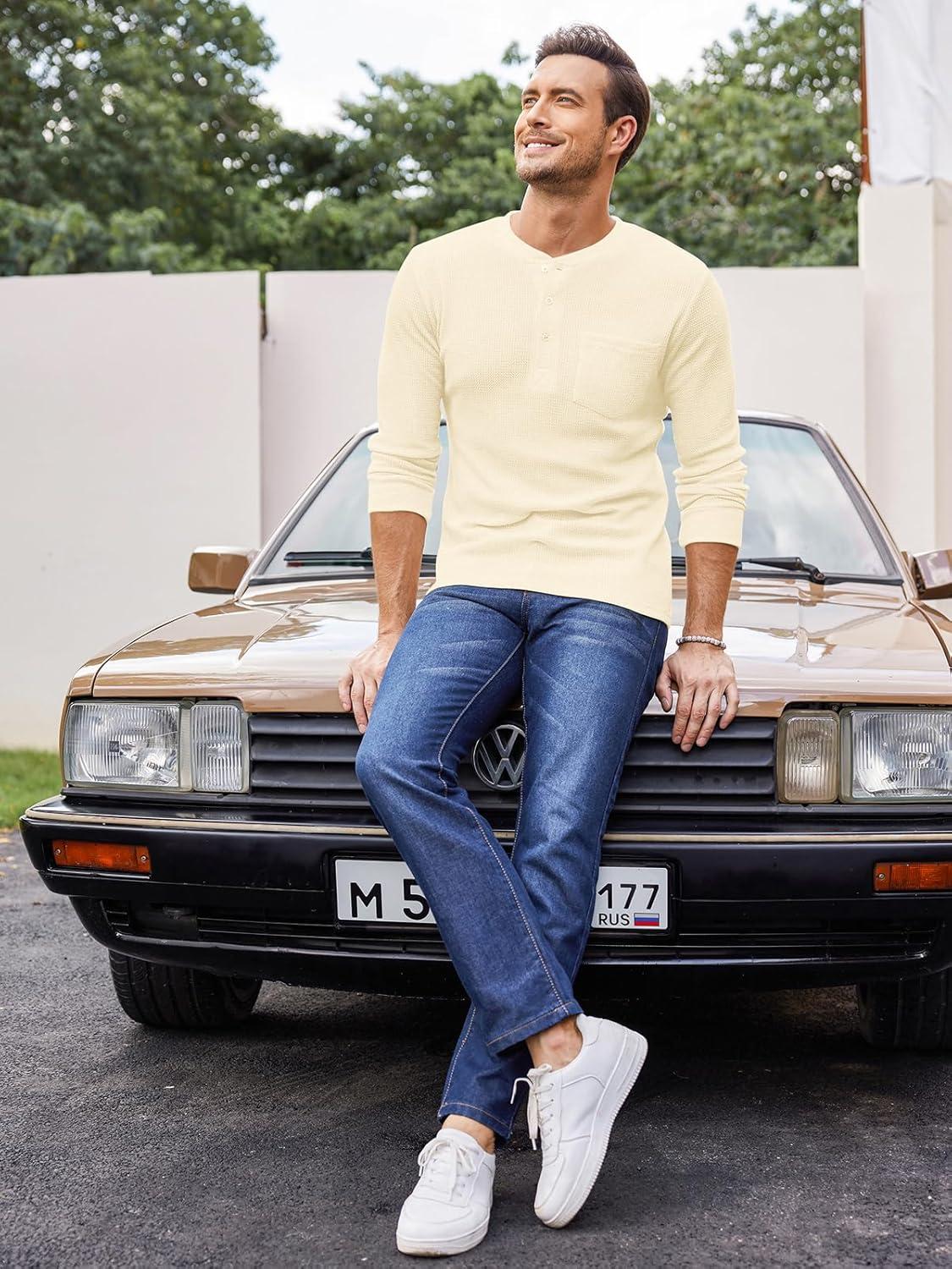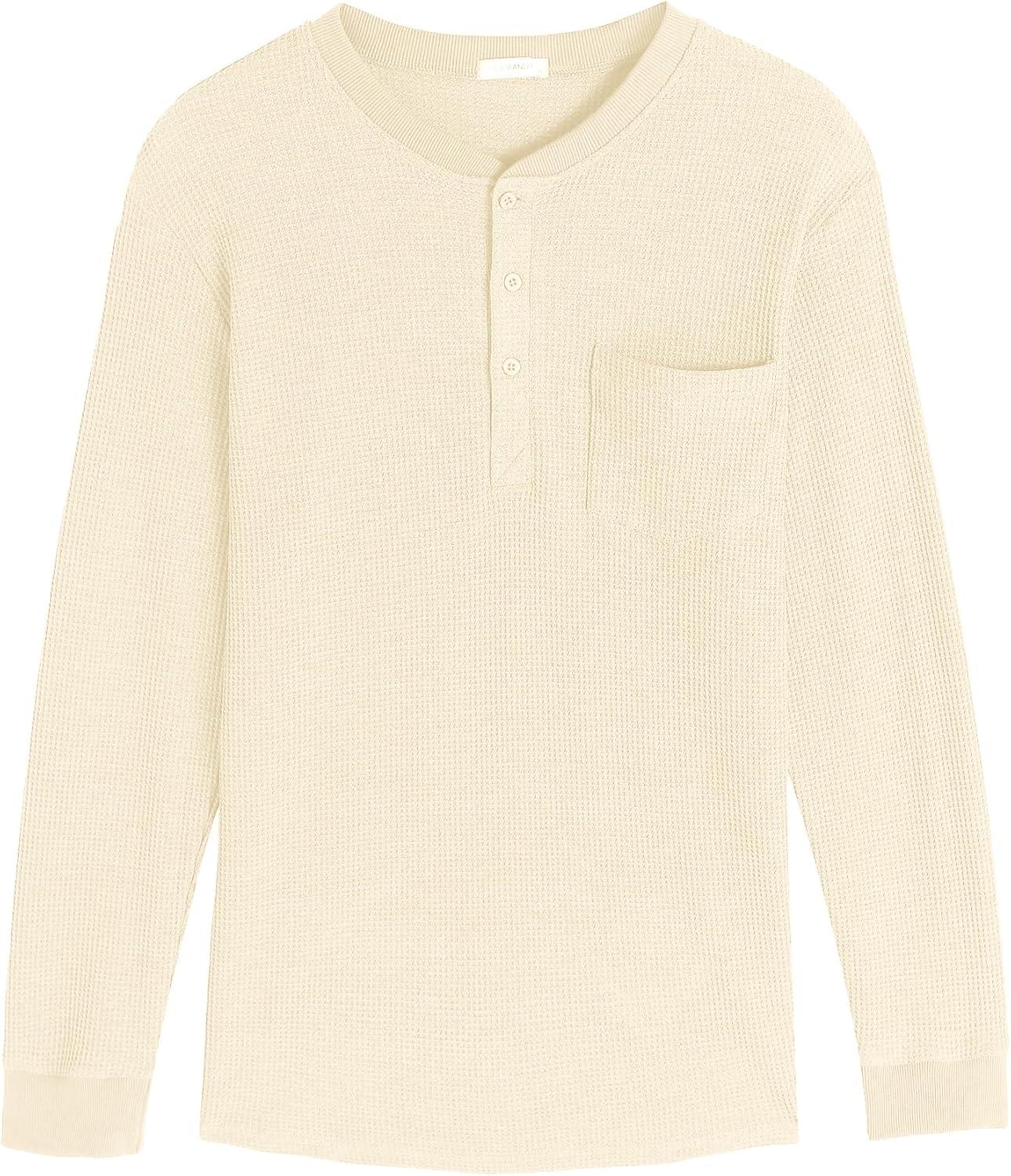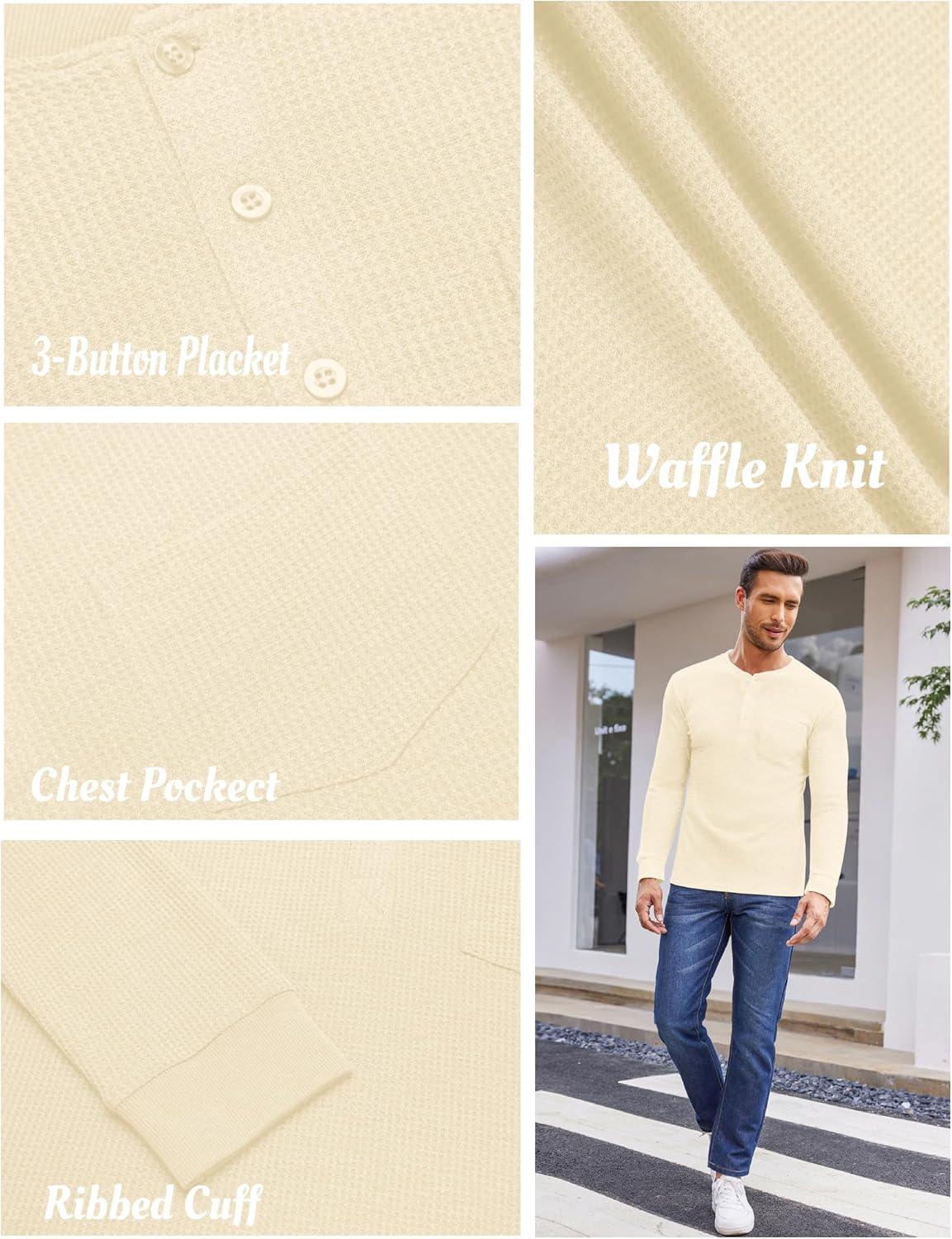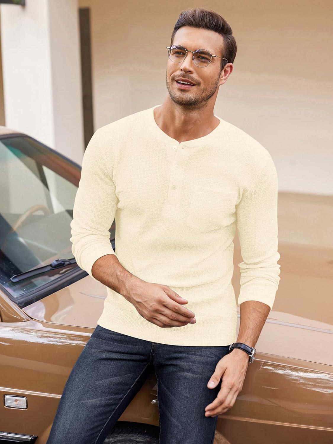 COOFANDY Men’s Henley Shirts Long Sleeve Basic Waffle Pique Pullover T-Shirt with Pocket(Beige)