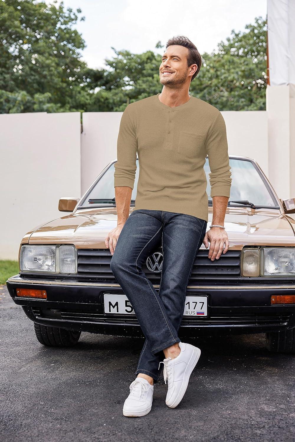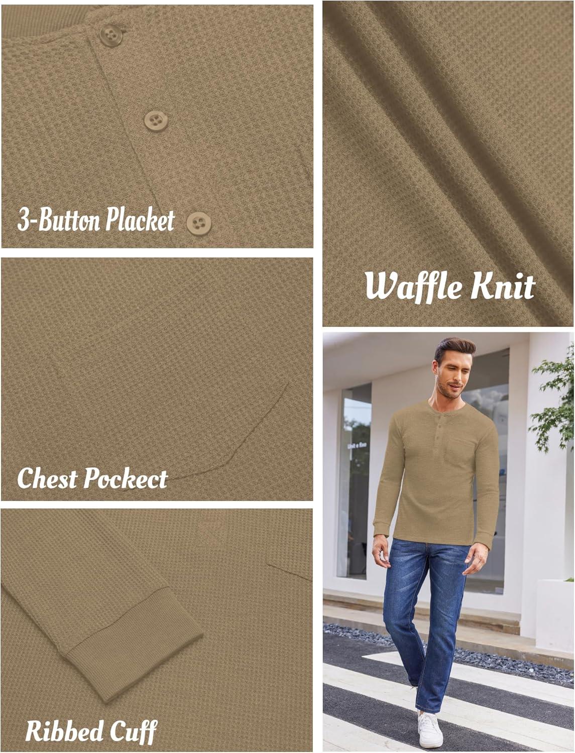 COOFANDY Men’s Henley Shirts Long Sleeve Basic Waffle Pique Pullover T-Shirt with Pocket(Khaki)