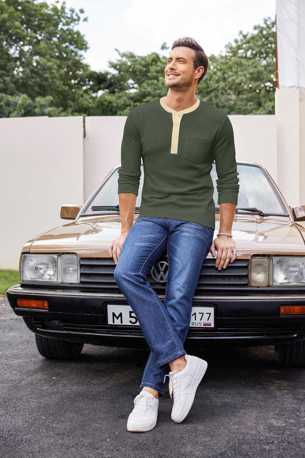 COOFANDY Men’s Henley Shirts Long Sleeve Basic Waffle Pique Pullover T-Shirt with Pocket(Pat: Army & Light Khaki)