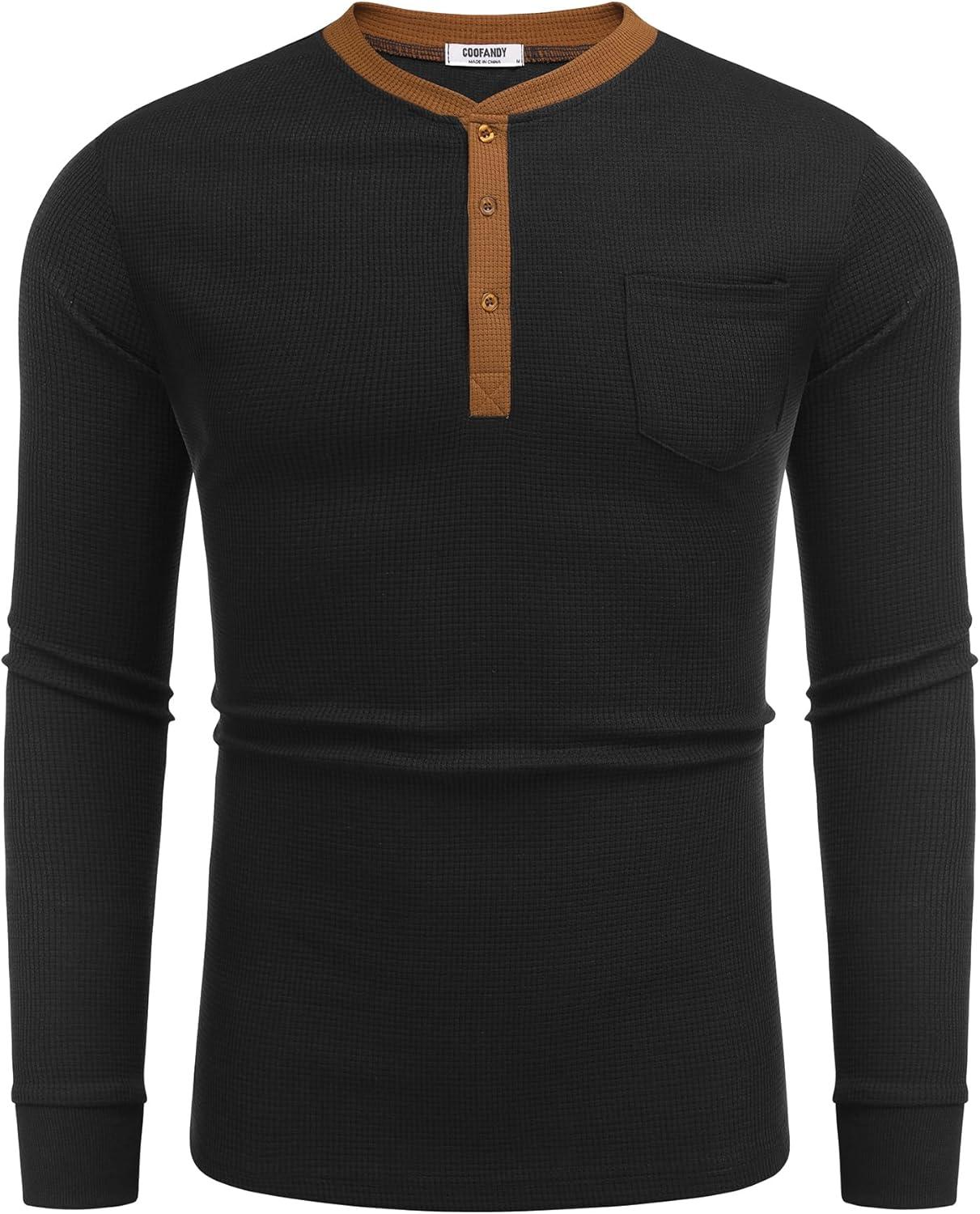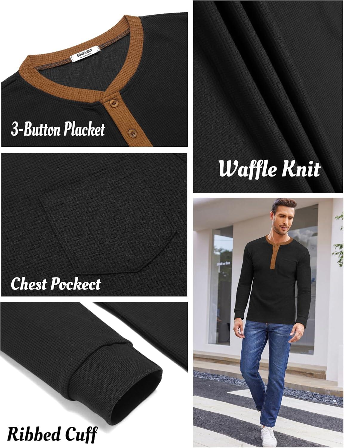 COOFANDY Men's Henley Shirts Long Sleeve Basic Waffle Pique Pullover T-Shirt with Pocket(Pat: Black & Light Brown)