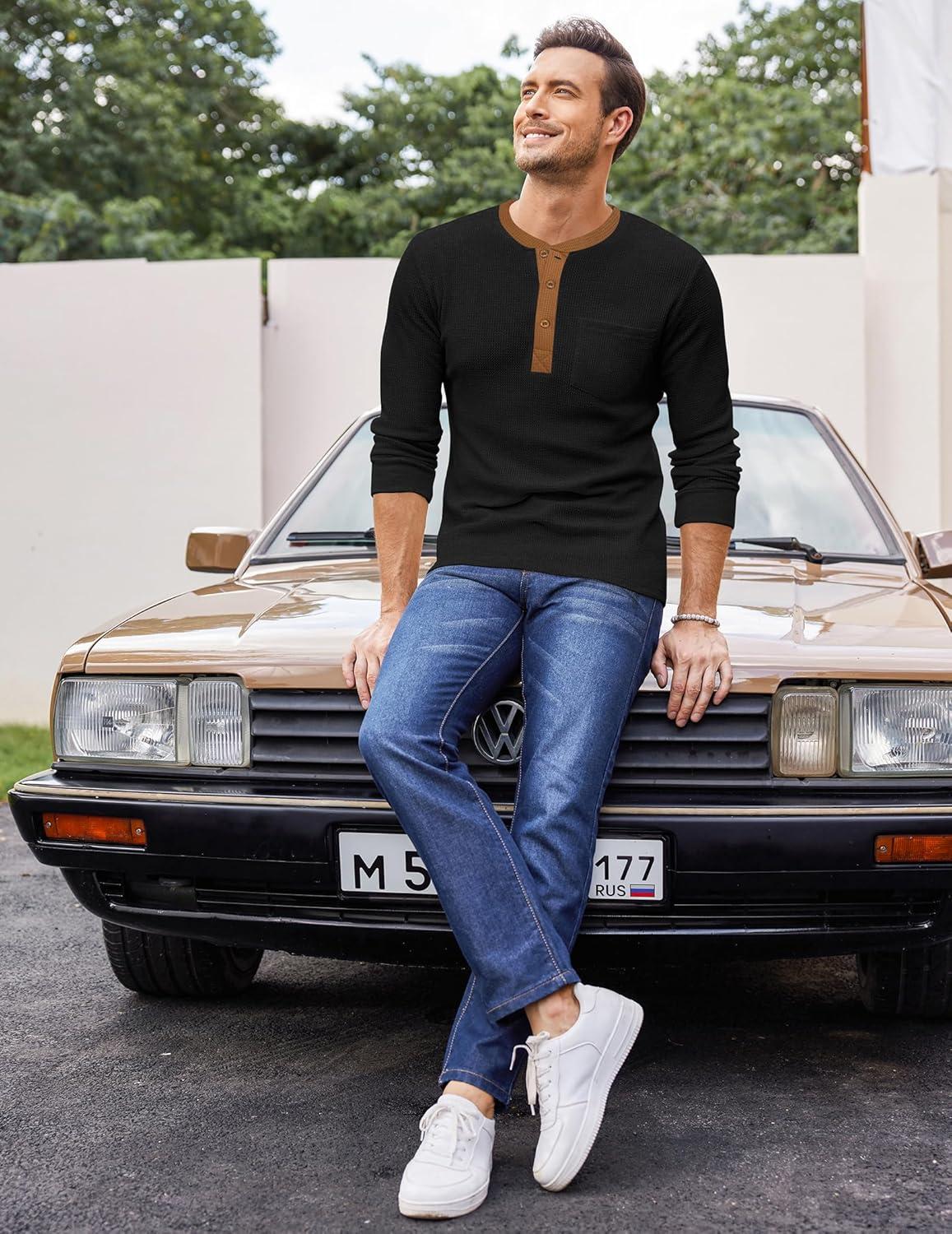 COOFANDY Men’s Henley Shirts Long Sleeve Basic Waffle Pique Pullover T-Shirt with Pocket(Pat: Black & Light Brown)