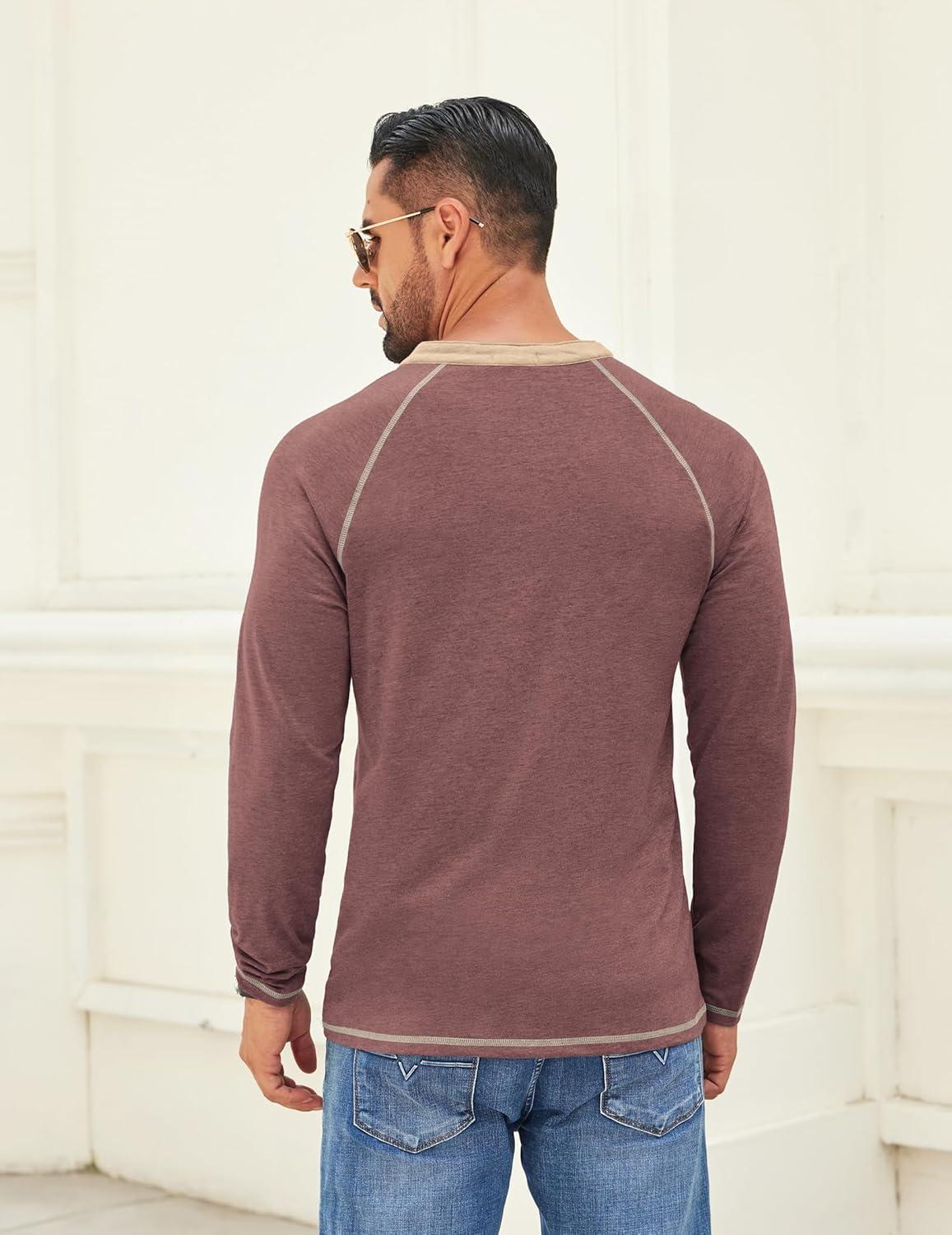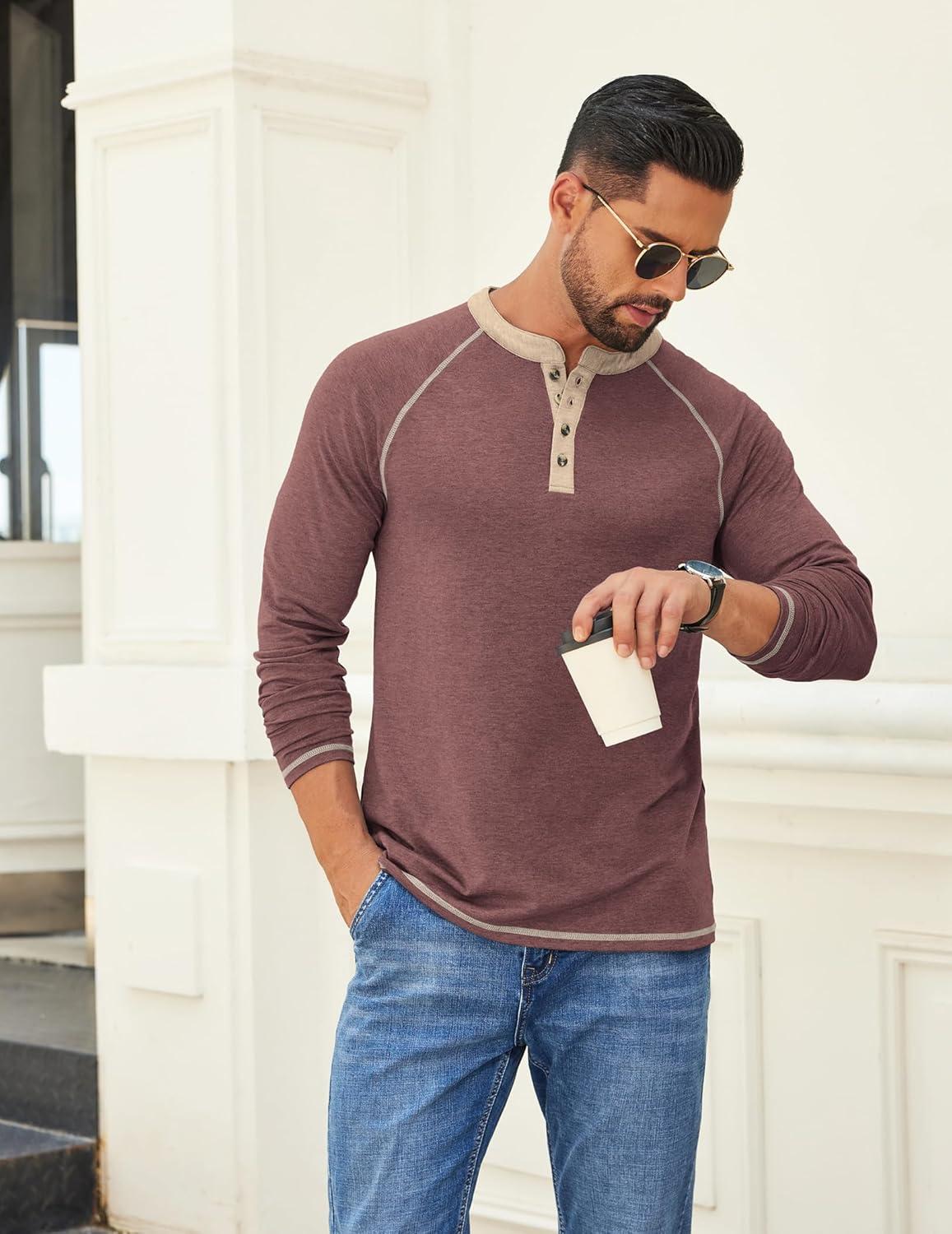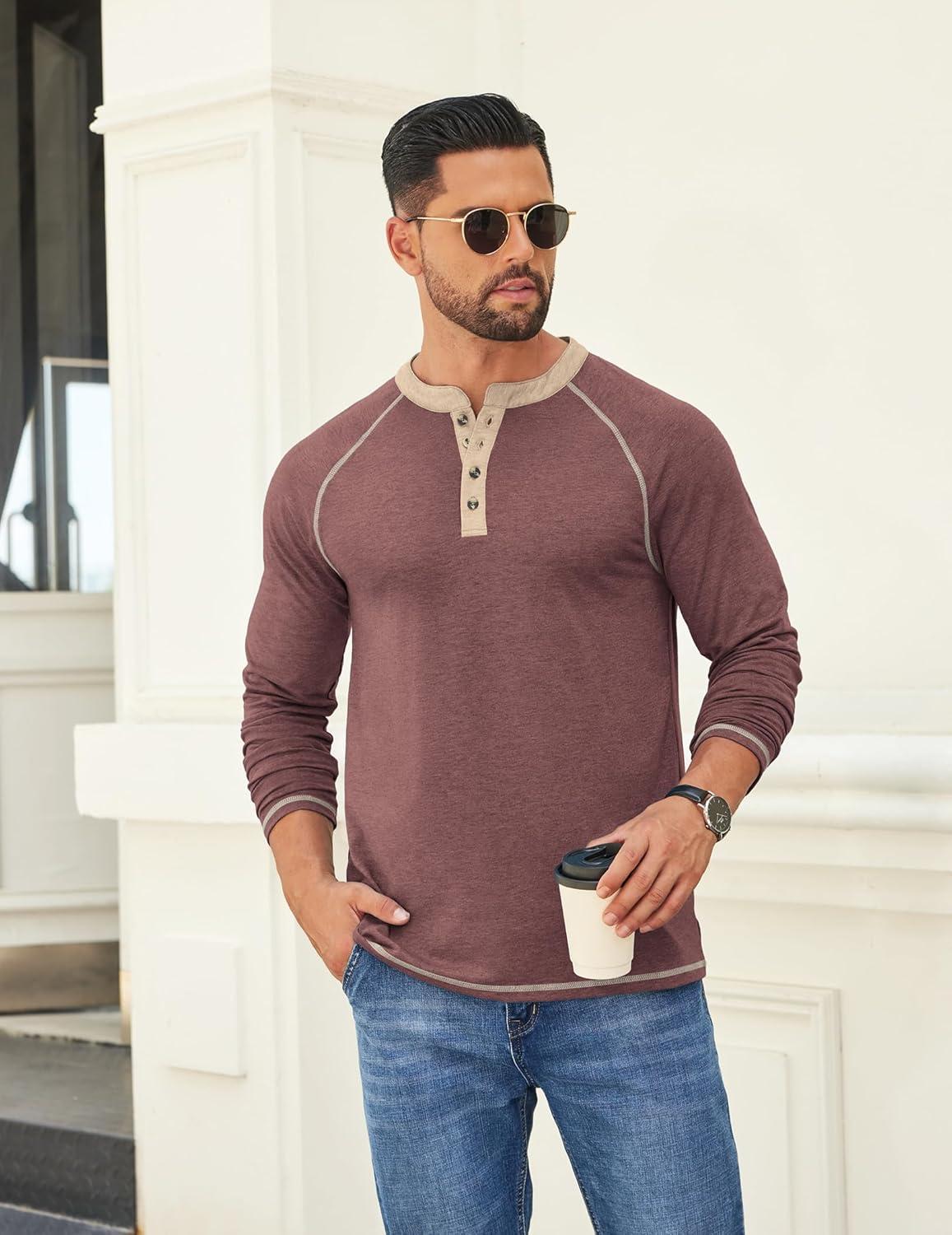 COOFANDY Mens Henley Shirts Long Sleeve Casual Button V Neck T-Shirt Lightweight Fashion Pullover Shirts(Heather Burgundy)