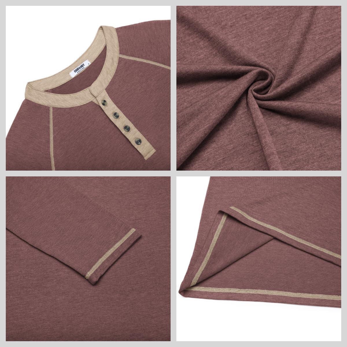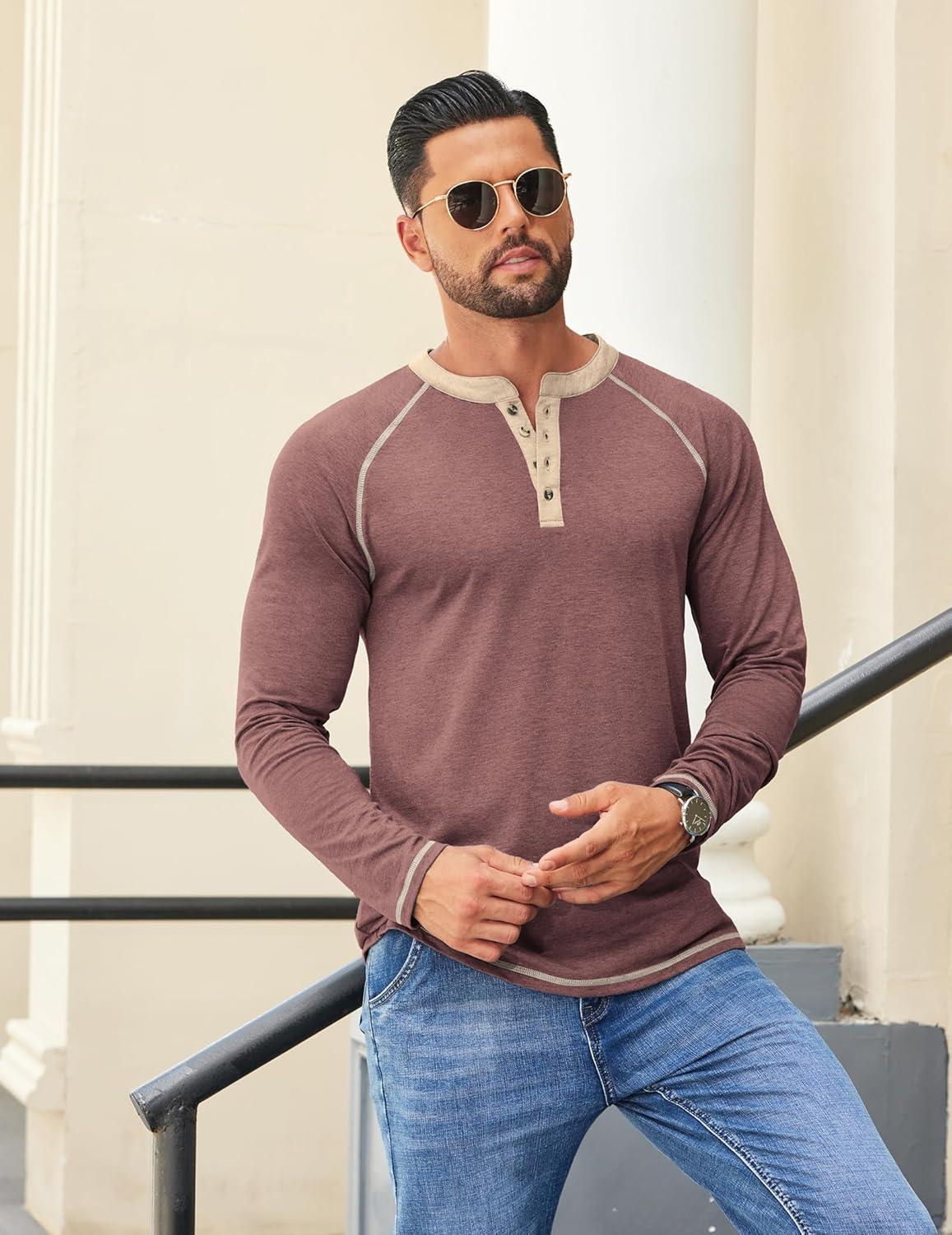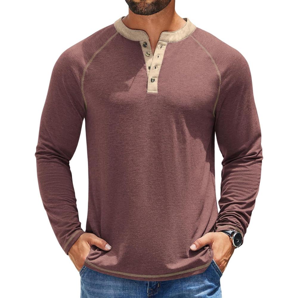 COOFANDY Mens Henley Shirts Long Sleeve Casual Button V Neck T-Shirt Lightweight Fashion Pullover Shirts(Heather Burgundy)