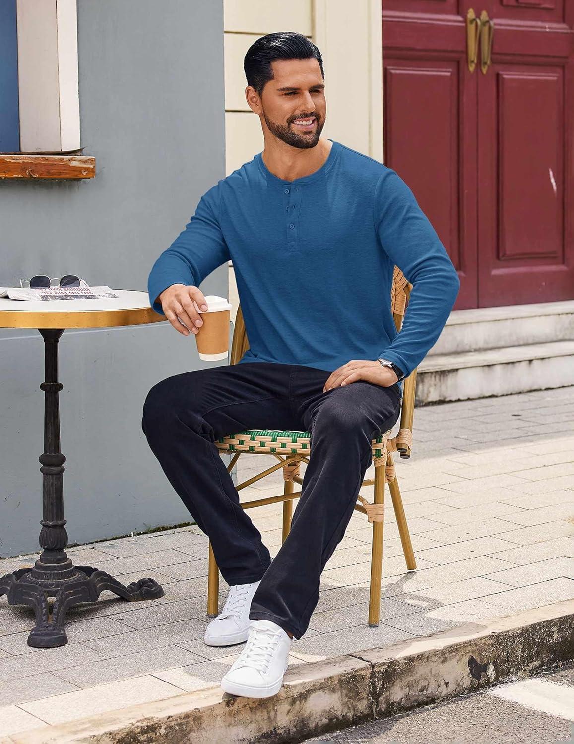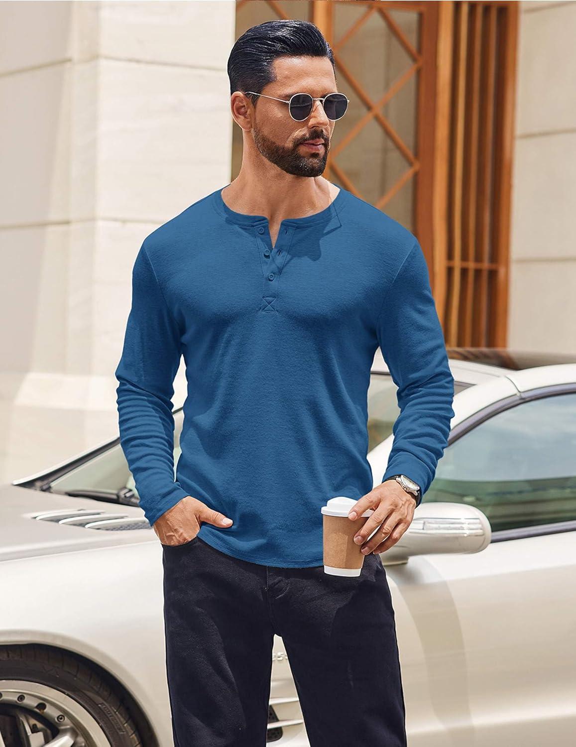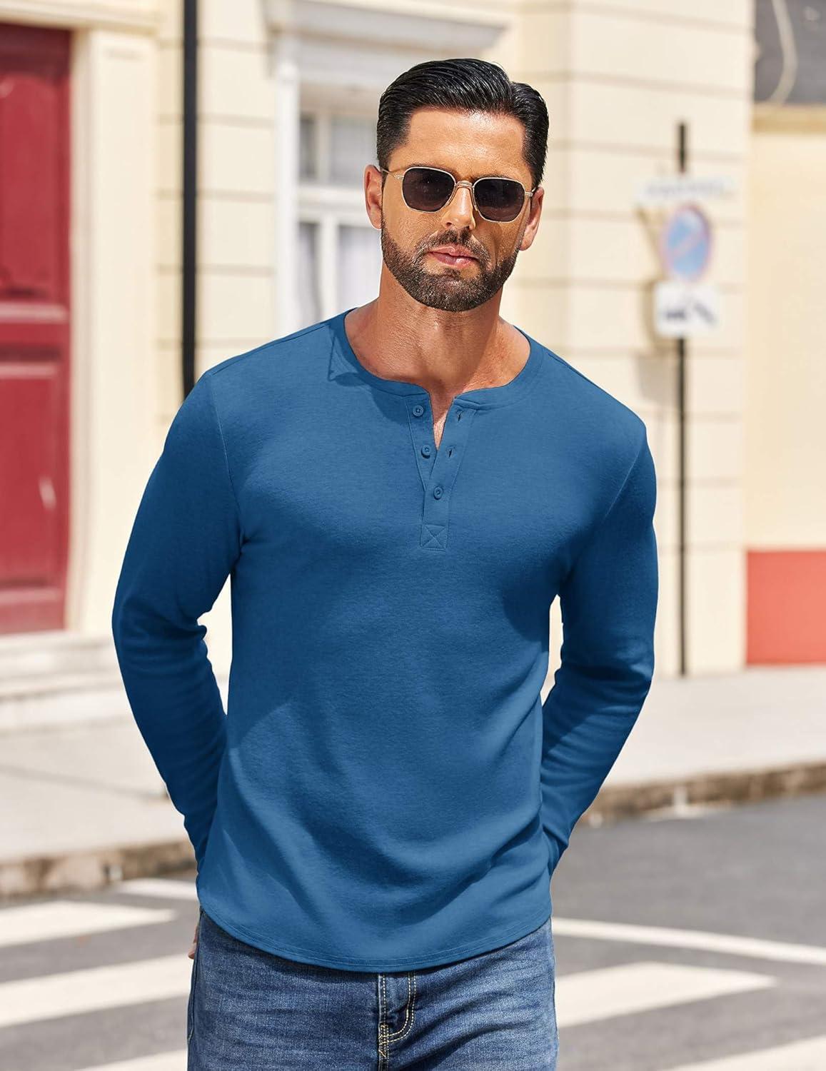 COOFANDY Mens Henley Shirts Long Sleeve Casual Pullover Shirt Fashion Button T-Shirt(Denim)