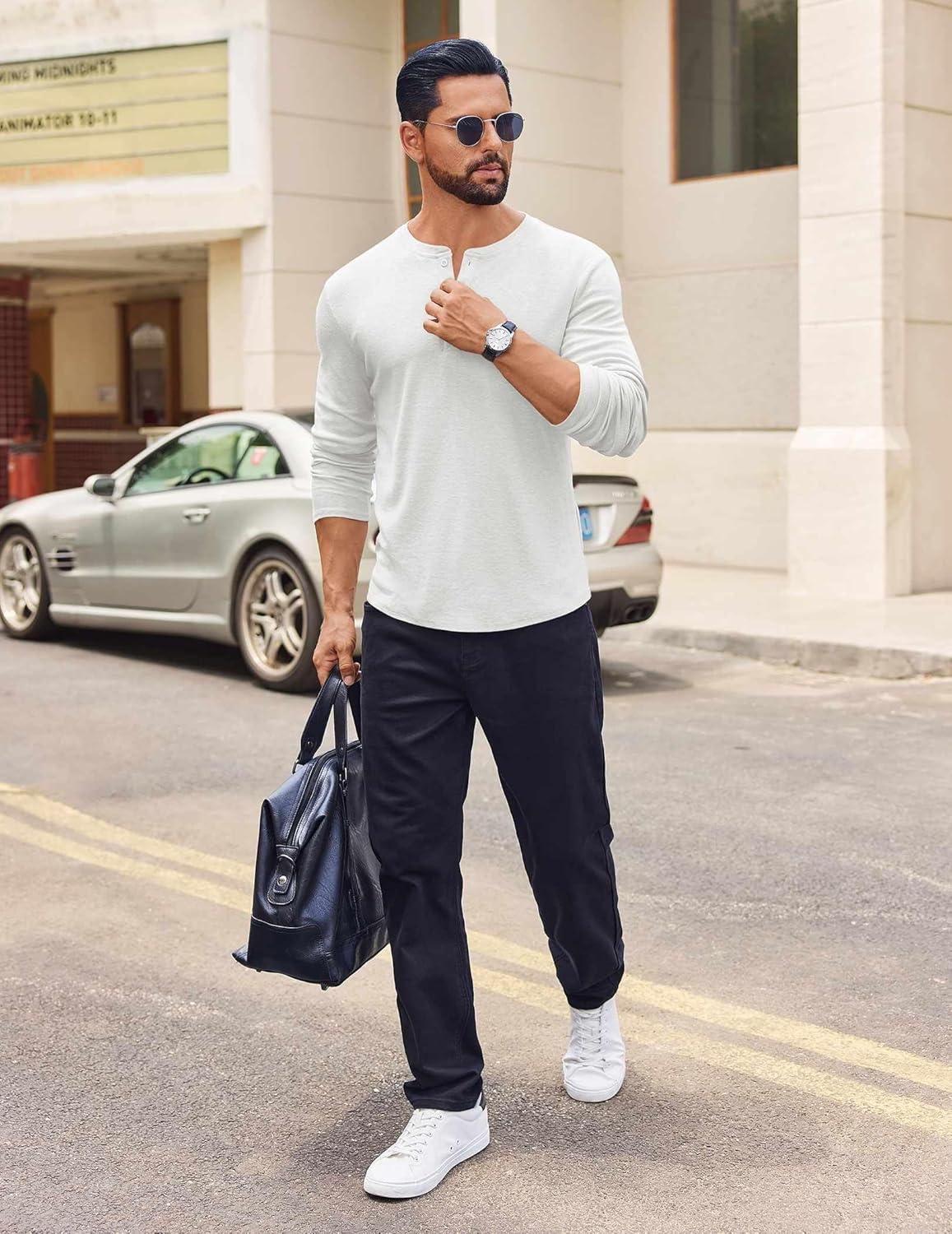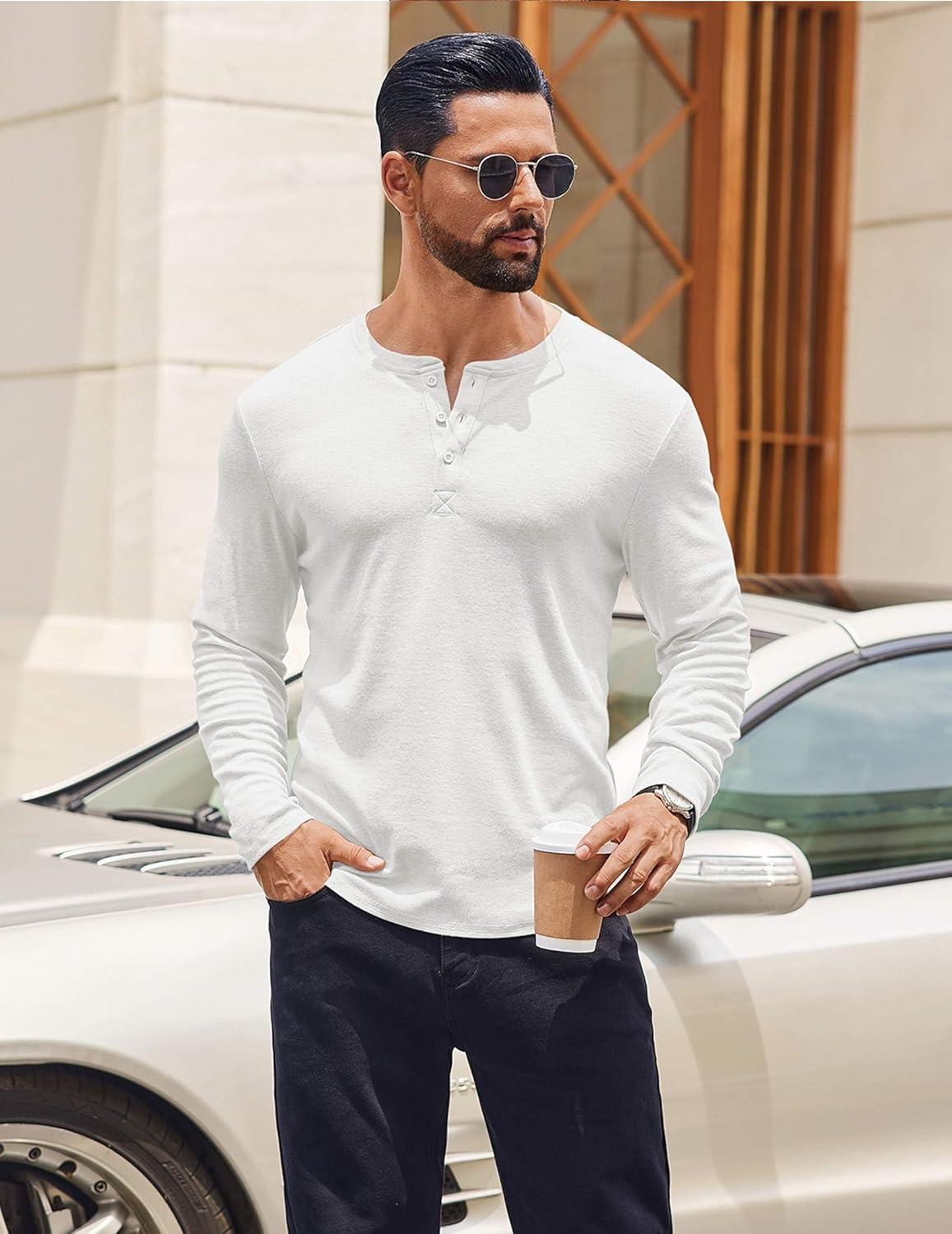 COOFANDY Mens Henley Shirts Long Sleeve Casual Pullover Shirt Fashion Button T-Shirt(White)