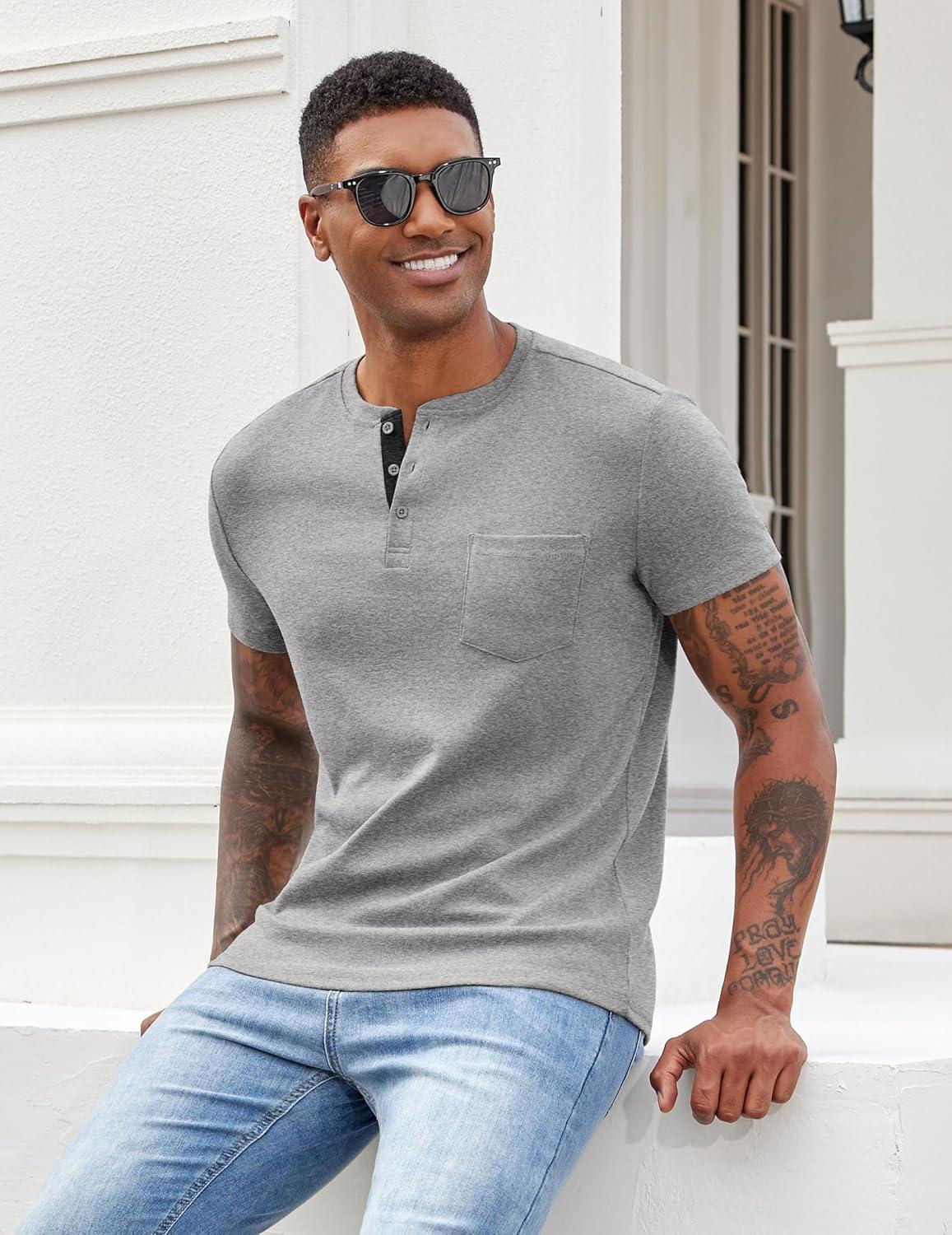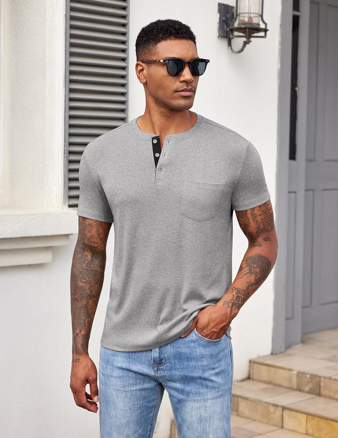 COOFANDY Men’s Henley Shirts Short Sleeve Button T Shirt Casual Summer Basic Tee Tops with Pocket(Light Gray)