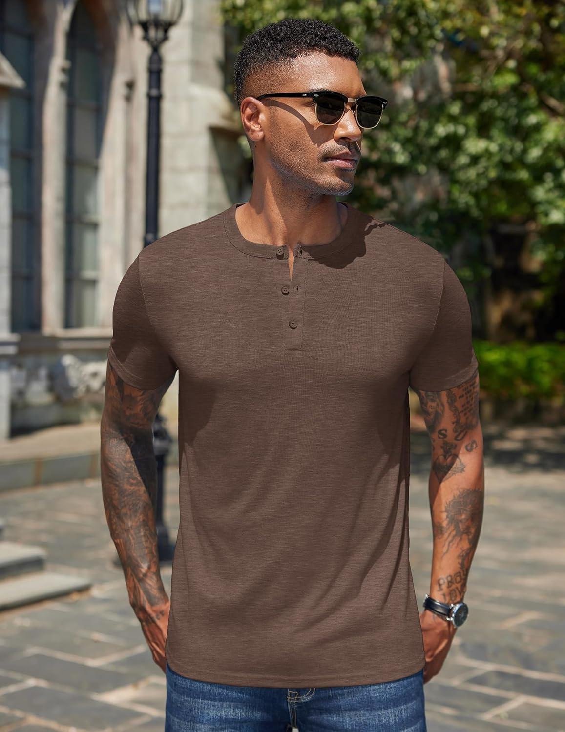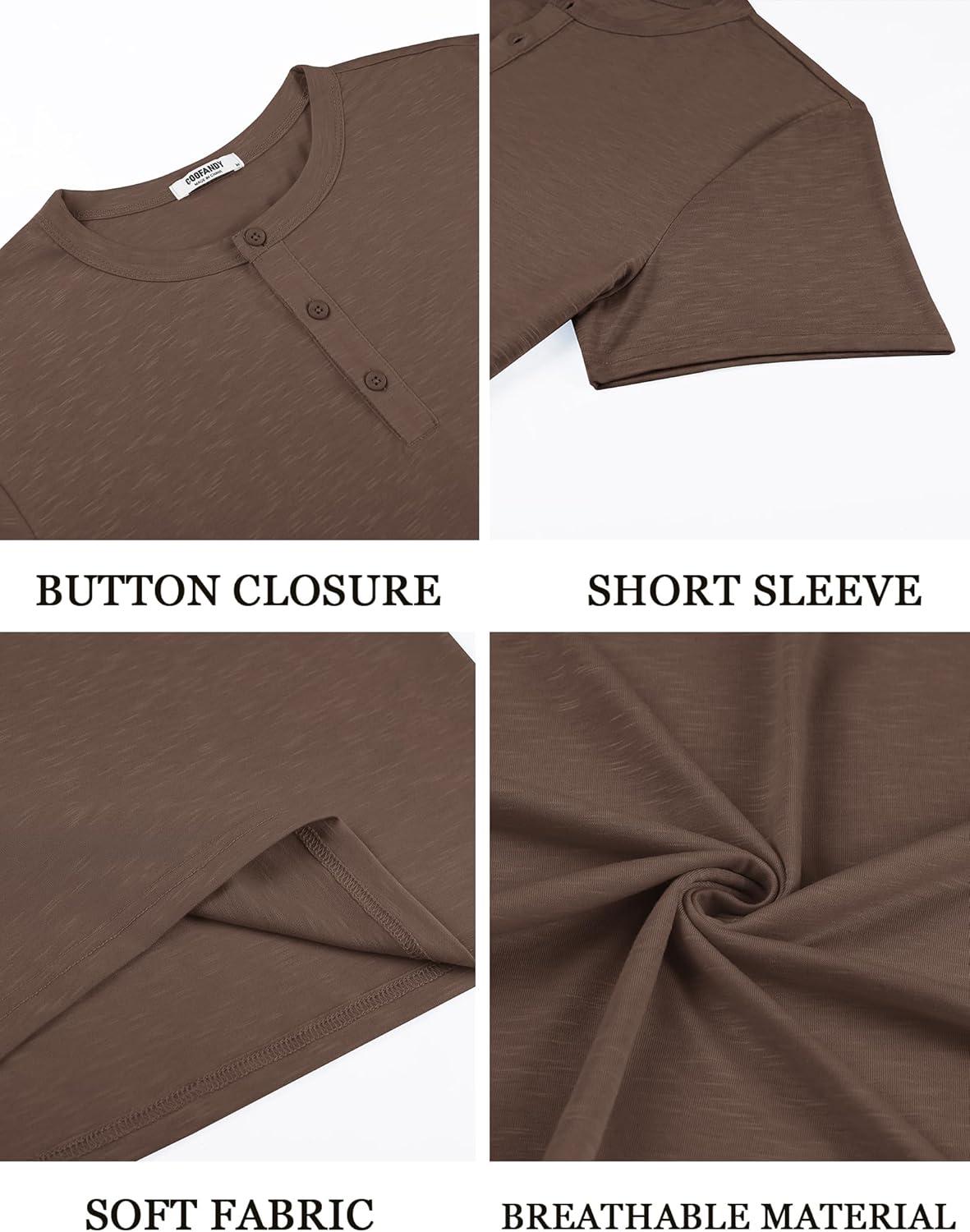 COOFANDY Men's Henley Shirts Short Sleeve Casual Basic Henley Tee Summer Button Lightweight Stretch T Shirts(Brown)