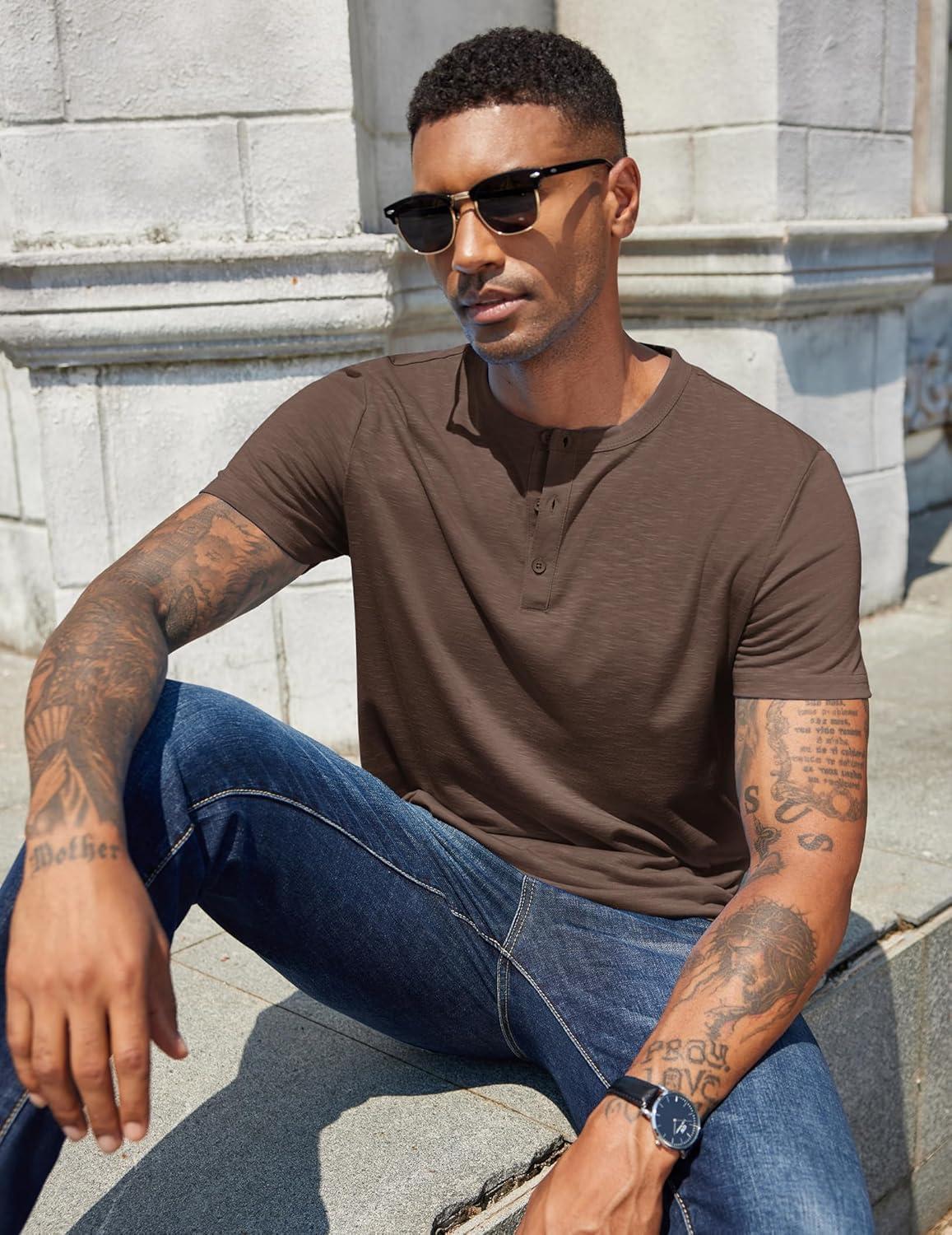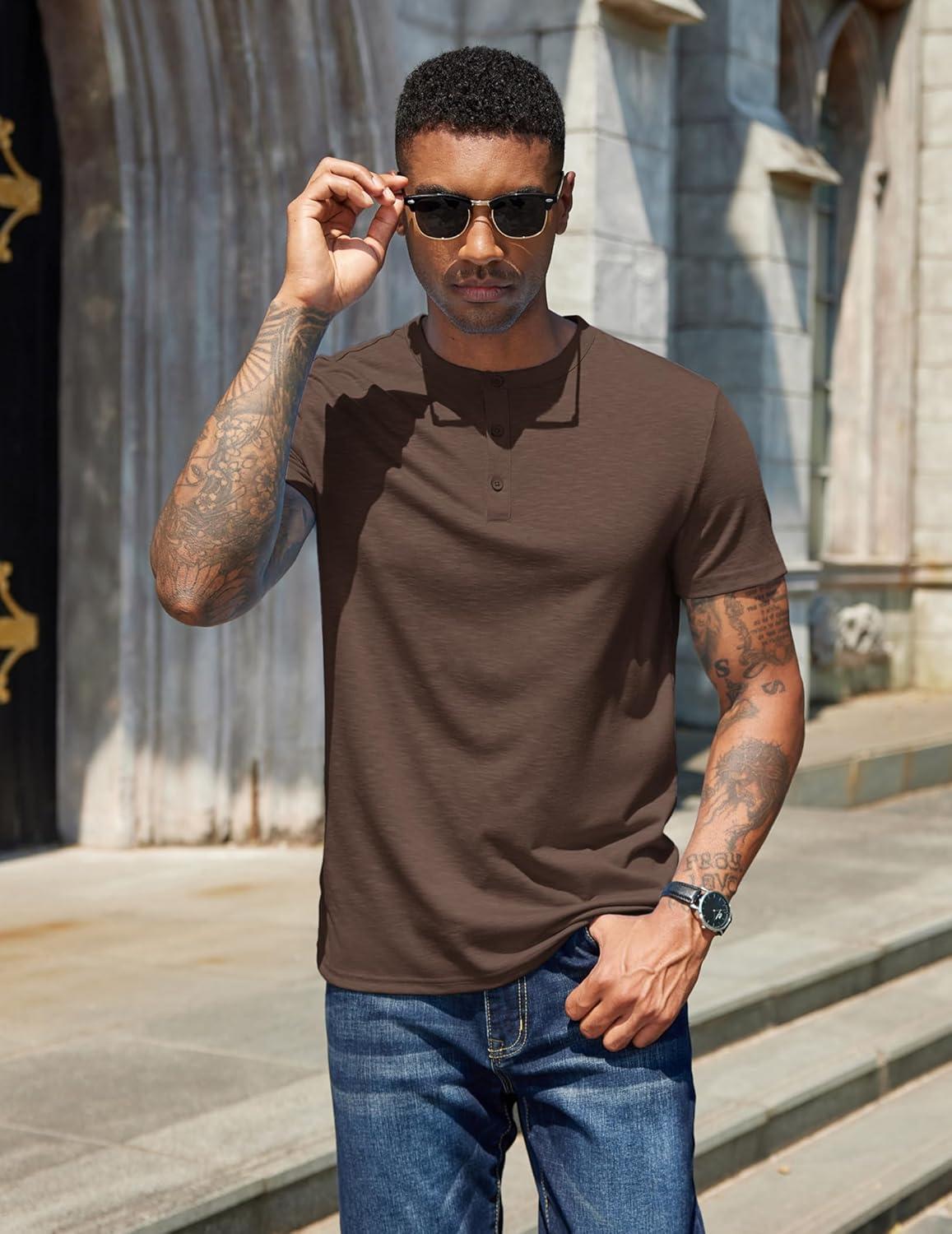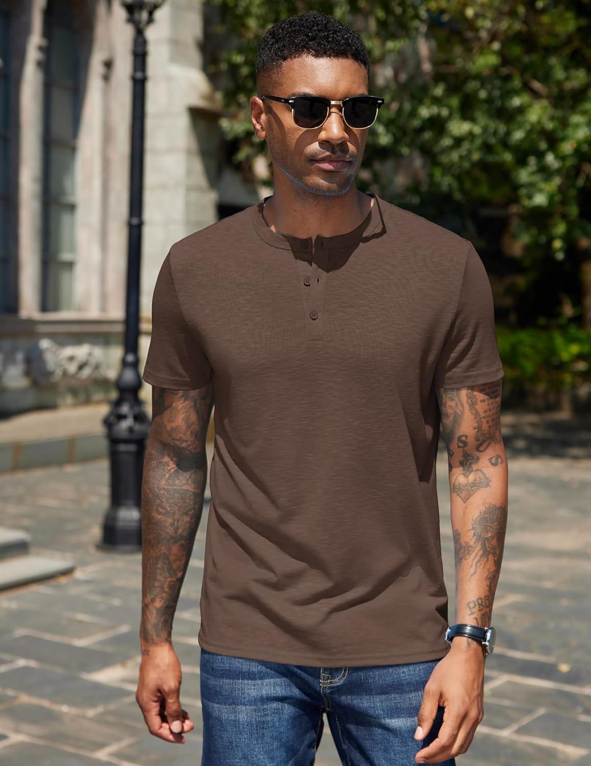 COOFANDY Men’s Henley Shirts Short Sleeve Casual Basic Henley Tee Summer Button Lightweight Stretch T Shirts(Brown)