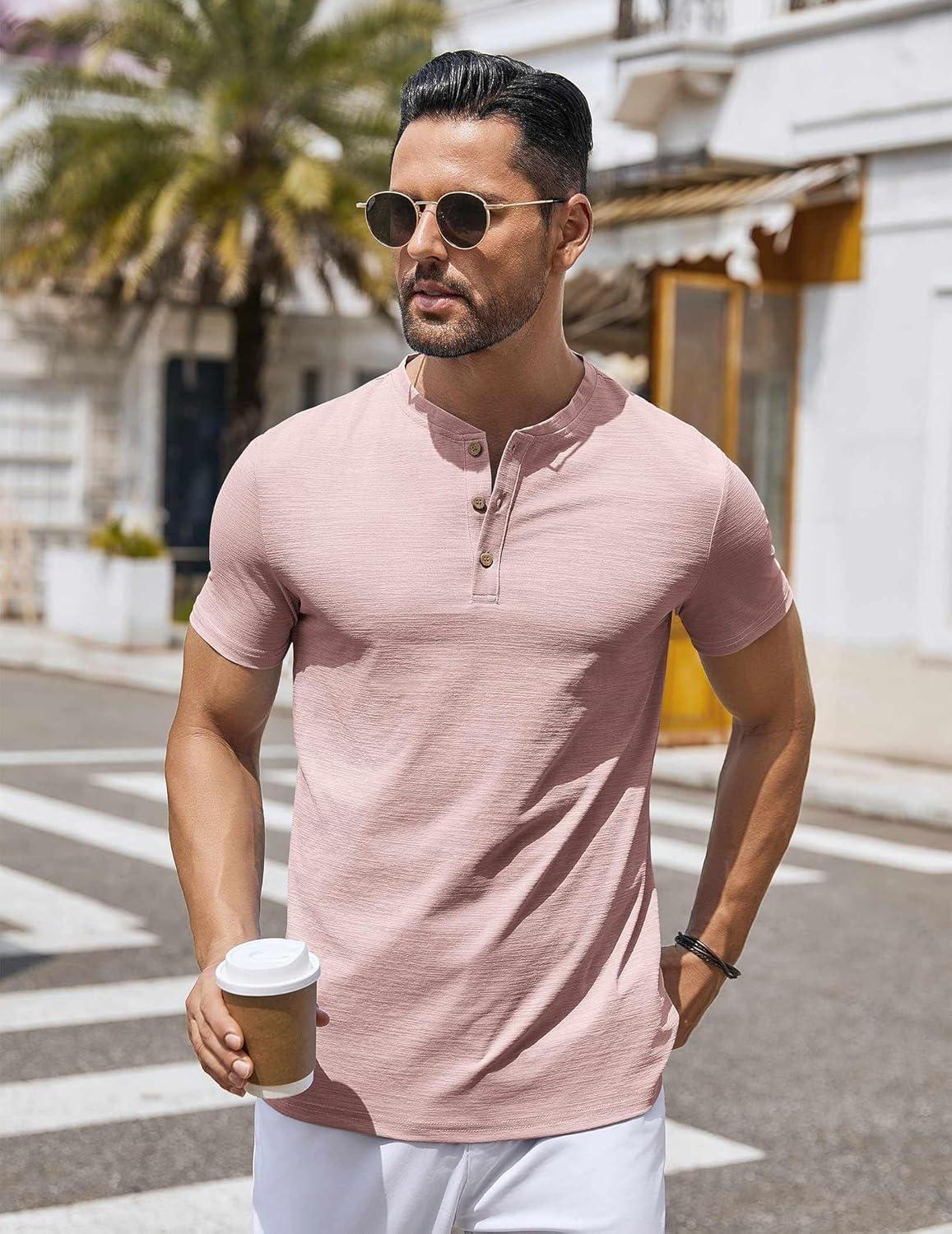 COOFANDY Mens Henley Shirts Short Sleeve Casual Button Down Shirts Lightweight Summer Basic Tee(Pink)
