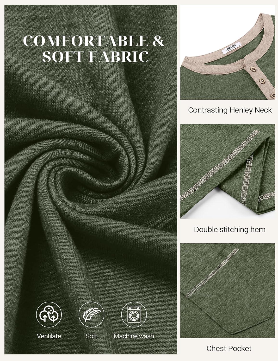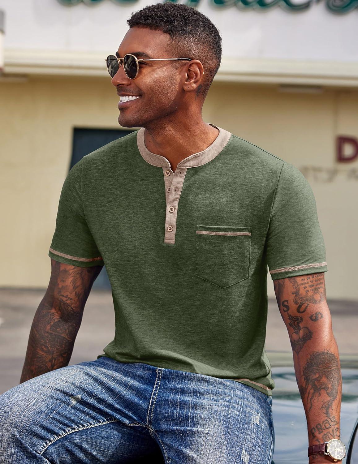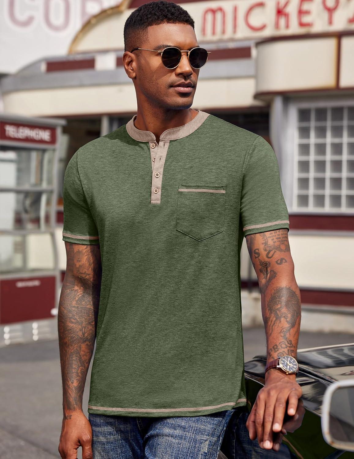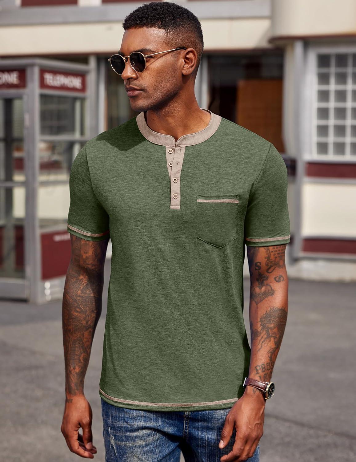 COOFANDY Mens Henley Shirts Short Sleeve Casual Button T-Shirts Basic Tee Shirts Summer Vintage T Shirts with Pocket(02 Army Green)