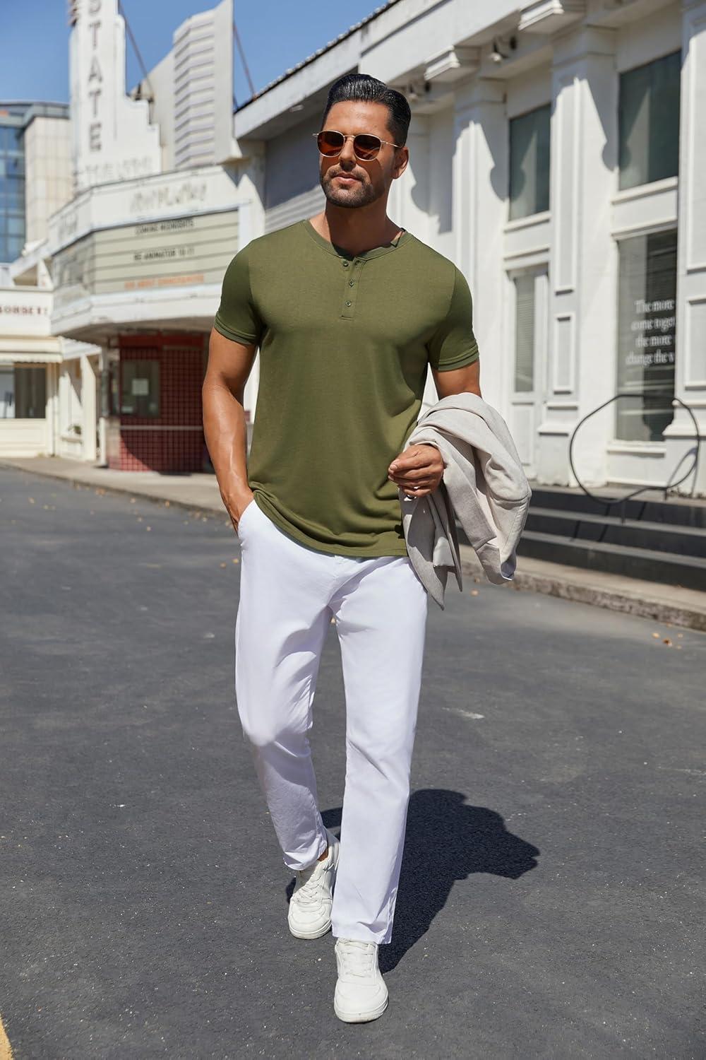 COOFANDY Men’s Henley Shirts Short Sleeve Casual Summer Basic Tee Solid Button T-Shirts(Army Green)