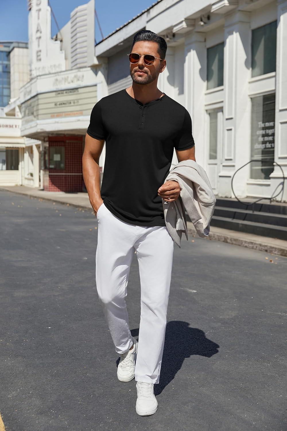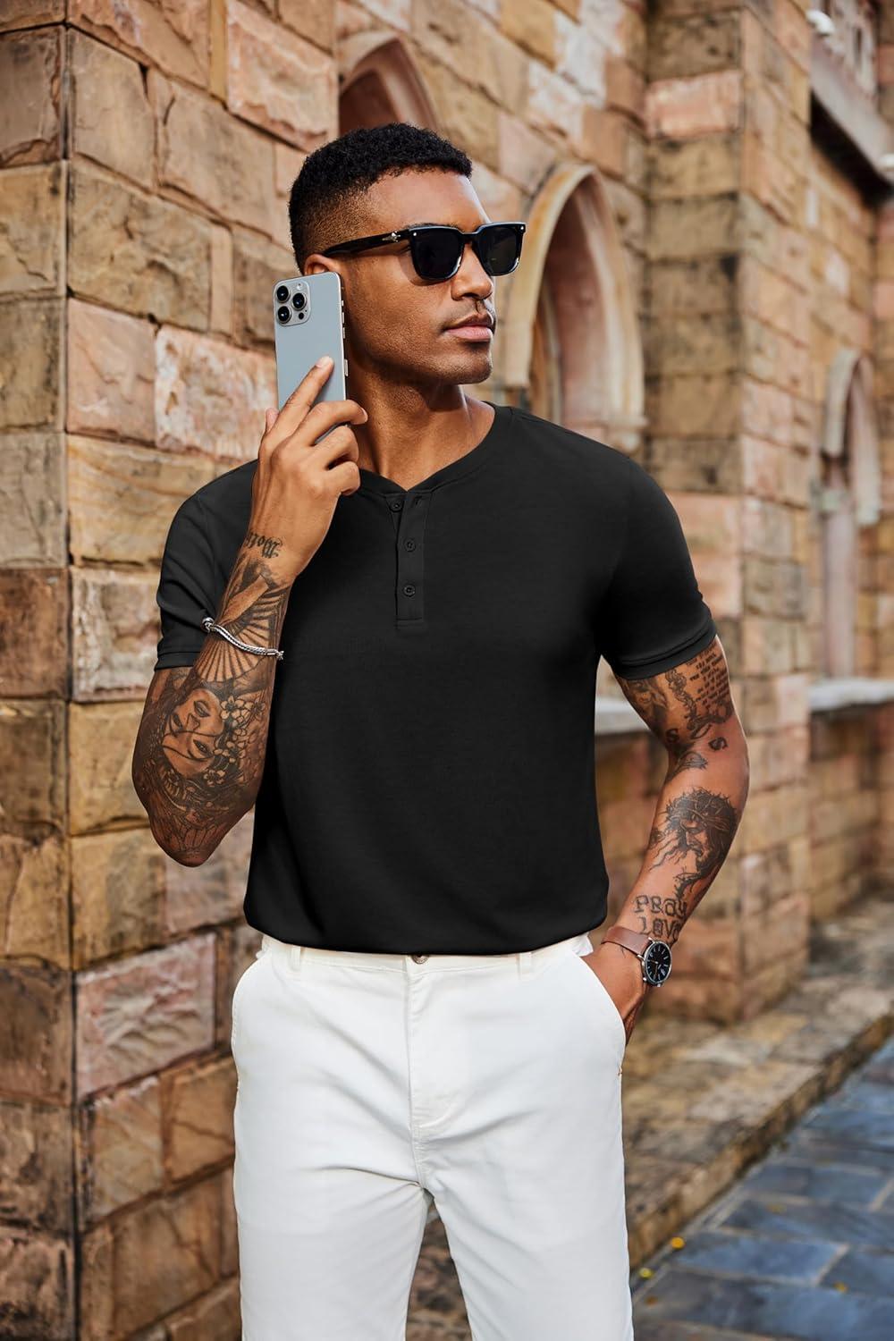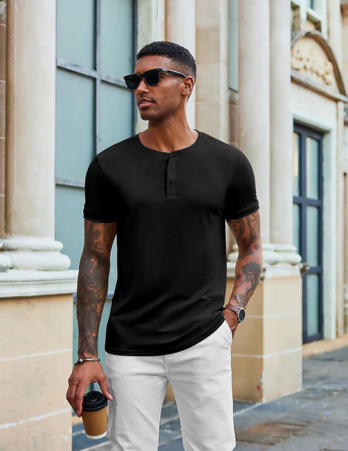 COOFANDY Men’s Henley Shirts Short Sleeve Casual Summer Basic Tee Solid Button T-Shirts(Black)