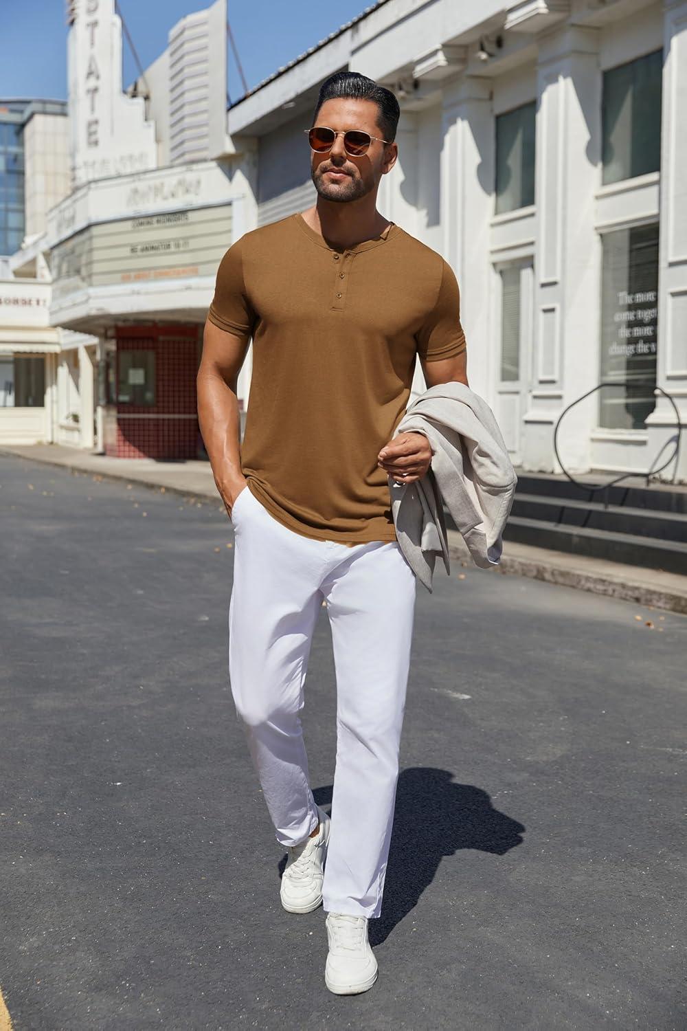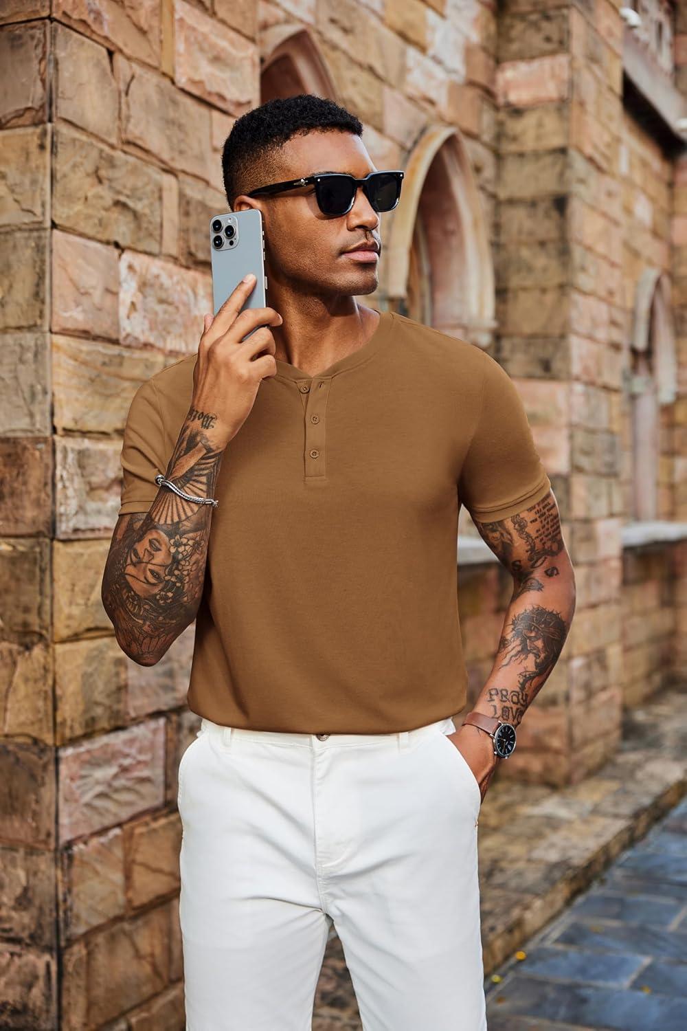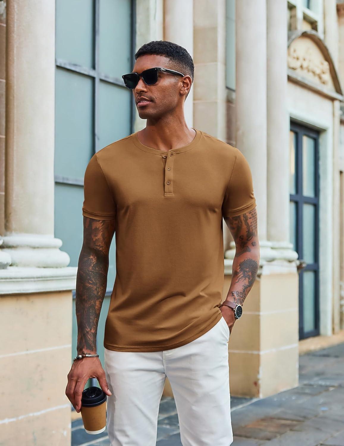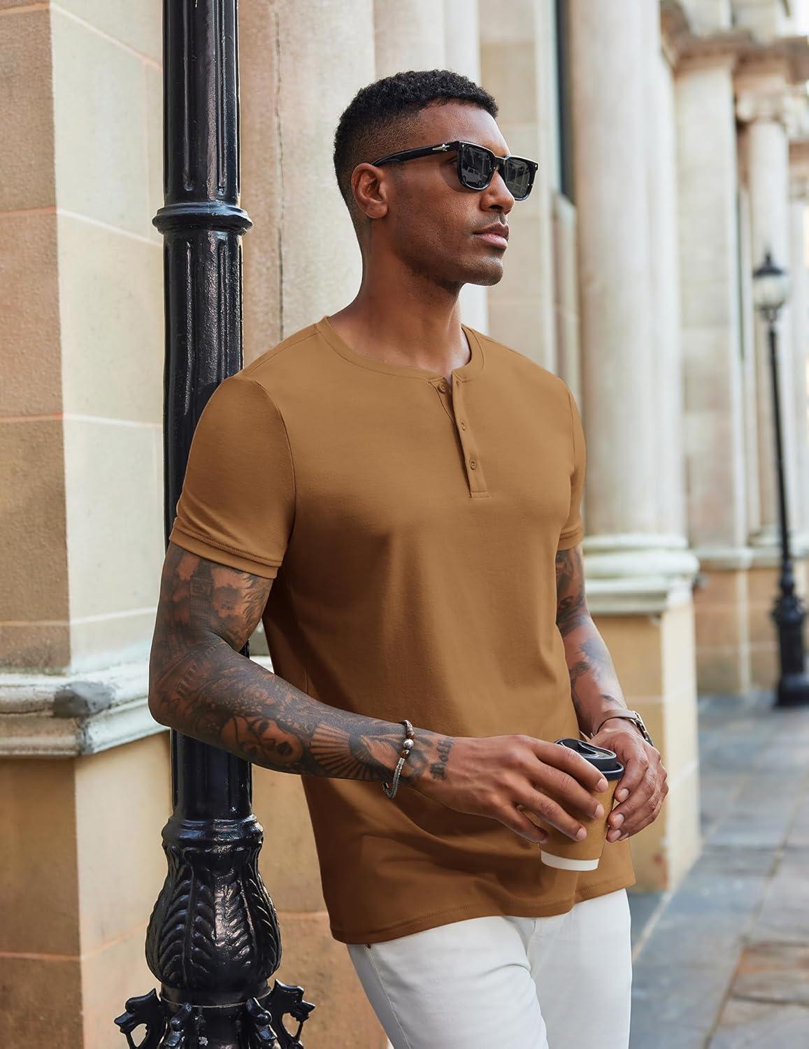 COOFANDY Men’s Henley Shirts Short Sleeve Casual Summer Basic Tee Solid Button T-Shirts(Light Brown)