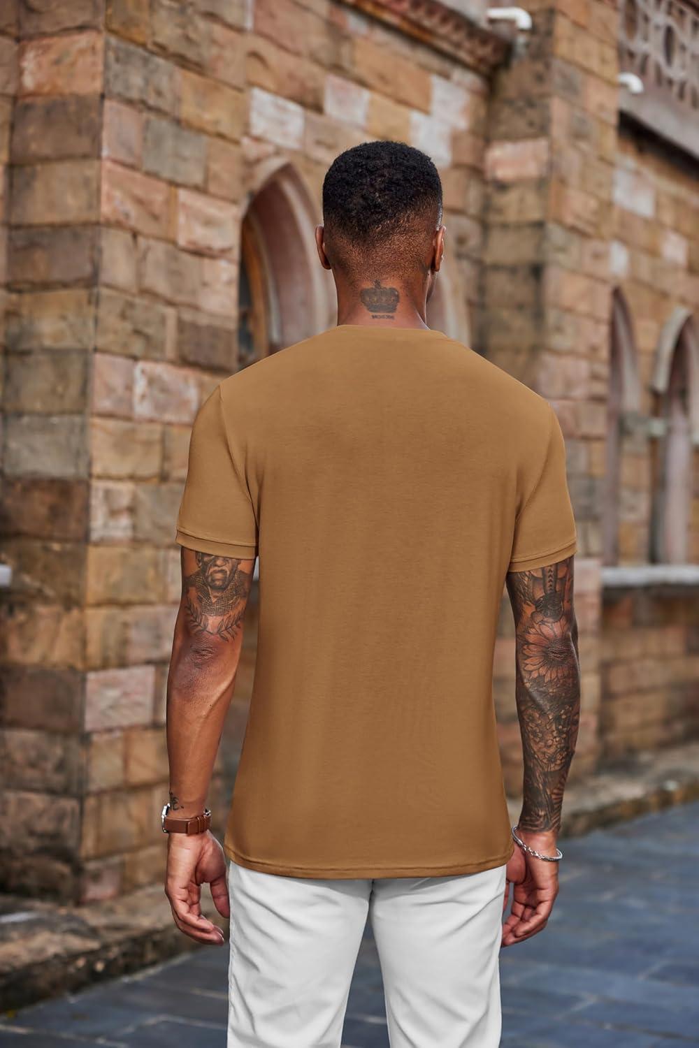 COOFANDY Men's Henley Shirts Short Sleeve Casual Summer Basic Tee Solid Button T-Shirts(Light Brown)