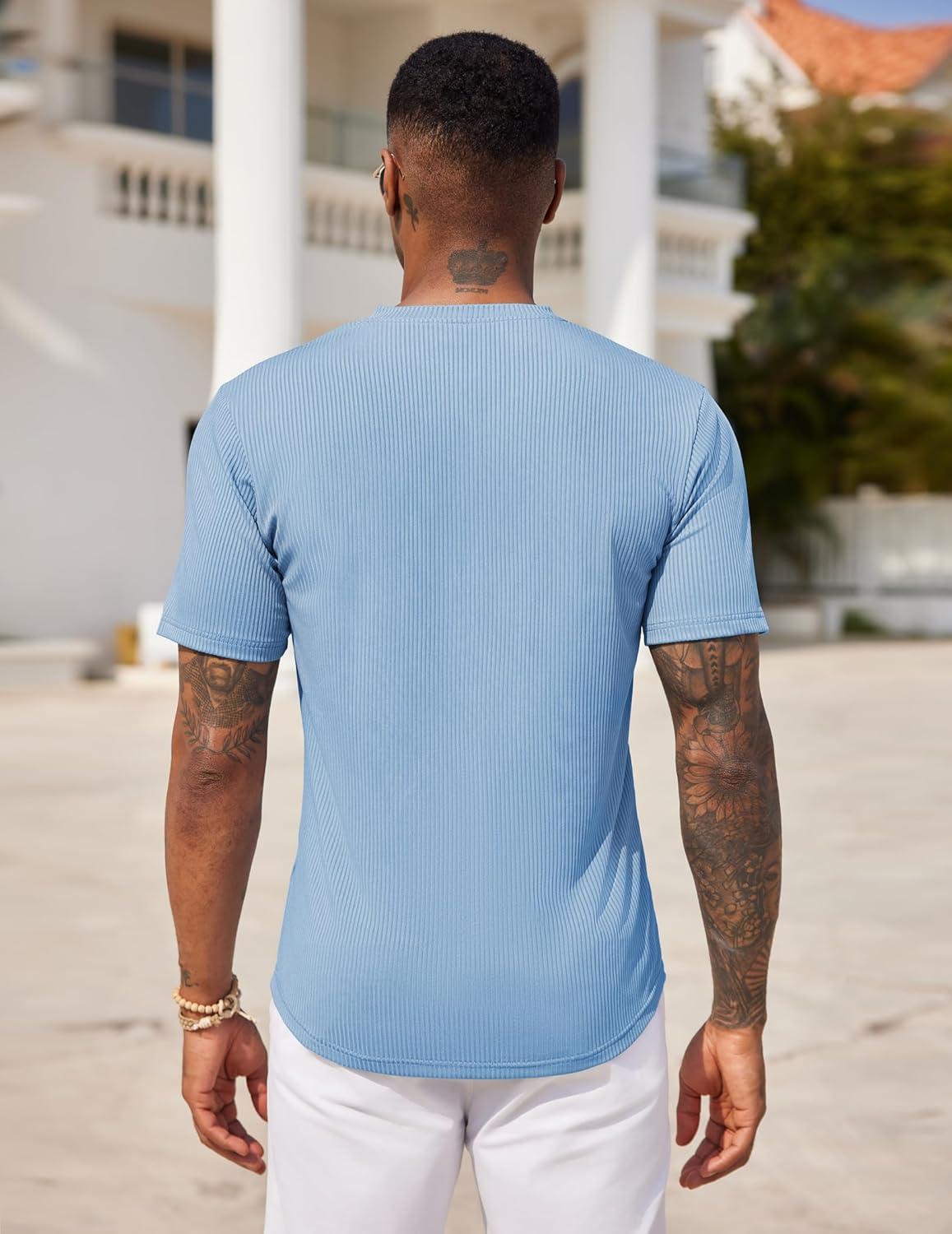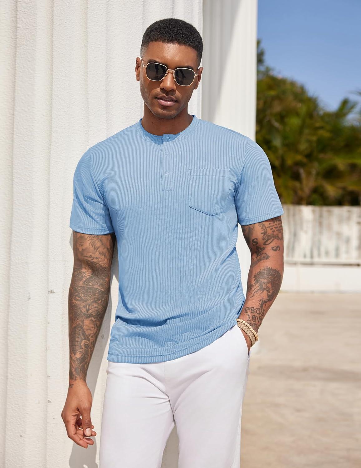 COOFANDY Mens Henley Shirts Short Sleeve Tshirt Basic Button Tees Summer Ribbed Pocket T Shirt Casual Stretch Tops(Light Blue)