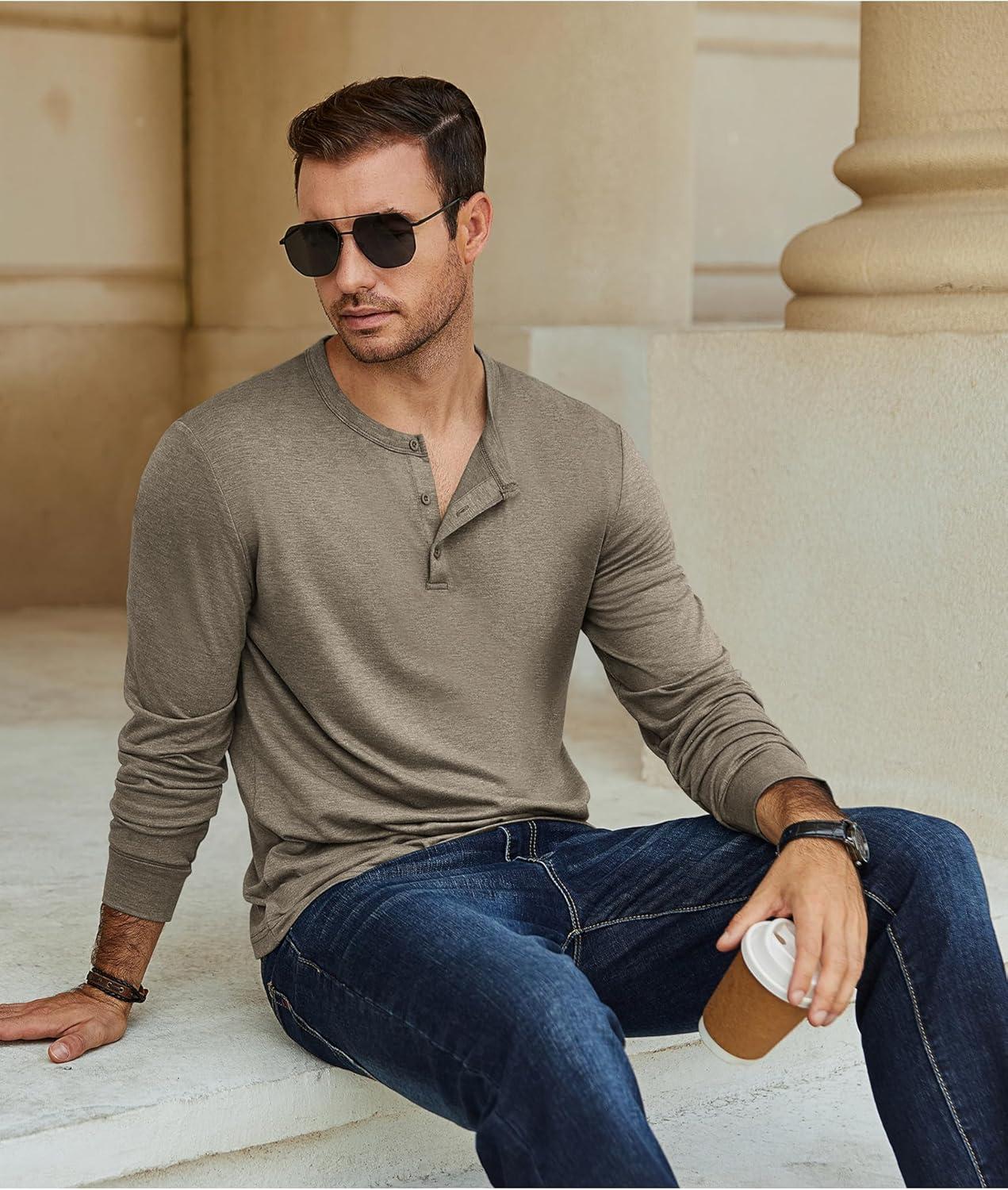 COOFANDY Men’s Henley T-Shirt Long Sleeve Casual Lightweight Pullover Shirts Soft Stretch Basic Tees Fall Tops(Khaki)