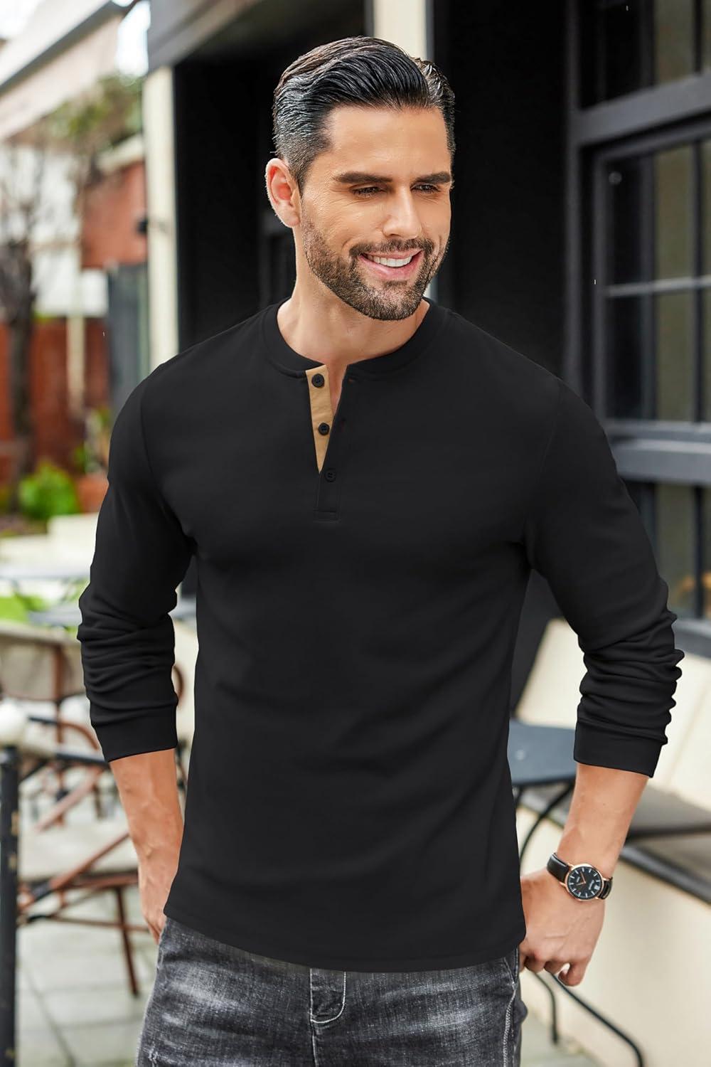 Get up to 50% off on COOFANDY Men’s Henley T-Shirts Long Sleeve Pullover Shirt Casual Heavyweight Button Shirts Basic Tees(Black & Khaki) styles during our spring sale event.