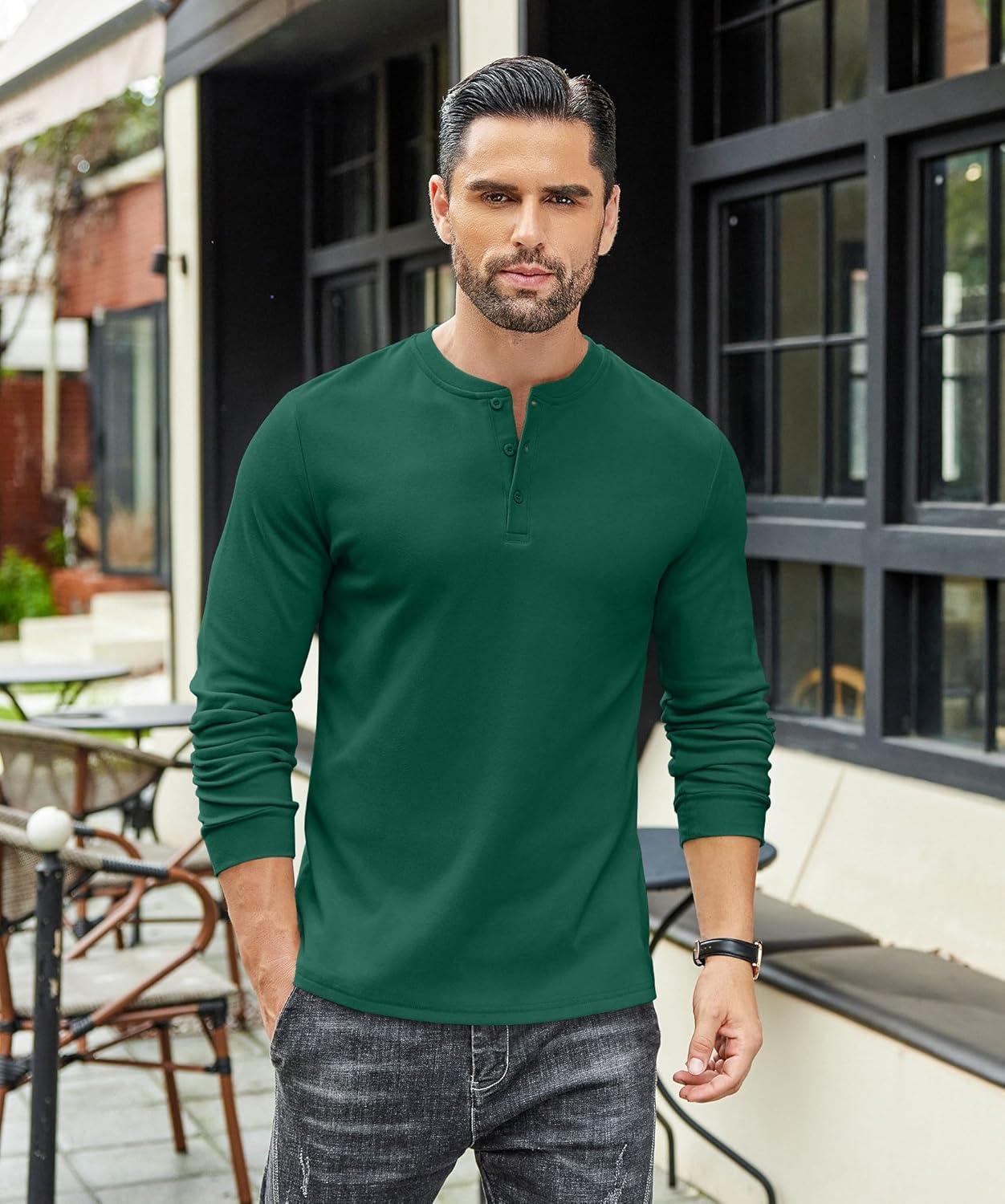 COOFANDY Men’s Henley T-Shirts Long Sleeve Pullover Shirt Casual Heavyweight Button Shirts Basic Tees(Dark Green)