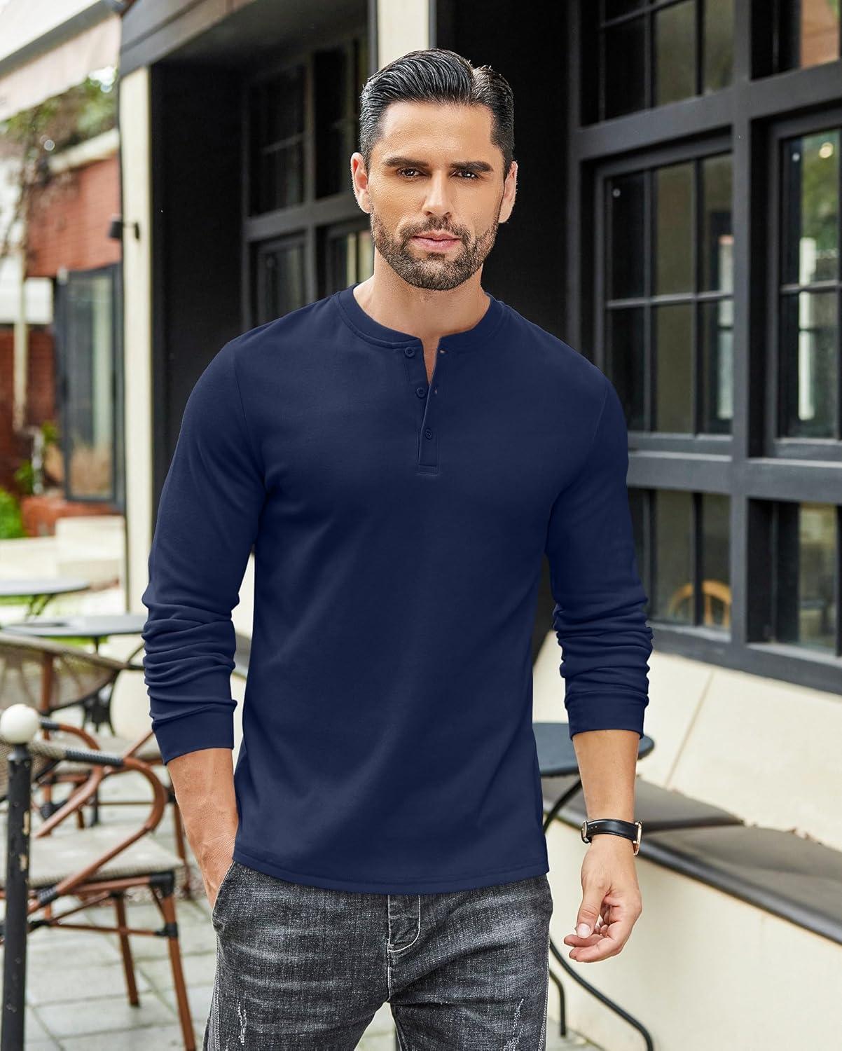 COOFANDY Men's Henley T-Shirts Long Sleeve Pullover Shirt Casual Heavyweight Button Shirts Basic Tees(Navy Blue)