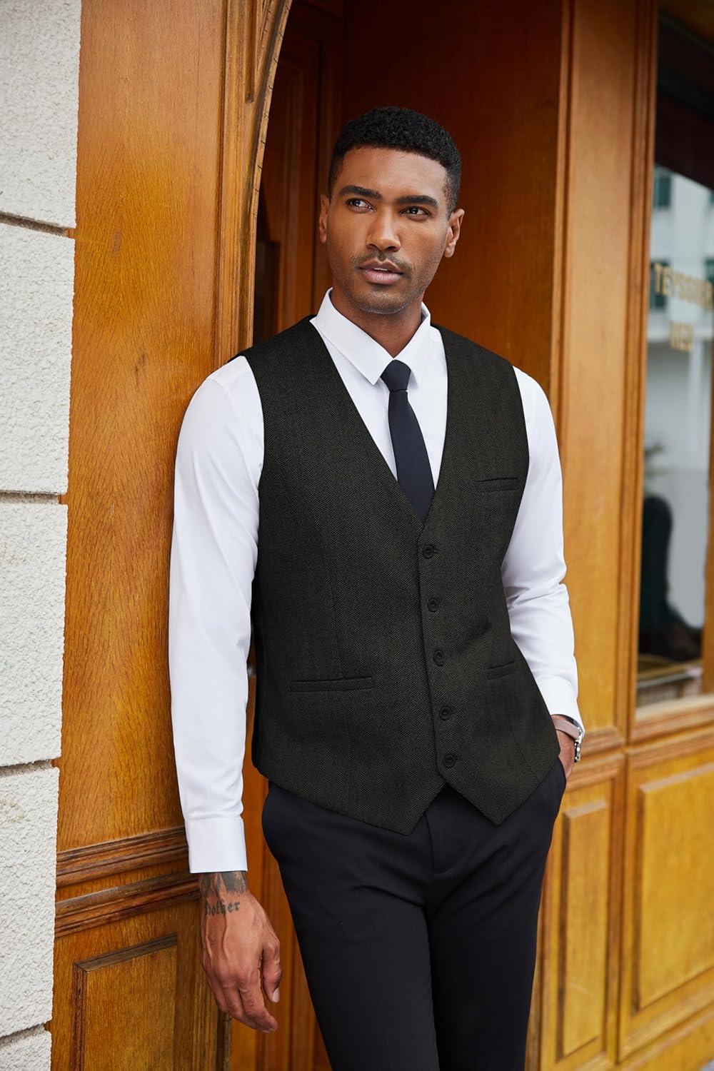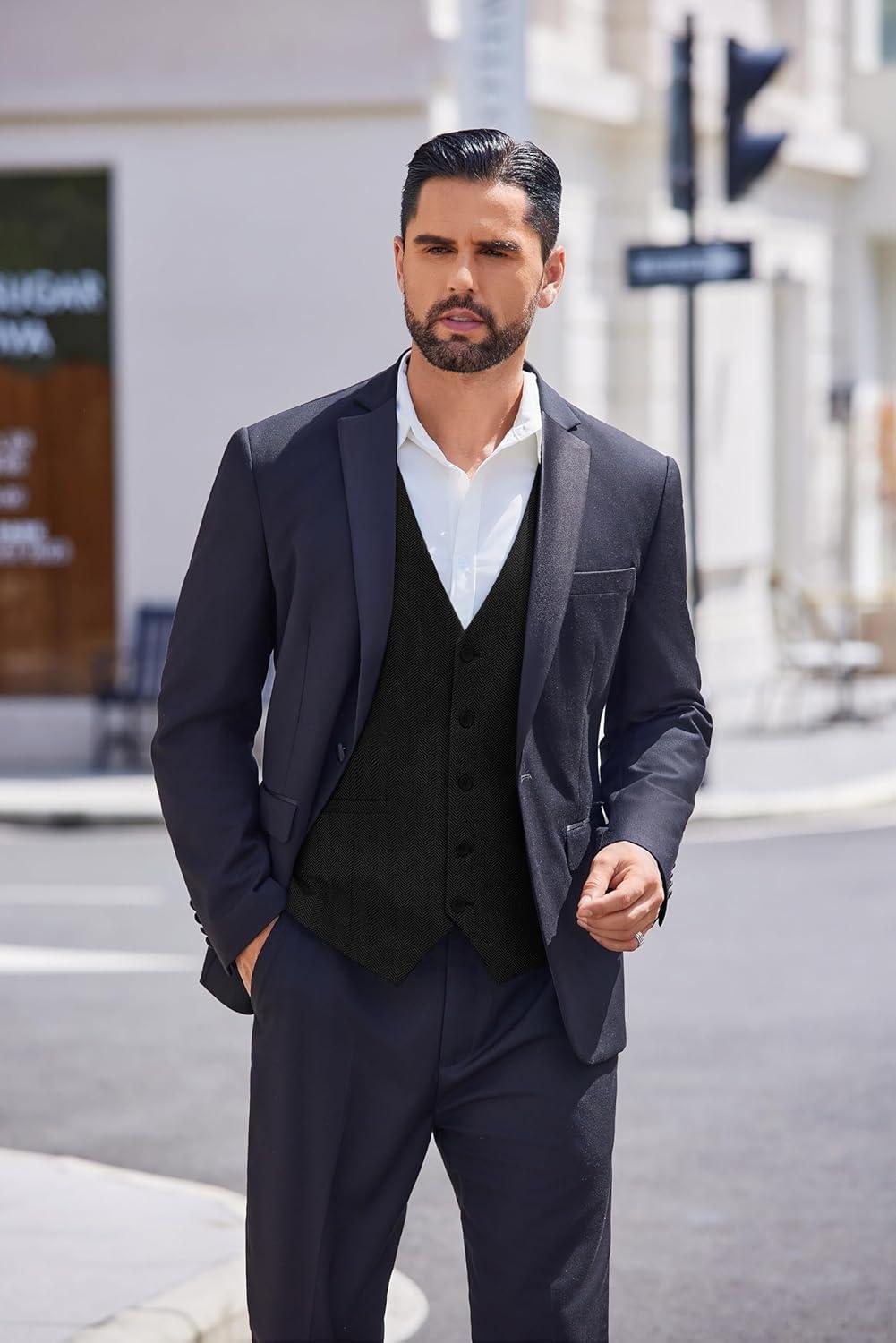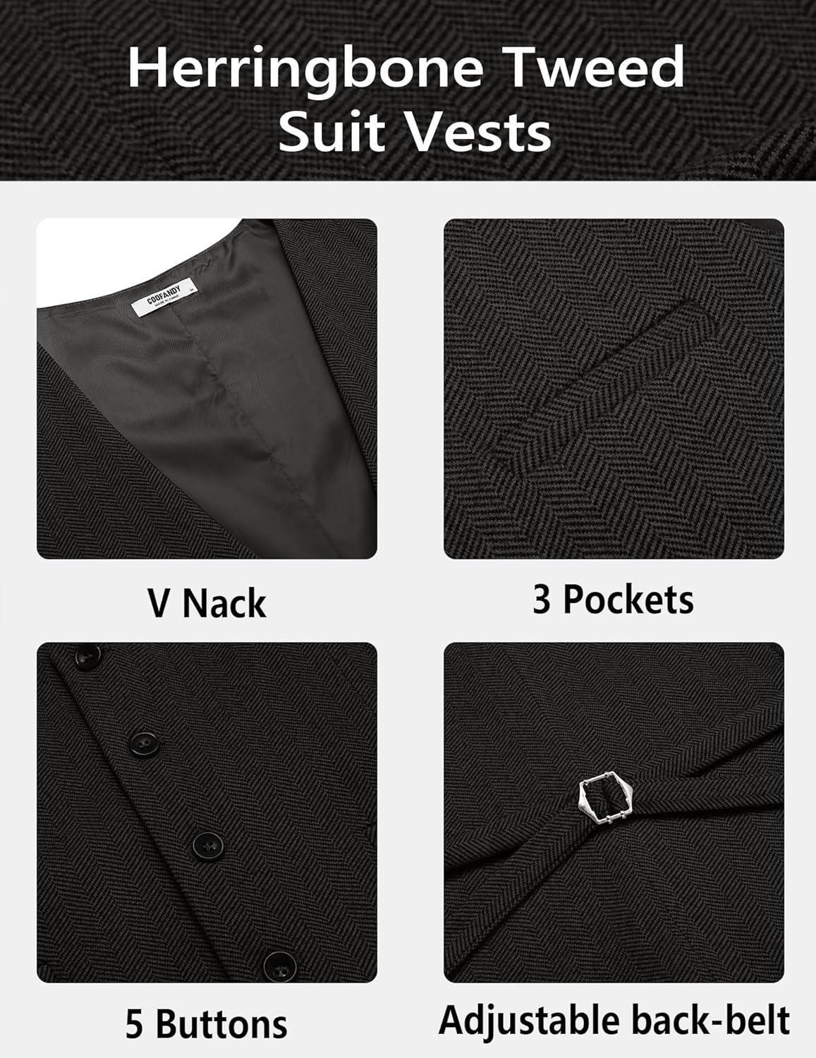 COOFANDY Men's Herringbone Tweed Suit Vests Slim Fit Waistcoat Casual Business Dress Vest(Black)