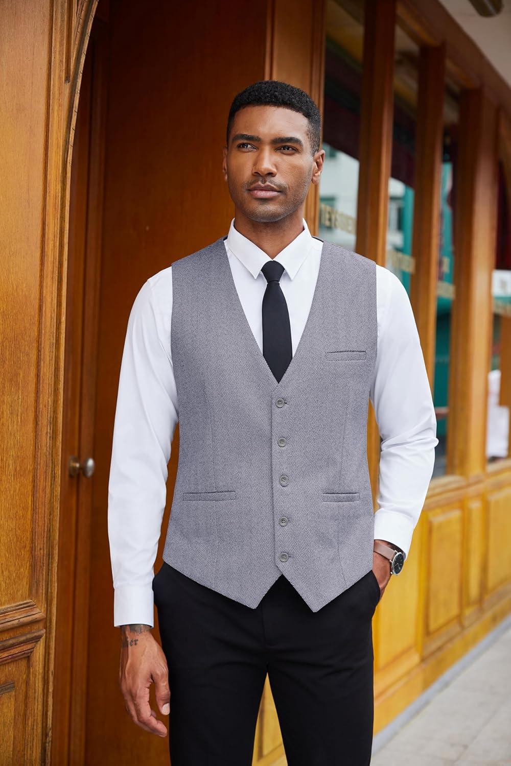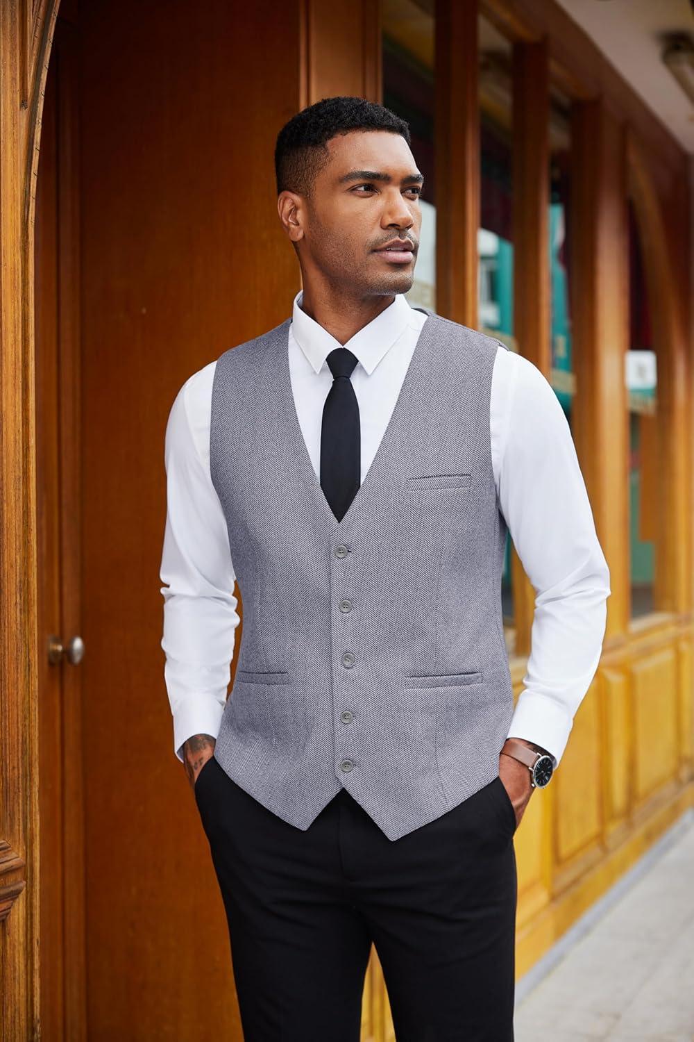 COOFANDY Men’s Herringbone Tweed Suit Vests Slim Fit Waistcoat Casual Business Dress Vest(Dark Grey)