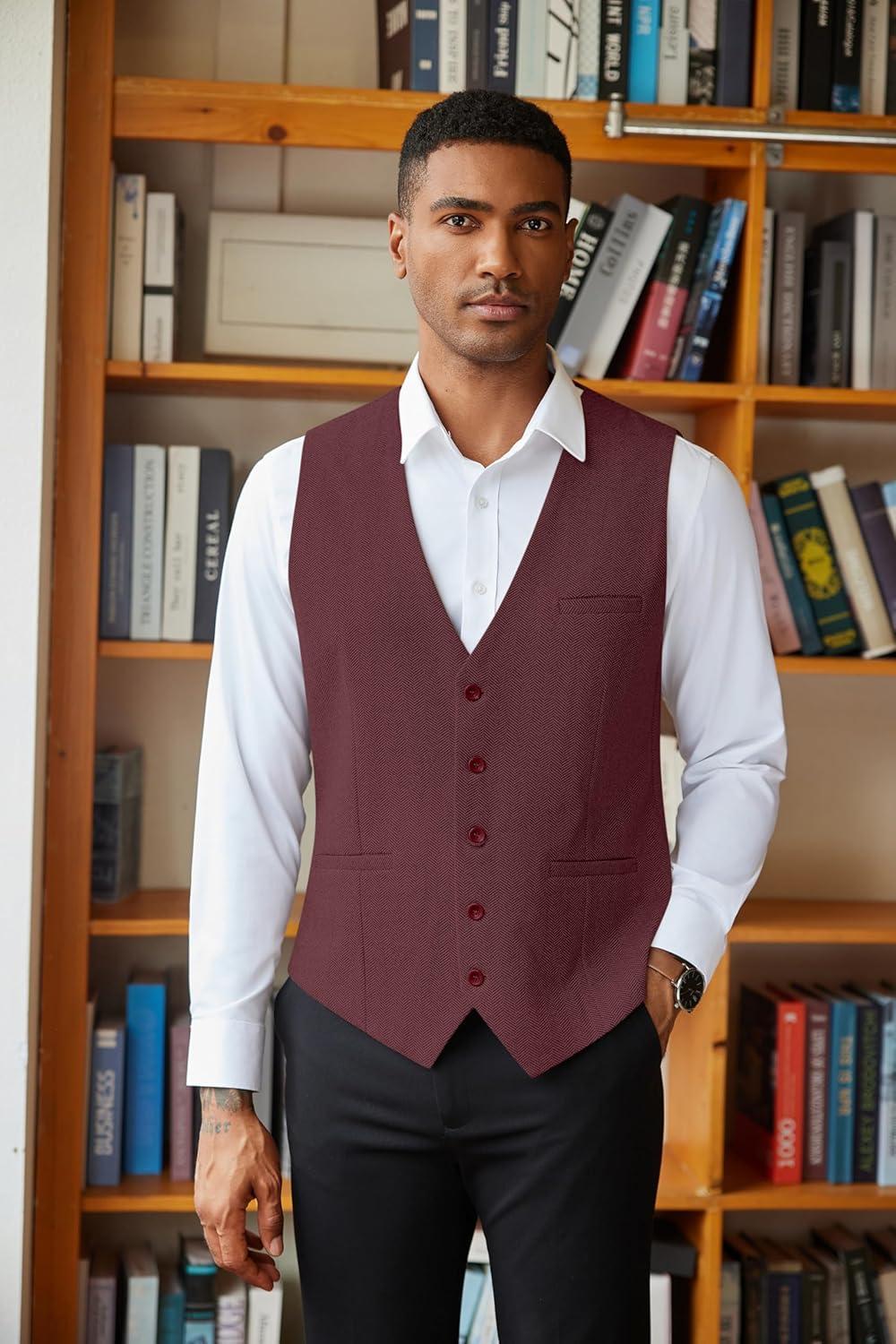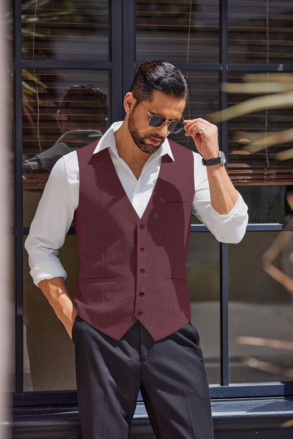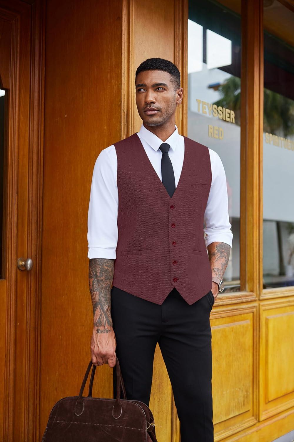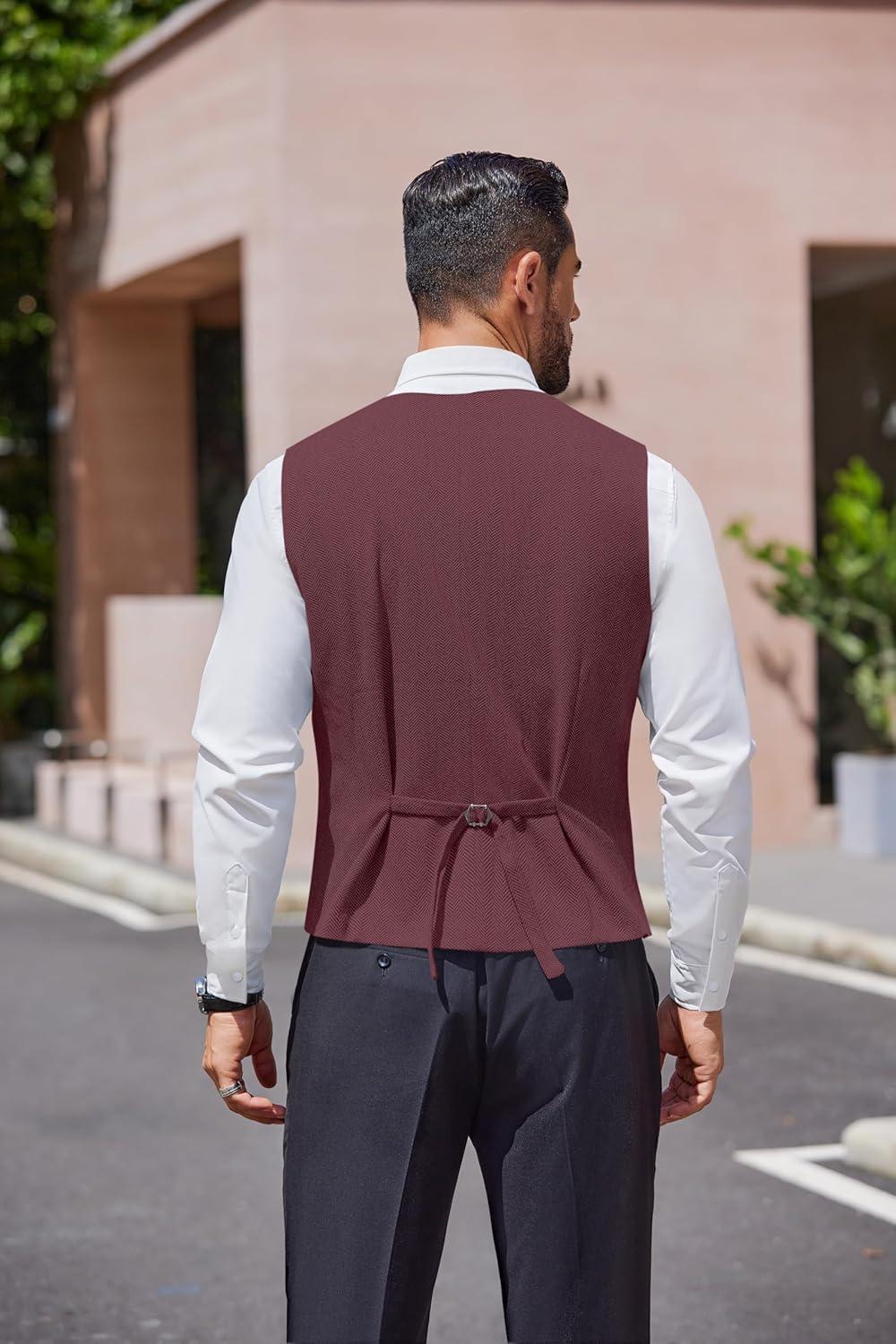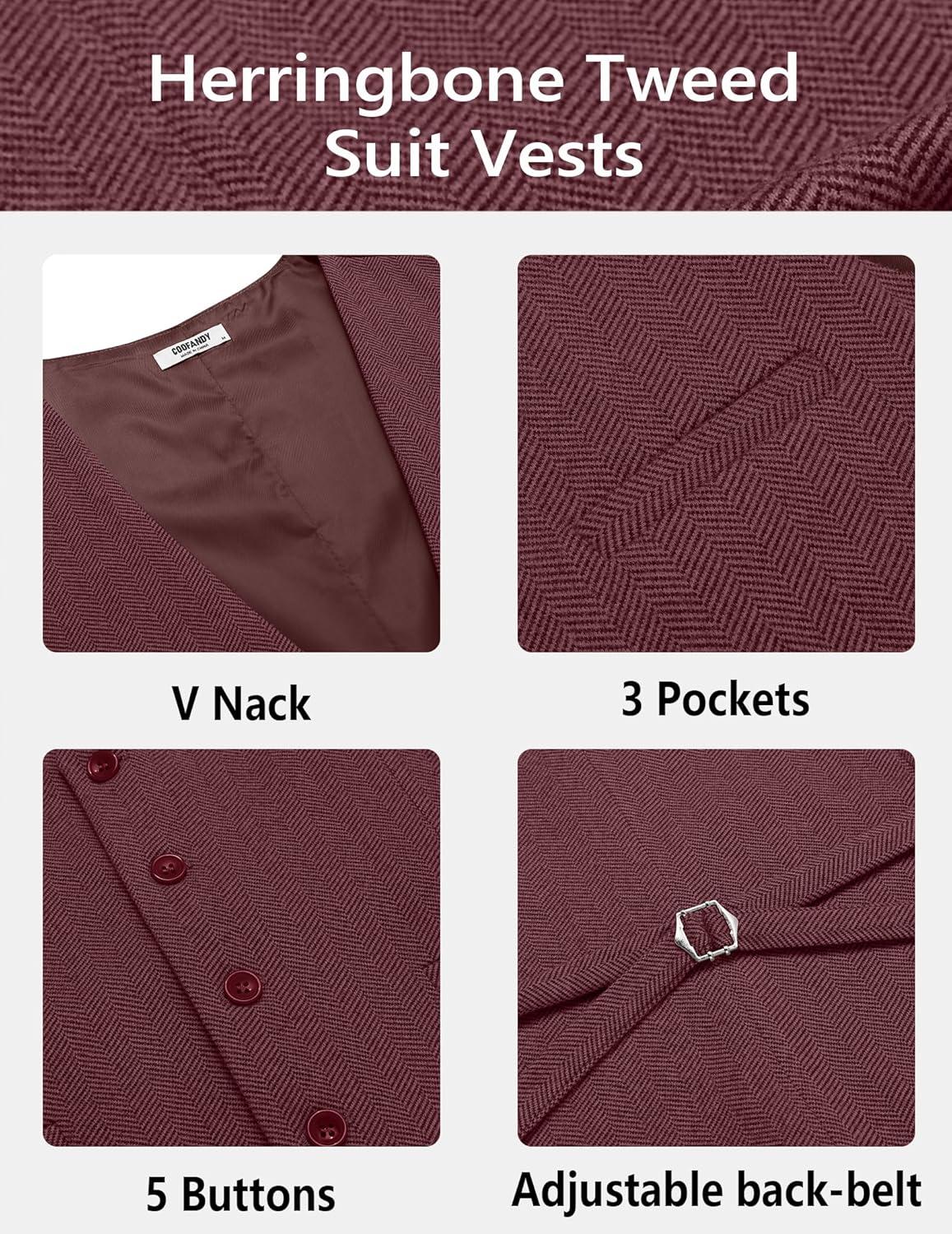 COOFANDY Men's Herringbone Tweed Suit Vests Slim Fit Waistcoat Casual Business Dress Vest(Red)