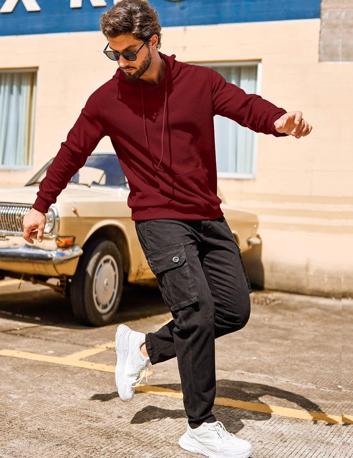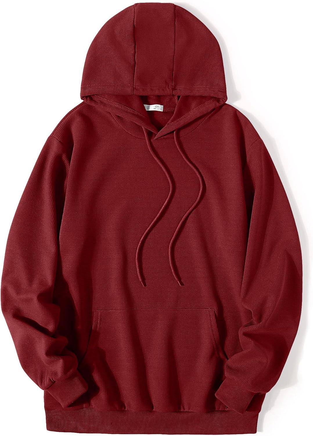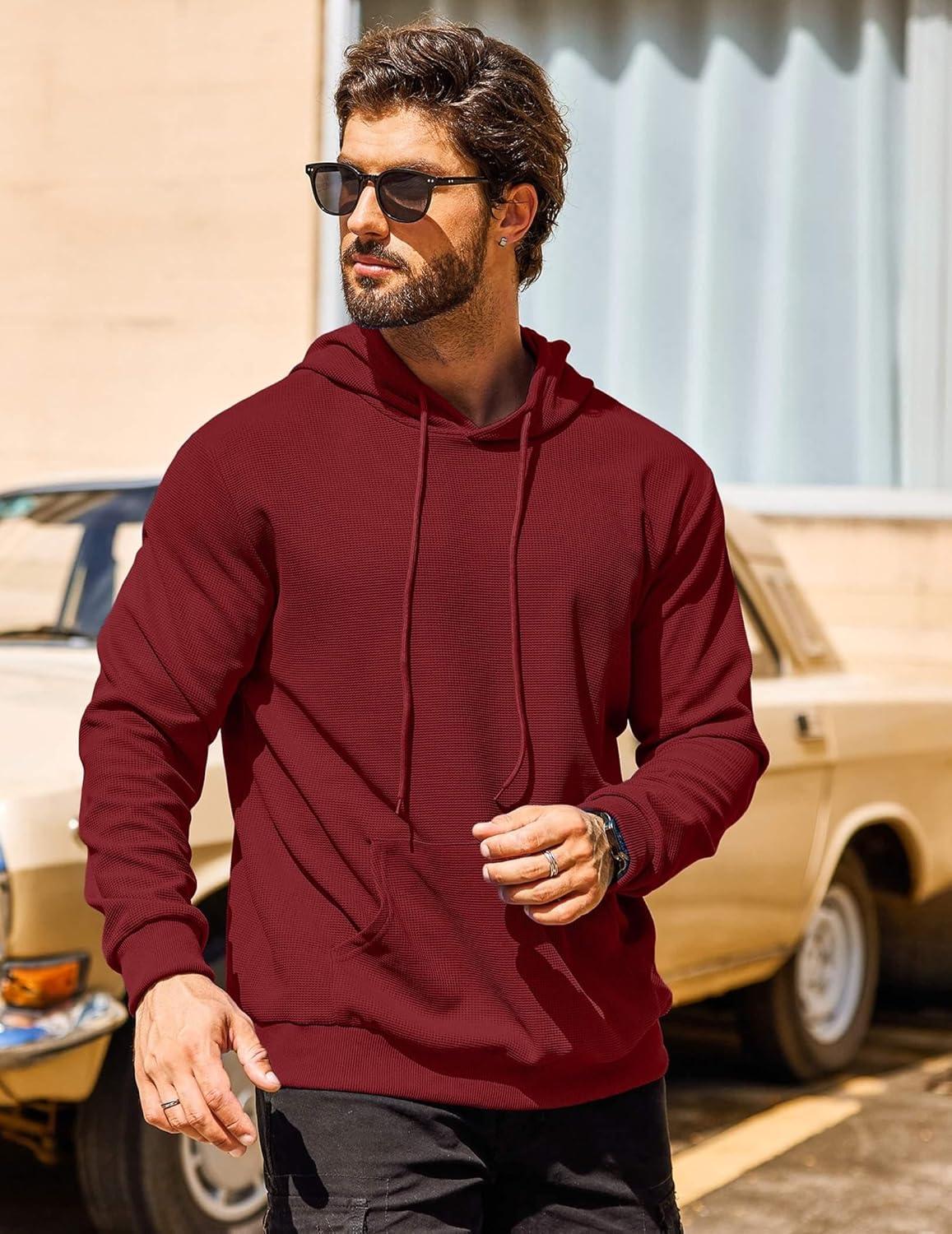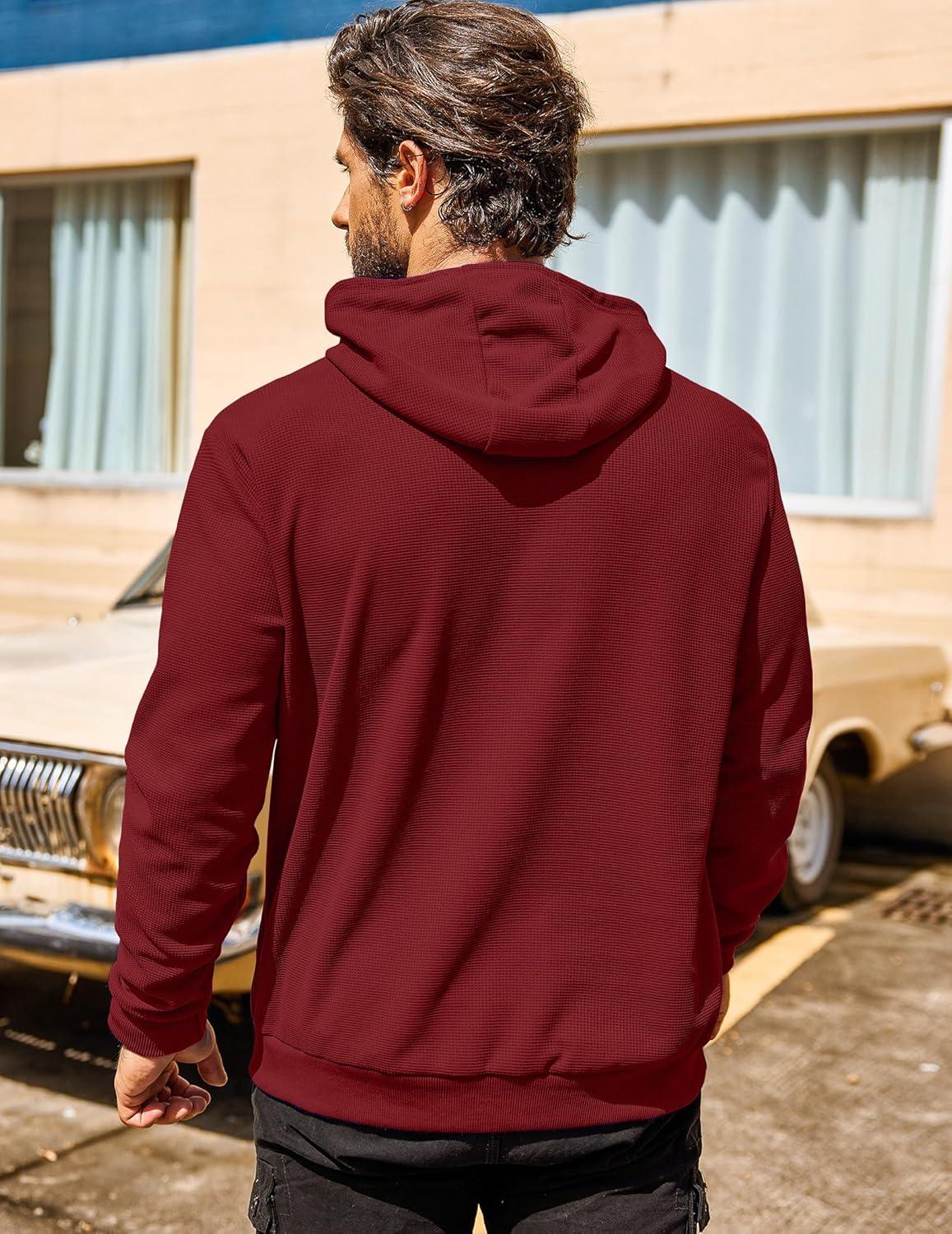 COOFANDY Men's Hooded Sweatshirts Long Sleeve Casual Pullover Hoodie Waffle Knit Sweatshirt with Pocket(Wine Red)