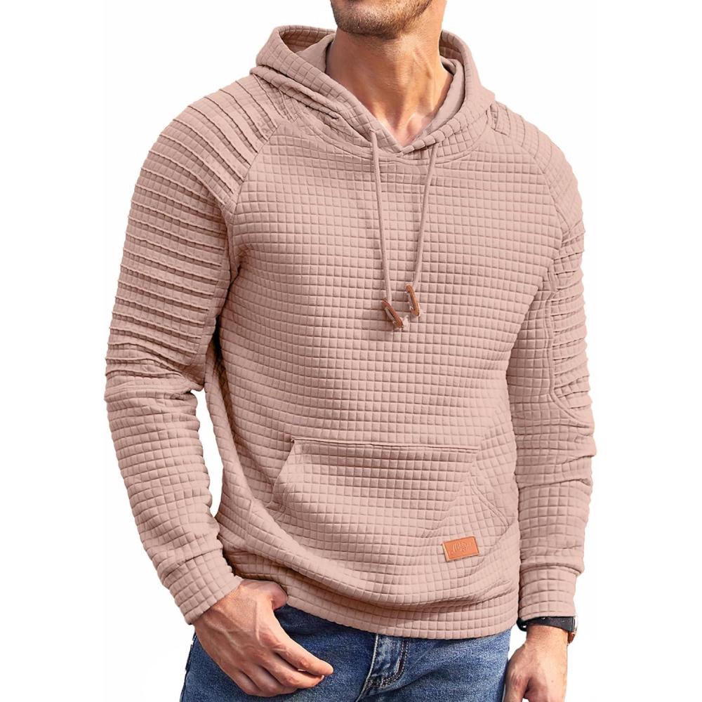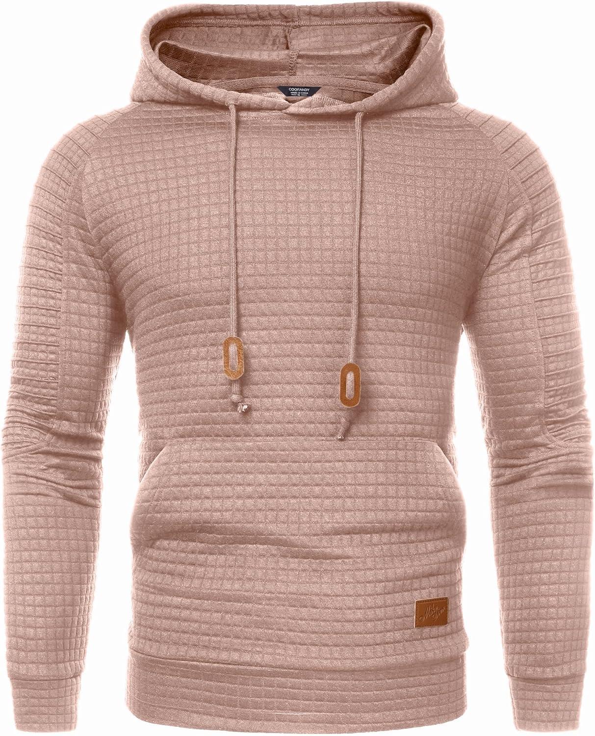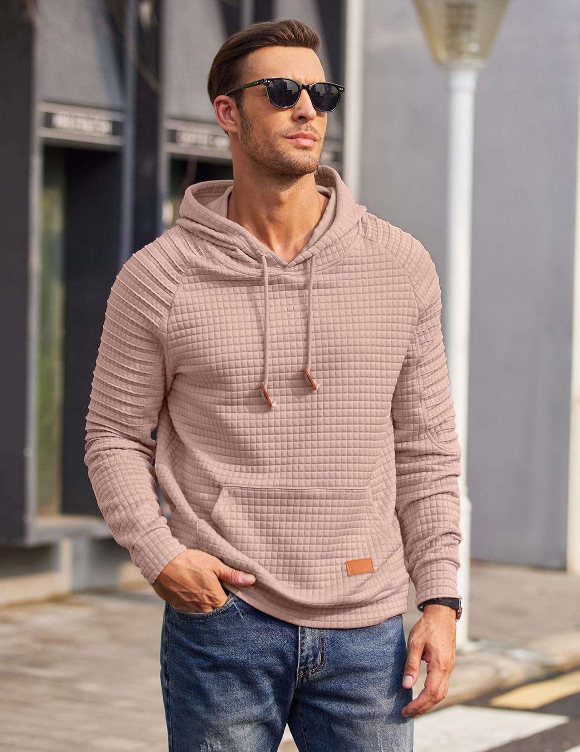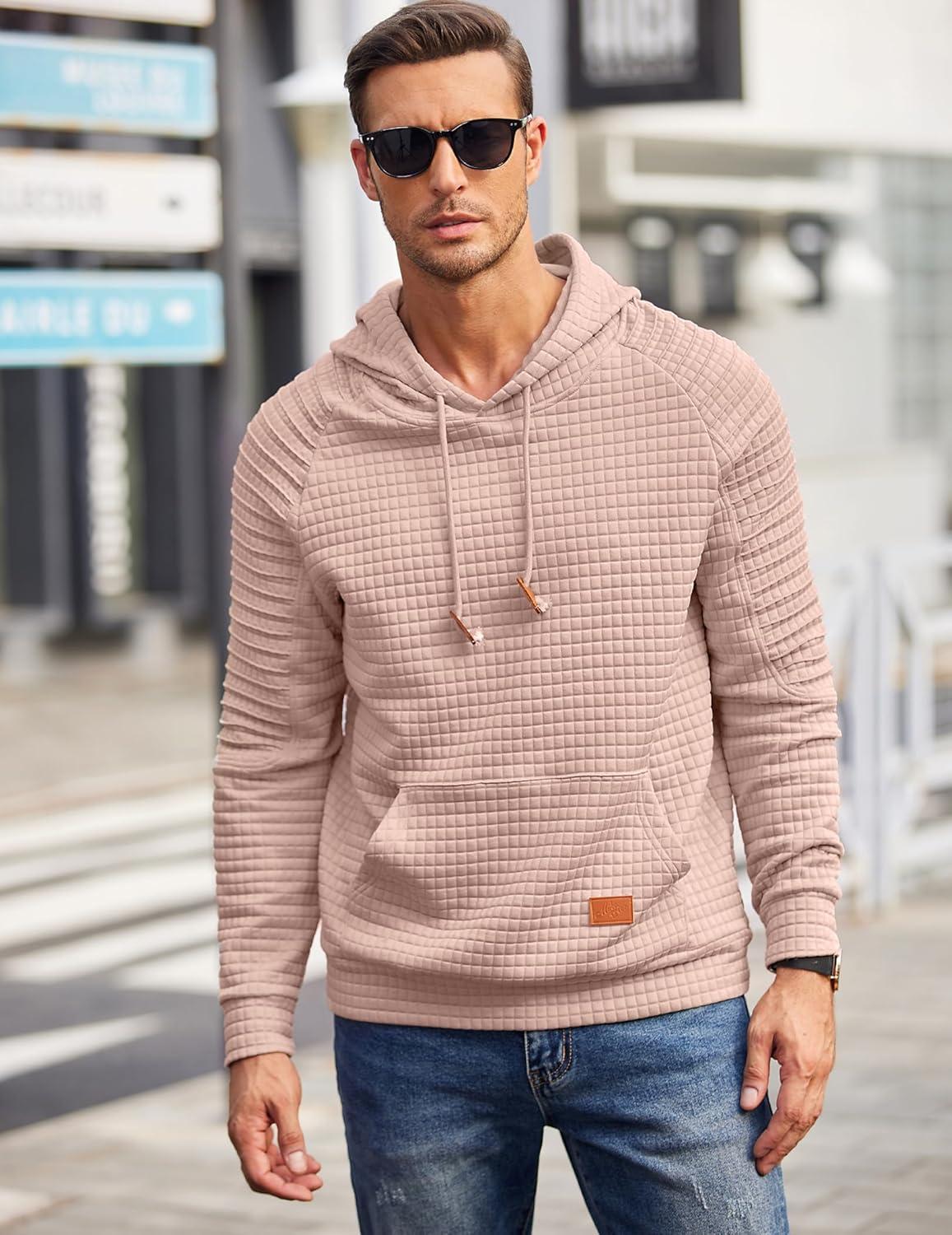 COOFANDY Mens Hoodies Pullover Casaul Long Sleeve Drawstring Waffle Knit Hooded Sweatshirt with Kanga Pocket(Light Pink)